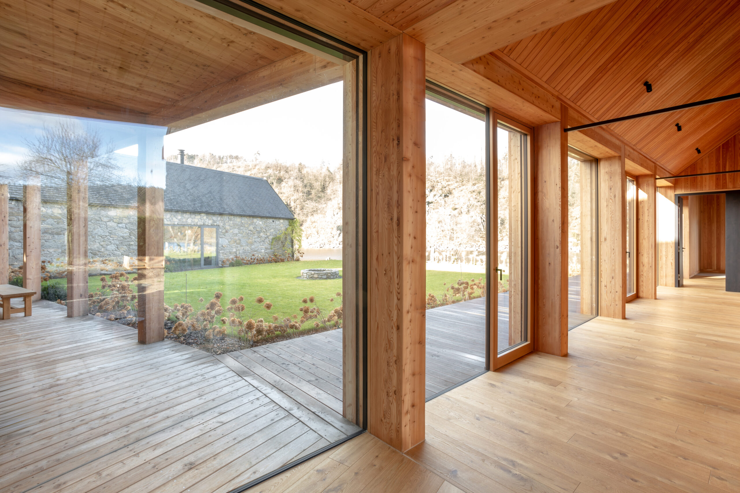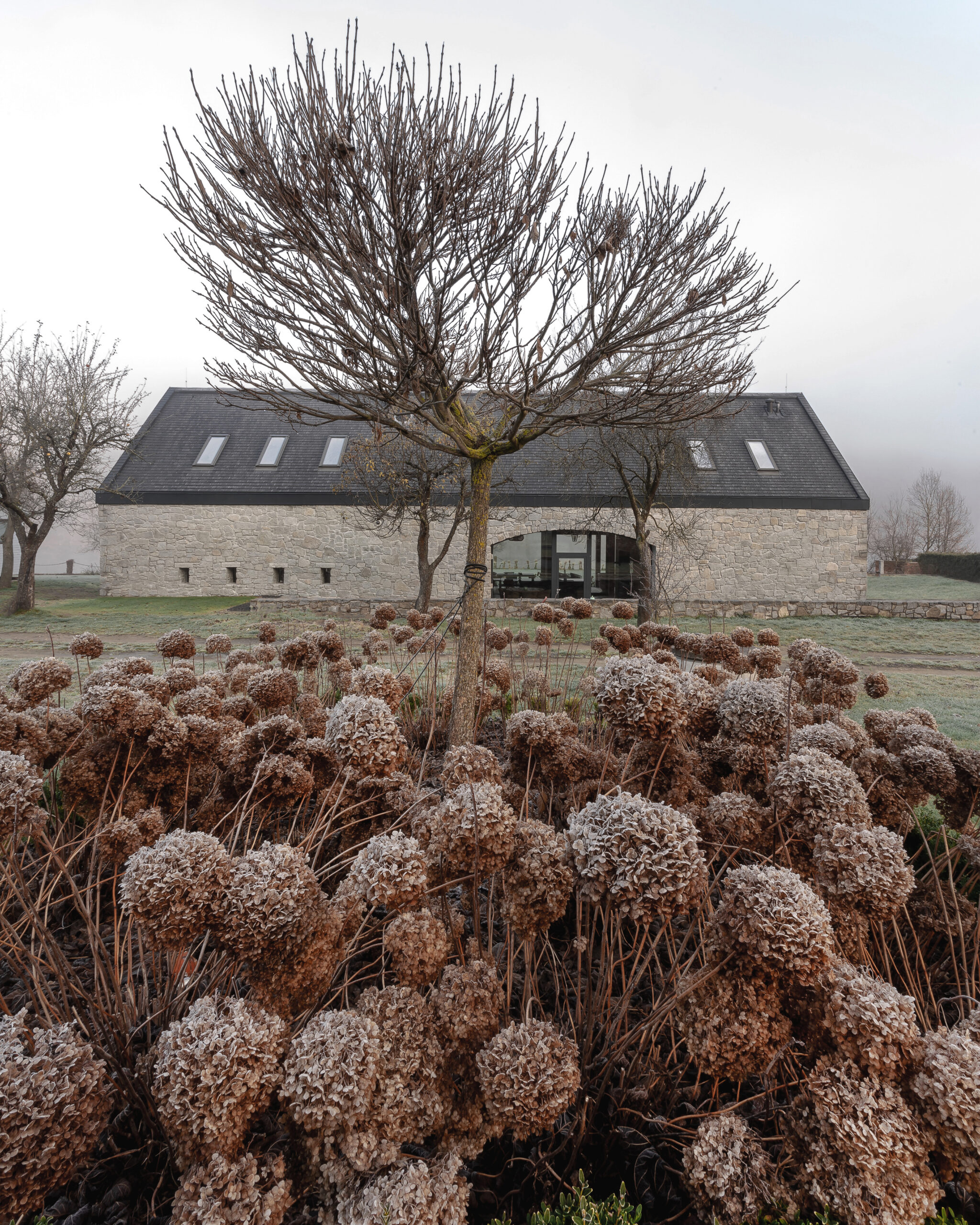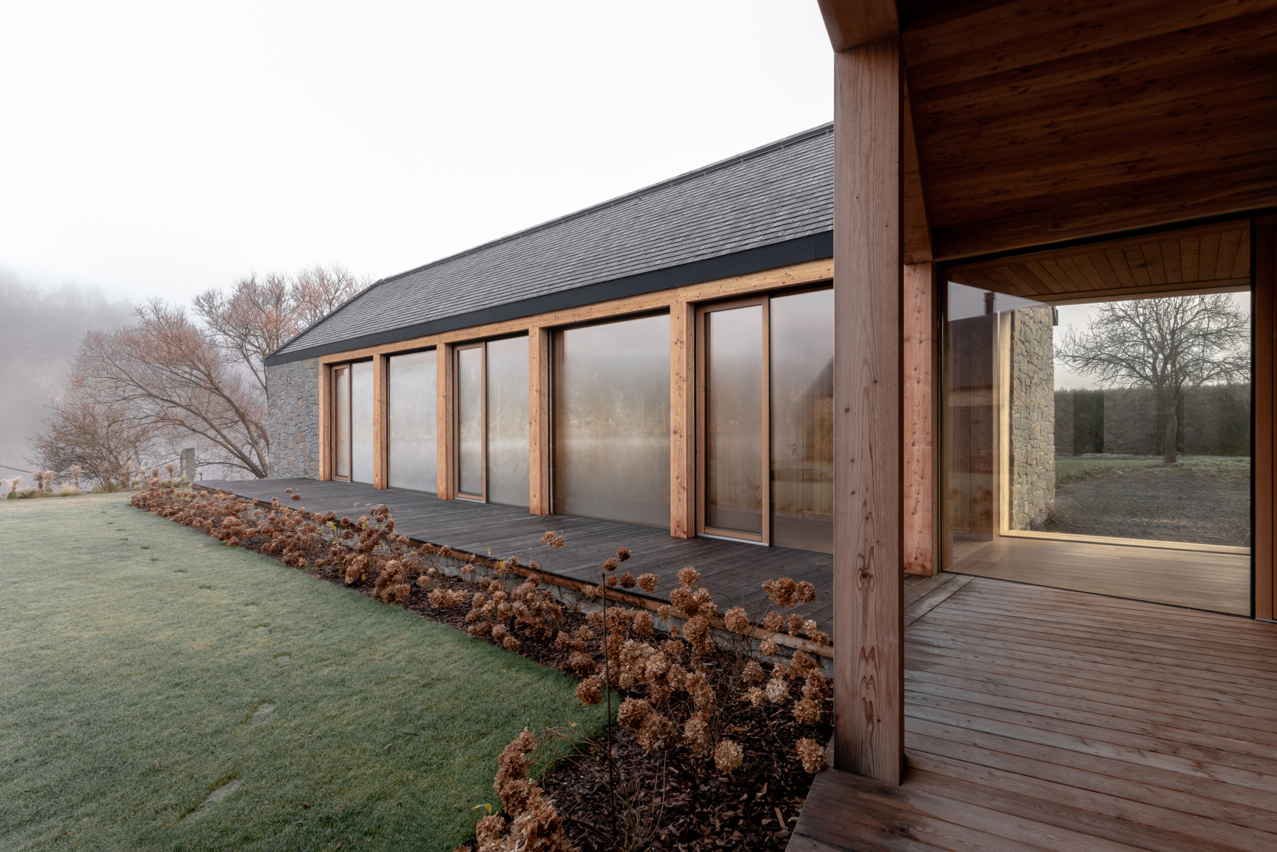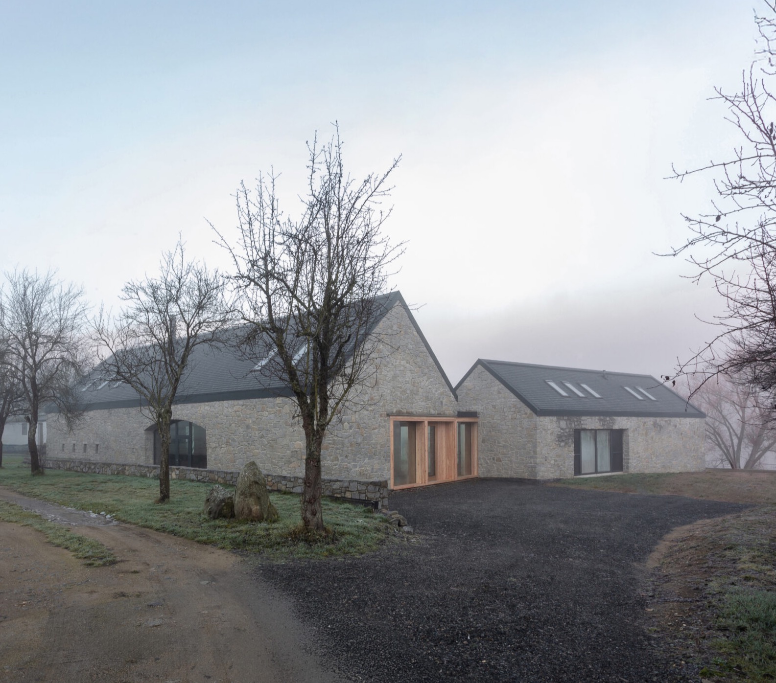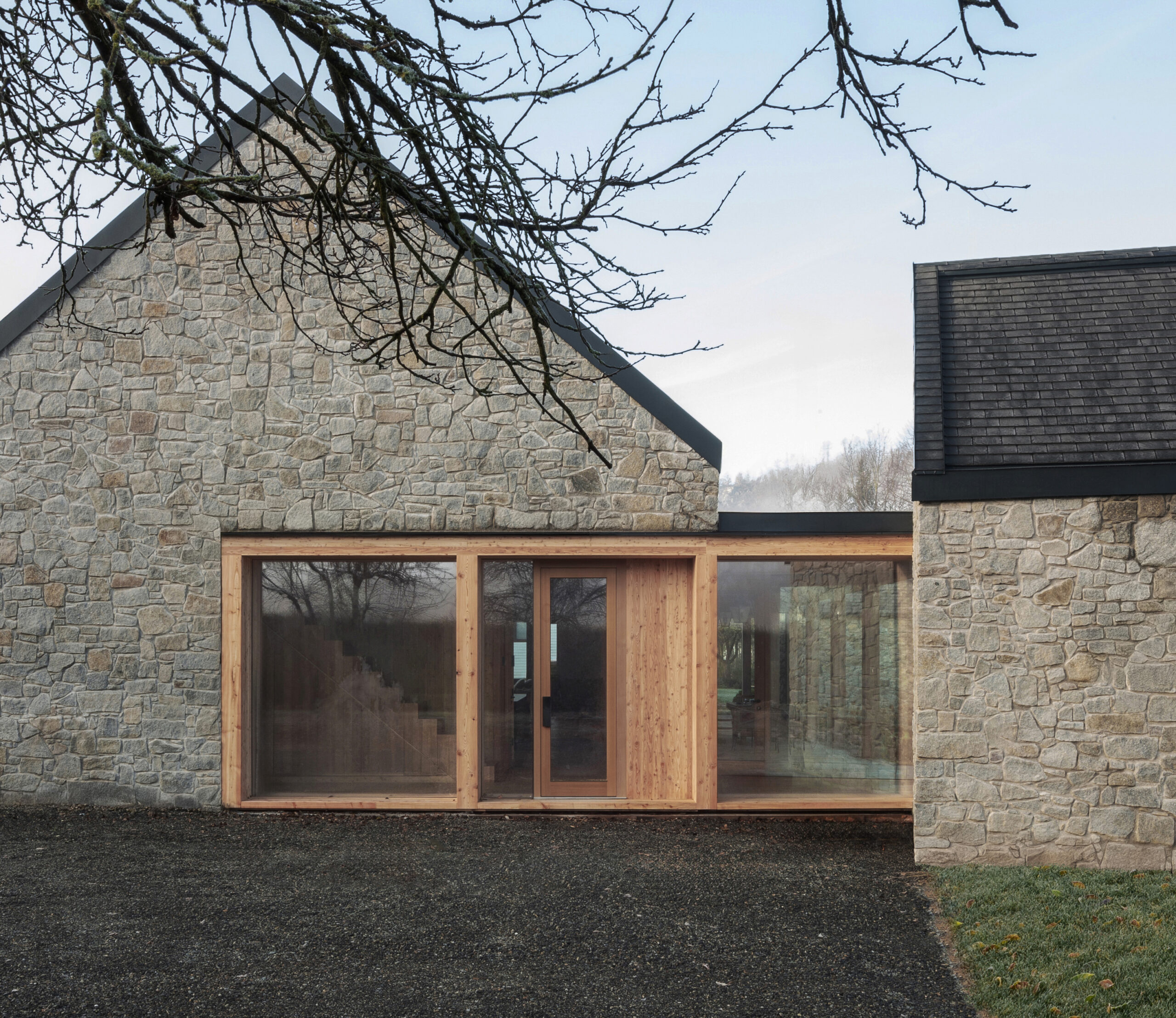 Ściany nowych budynków wykonane są z granitu pochodzącego z lokalnego kamieniołomu, identycznego jak ten użyty w istniejących murach. Dachy pokryto naturalnym łupek kamiennym, co nadaje całości elegancki i trwały charakter. Dodatkowo w projekcie zastosowano modrzewiowe drewno, które pojawia się na ramach okiennych, konstrukcji ganku oraz w wykończeniu dachu – podkreślając naturalny, wiejski charakter zabudowy.