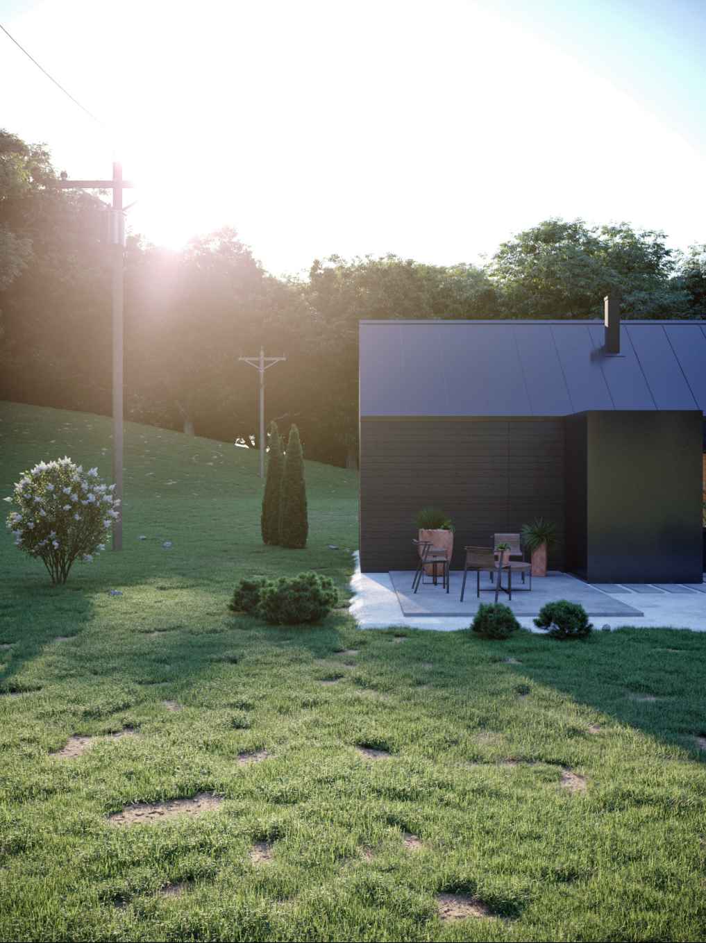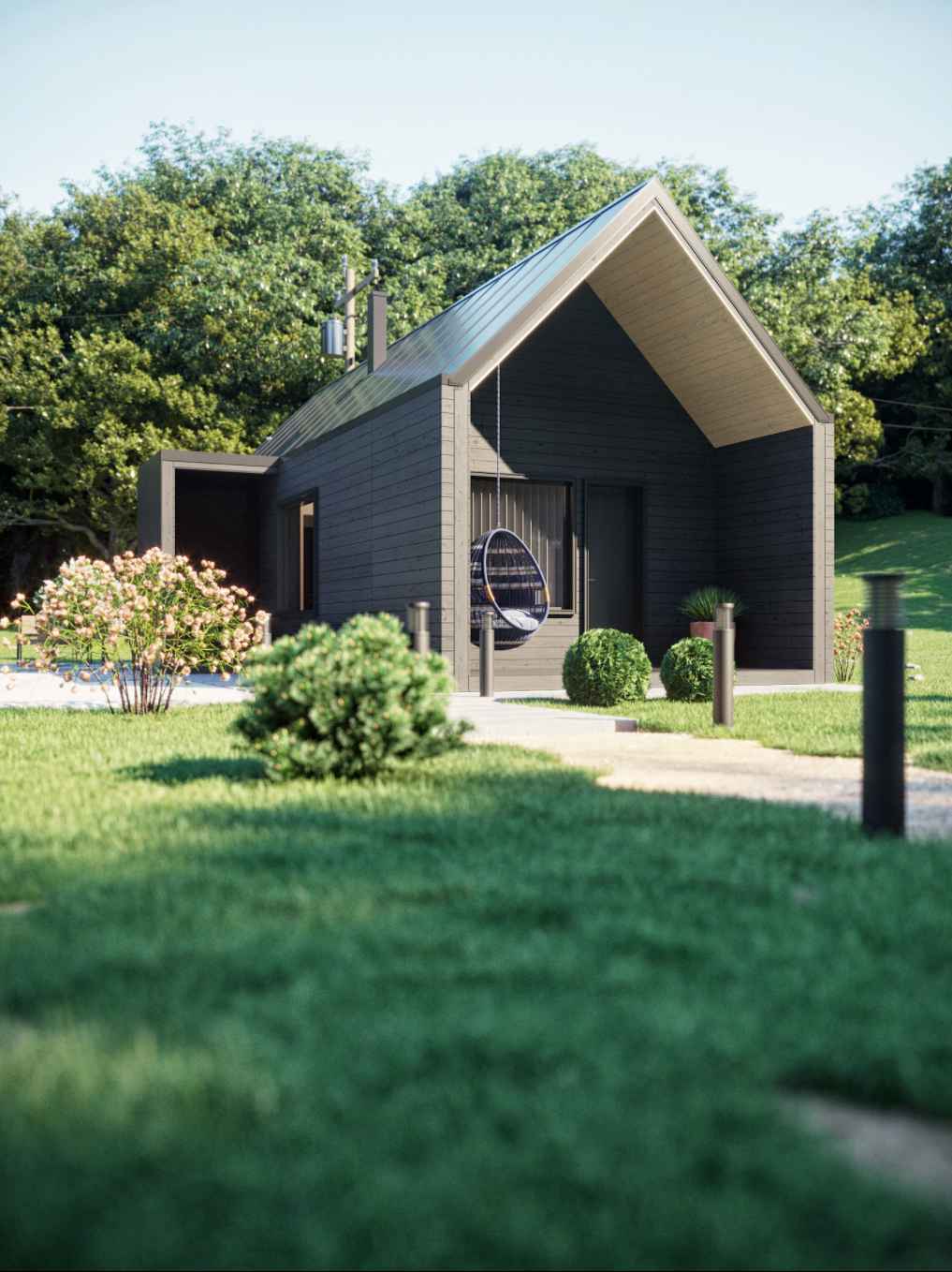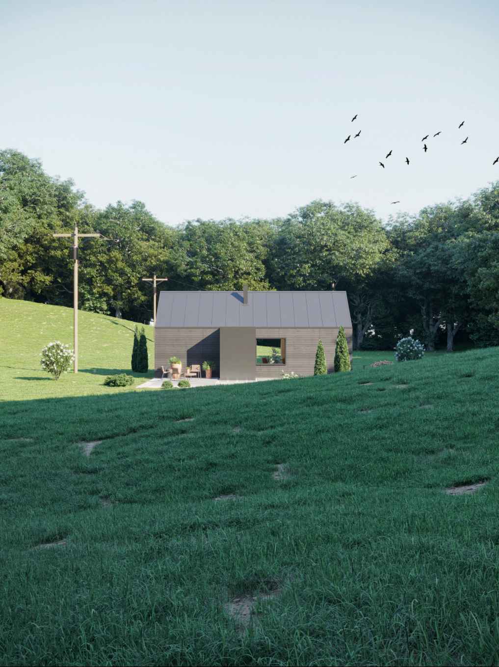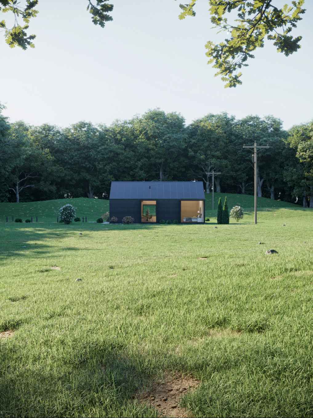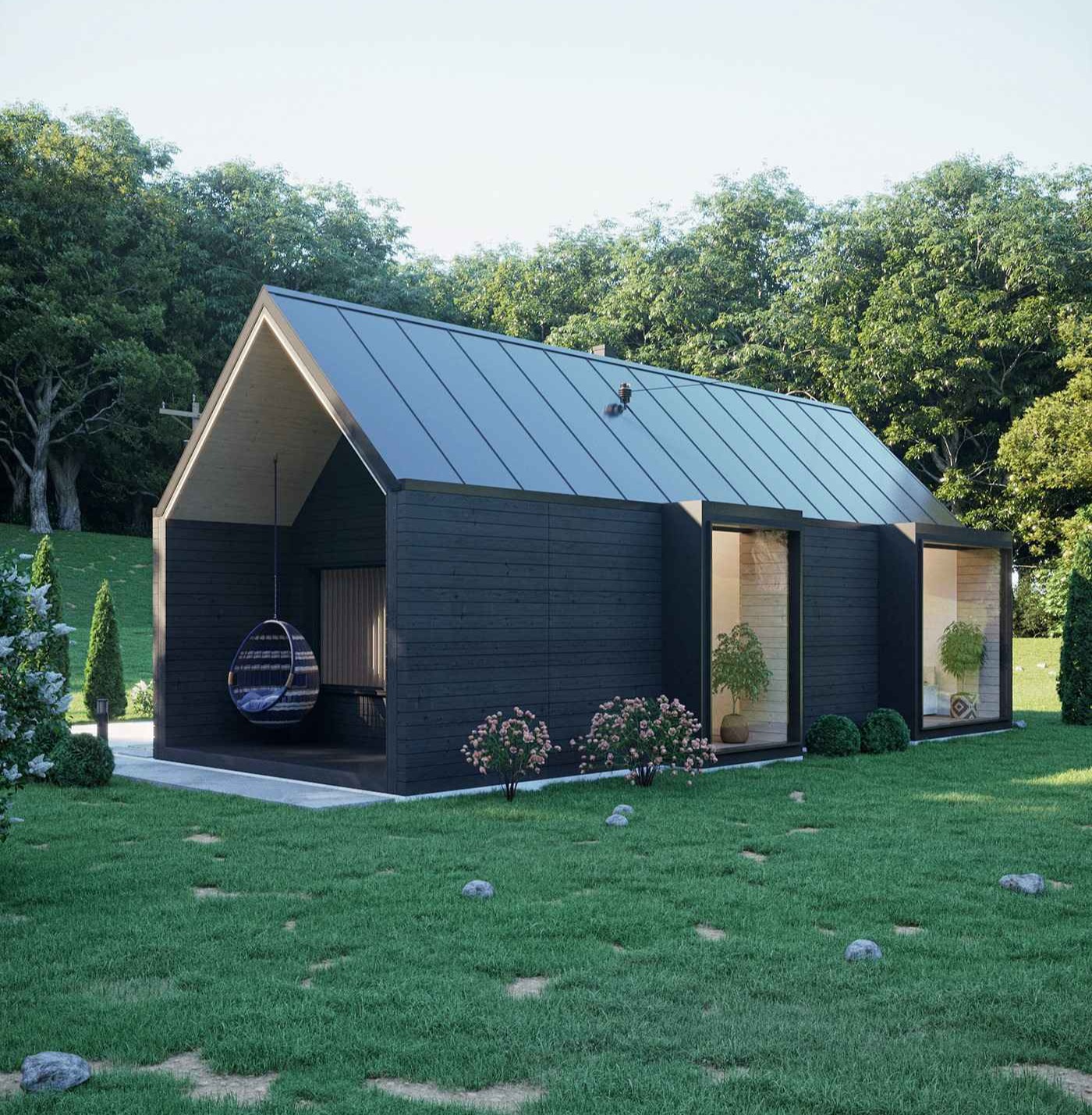 Maleńki domek w Serbii zachwyca swoją prostą, a jednocześnie elegancką formą, która wizualnie nawiązuje do estetyki nowoczesnej stodoły. Dach pokryto trwałymi panelami z aluminium, natomiast elewację wykonano z czarnych desek modrzewia syberyjskiego, tworzących minimalistyczny, kontrastowy efekt. Od frontu czeka przytulna weranda z wiszącym fotelem w kształcie kokona, idealna do wypoczynku na świeżym powietrzu. Całość wyróżnia się przemyślaną kompozycją materiałów oraz formą dopasowaną do otaczającego krajobrazu.