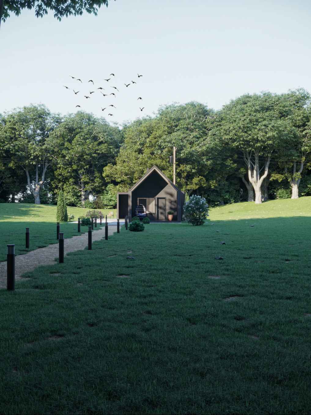 Największe wrażenie budzą duże okna wychodzące poza obrys budynku, dzięki którym wnętrze jest pełne naturalnego światła i optycznie zyskuje przestrzeń. Przeszklenia podkreślają nowoczesny charakter domku i otwierają go na naturę, tworząc harmonię między architekturą a otoczeniem. Ten niewielki, lekki wizualnie obiekt to propozycja dla osób ceniących minimalizm, funkcjonalność i kompaktową, mobilną architekturę wysokiej jakości.