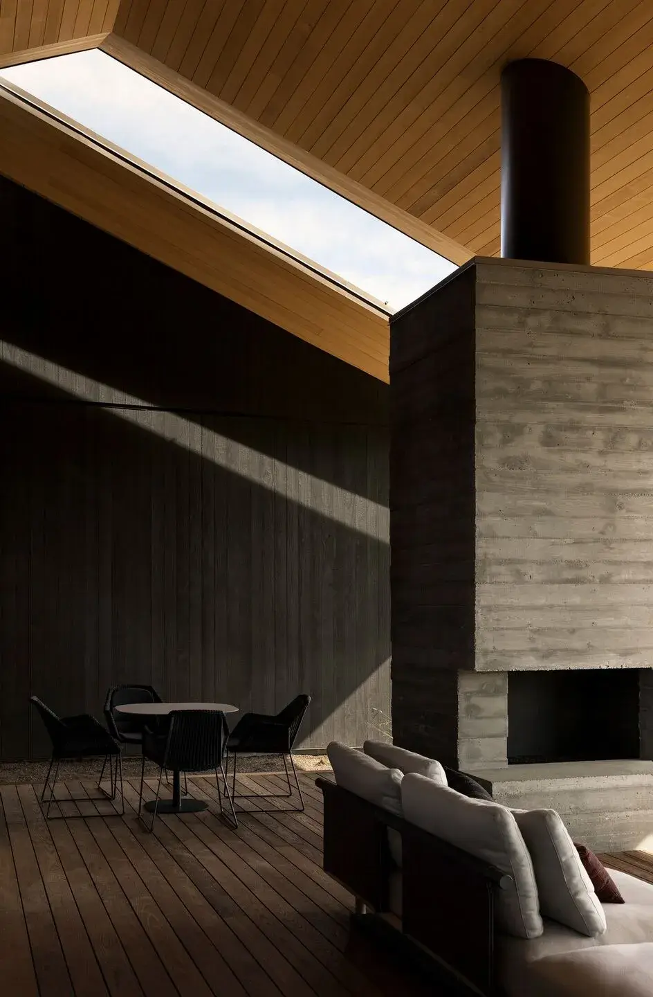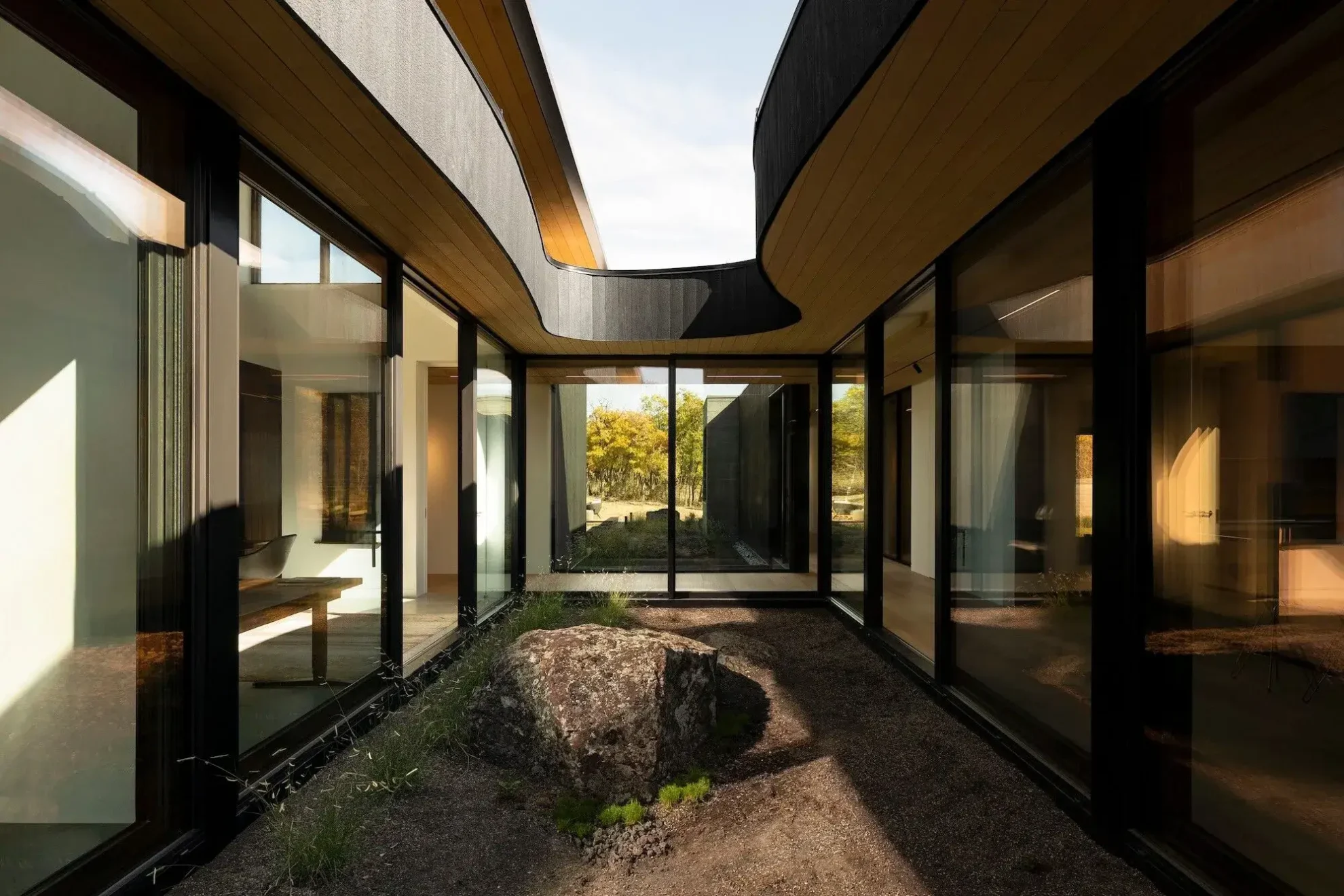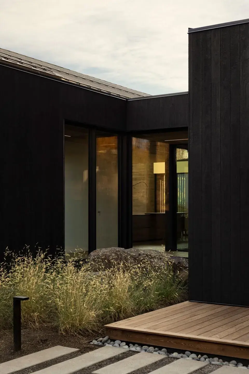 Zaczął od stworzenia hierarchii, która dla niego jest szczytem wysokości sufitu. Ten punkt odniesienia, jak to nazywa, przebiega przez cały projekt, wieńcząc płaskie części dachu, szkło w głównej sypialni i tworząc punkt wyjścia dla szczytów. Centralną cechą organizacyjną domu jest dziedziniec z 3-stopowymi nawisami, które same w sobie są centralnym punktem projektu. Współpracując z zaciemnioną materialnością shou sugi ban reszty elewacji, te nawisy tworzą jeszcze większe poczucie schronienia w domu.