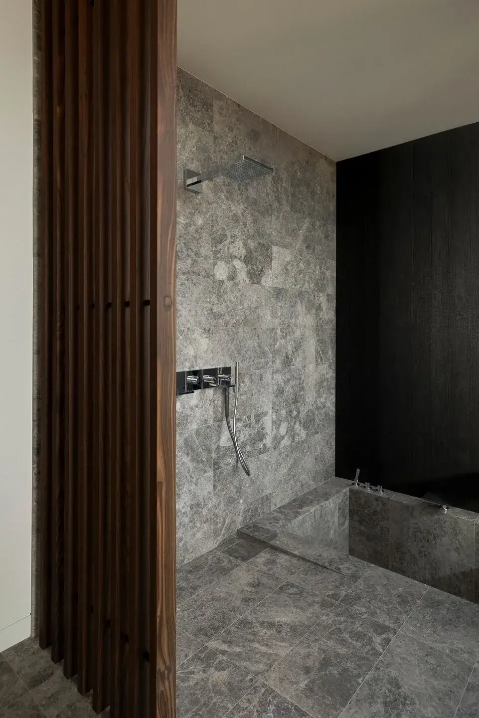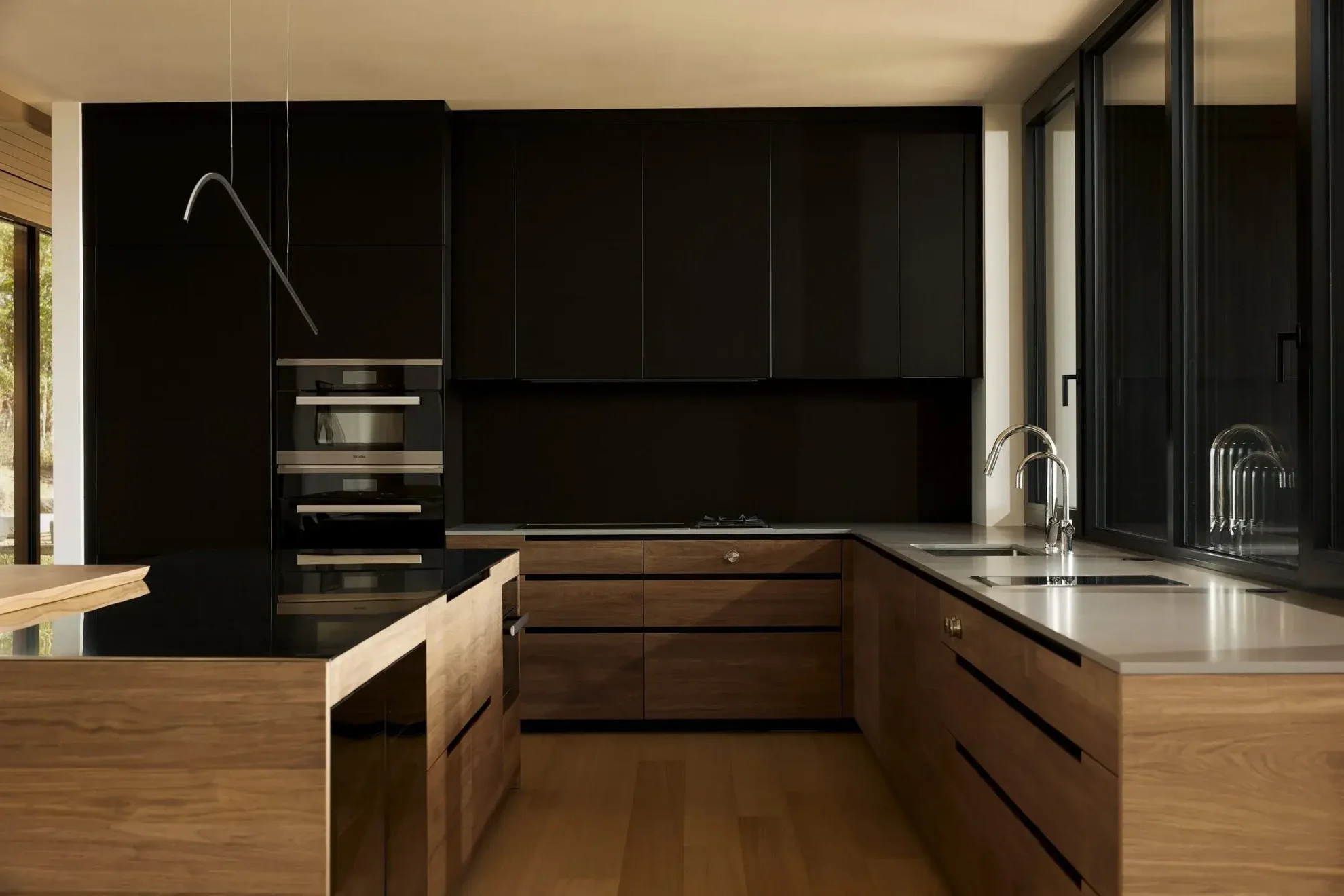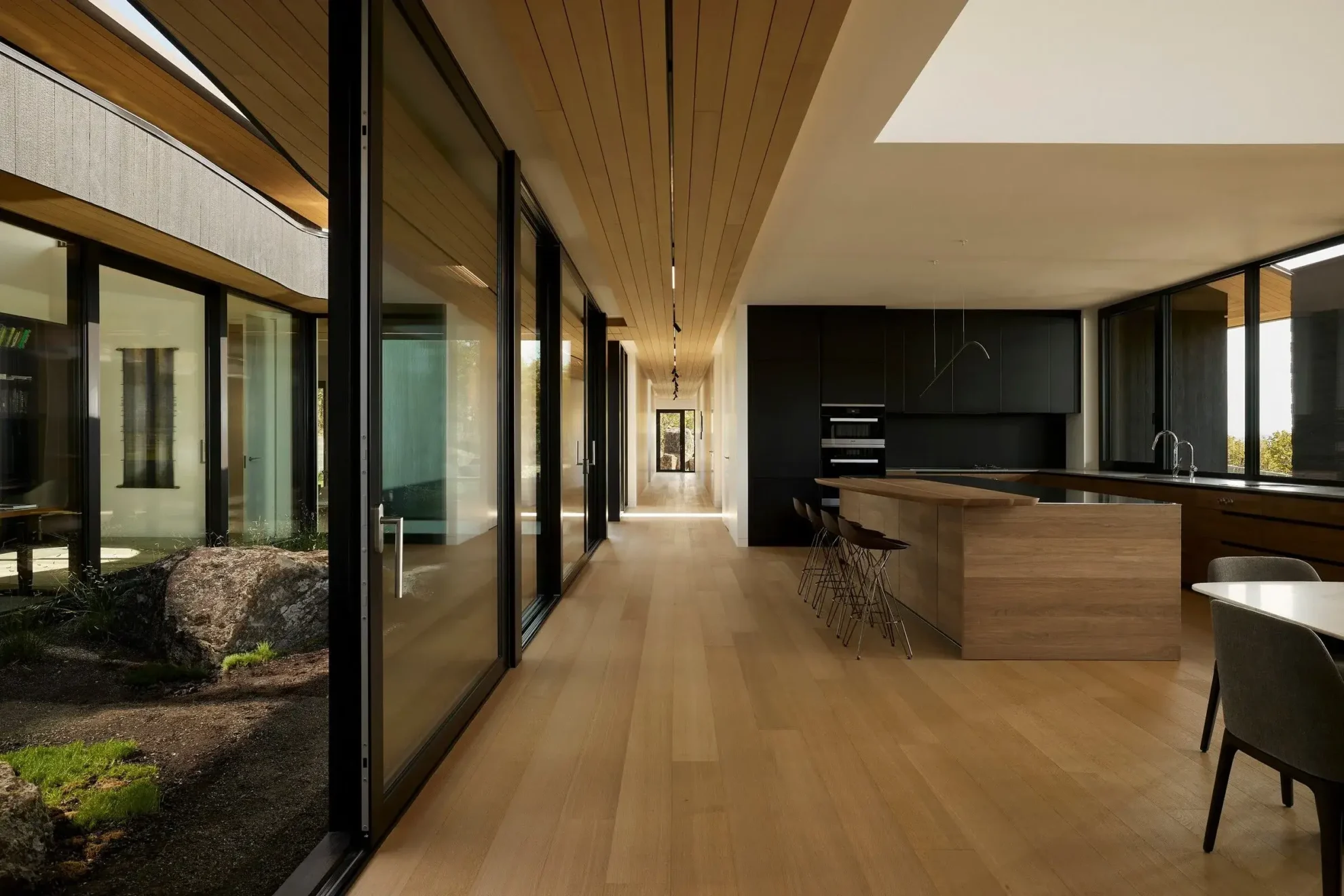 Zaczął od stworzenia hierarchii, która dla niego jest szczytem wysokości sufitu. Ten punkt odniesienia, jak to nazywa, przebiega przez cały projekt, wieńcząc płaskie części dachu, szkło w głównej sypialni i tworząc punkt wyjścia dla szczytów. Centralną cechą organizacyjną domu jest dziedziniec z 3-stopowymi nawisami, które same w sobie są centralnym punktem projektu. Współpracując z zaciemnioną materialnością shou sugi ban reszty elewacji, te nawisy tworzą jeszcze większe poczucie schronienia w domu.