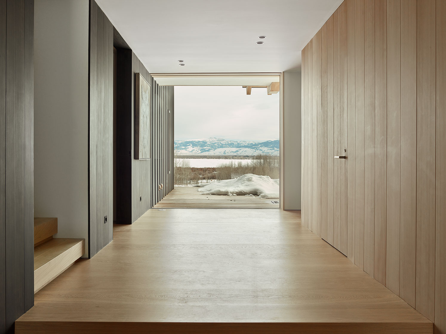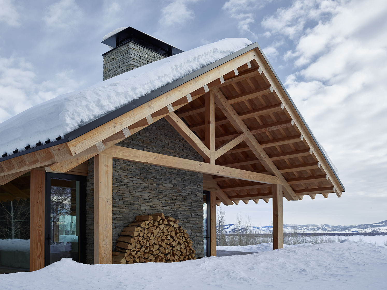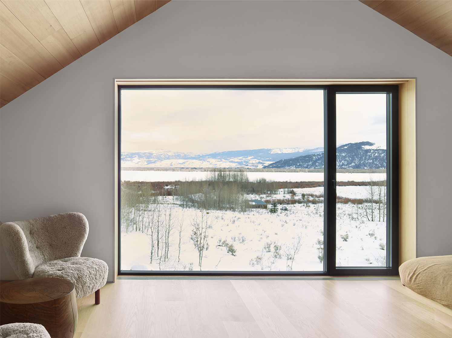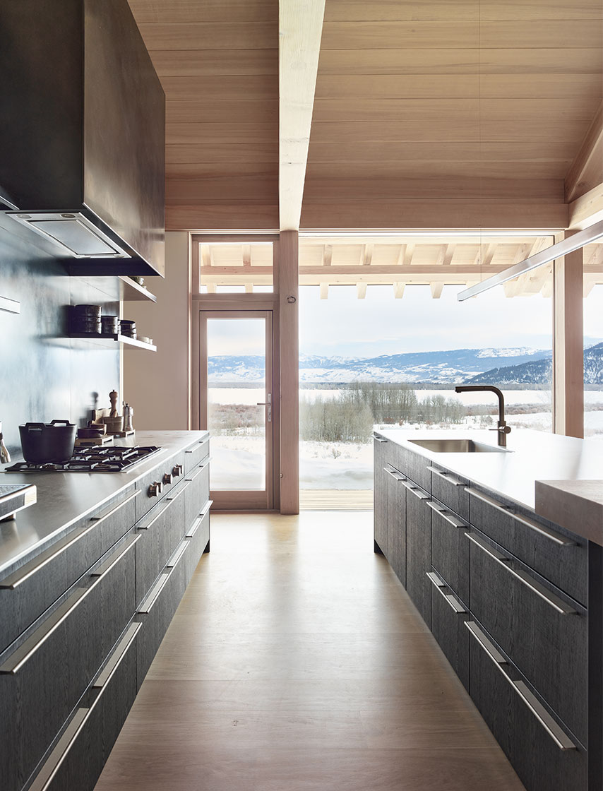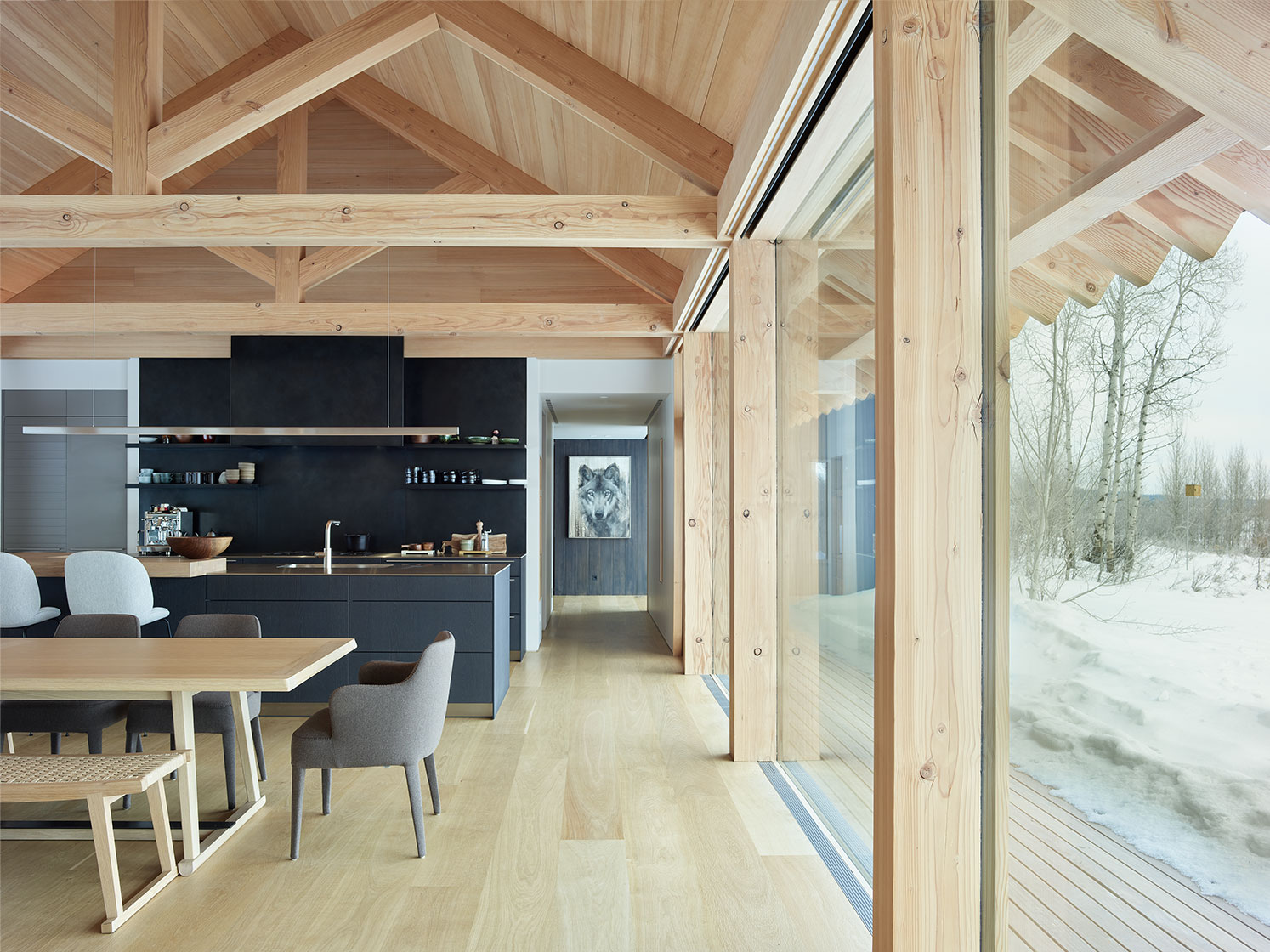 Projekt cechuje minimalistyczna estetyka oraz starannie dobrana, naturalna paleta materiałów: cykuta, dąb i drewno iglaste kontrastują z taflami szkła. Dom harmonijnie wpisuje się w górski krajobraz, oferując ciszę, prywatność i panoramiczne widoki. Snake River Cabin to przykład zrównoważonej architektury, która celebruje naturę bez zbędnego przepychu.