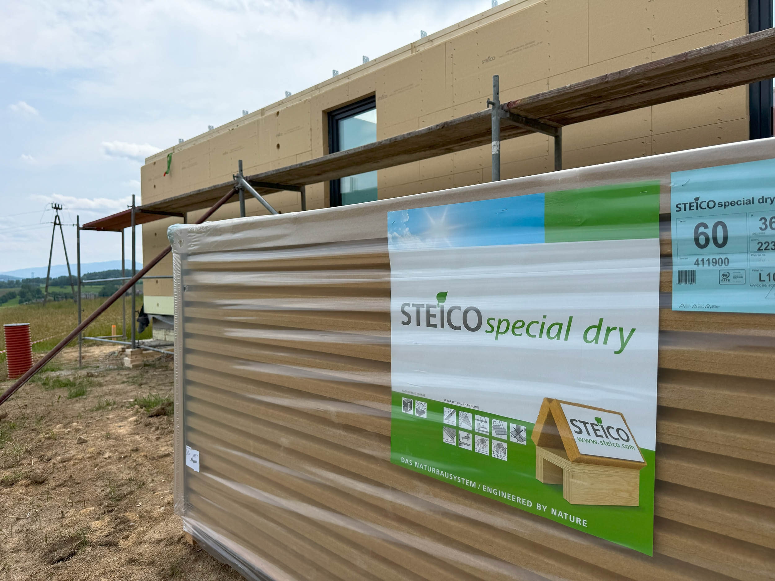 W konstrukcji zastosowano prefabrykowane elementy drewniane o znakomitych parametrach cieplnych – współczynnik przenikania ciepła dla ściany zewnętrznej wynosi jedynie U=0,165 W/(m²·K), a przesunięcie fazowe temperatury sięga aż 14 godzin, co oznacza wysoką stabilność cieplną budynku.