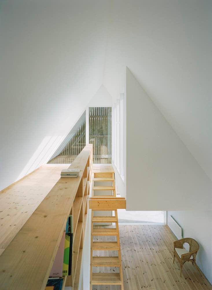 Sercem domu jest dwukondygnacyjny salon z kominkiem, otwarty na piętro. Wysokość wnętrza oraz pionowa relacja pomiędzy kondygnacjami potęgują wrażenie przestronności, mimo stosunkowo prostej bryły. Schody prowadzą ku światłu, w stronę górnego poziomu i tarasu, z którego roztacza się widok na morze.