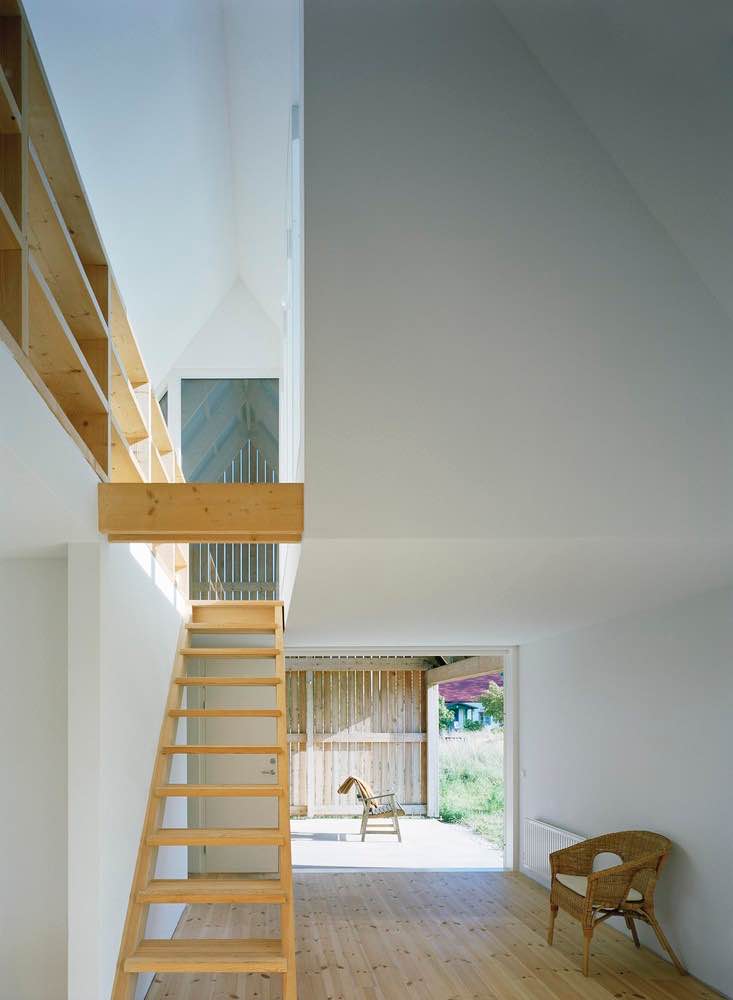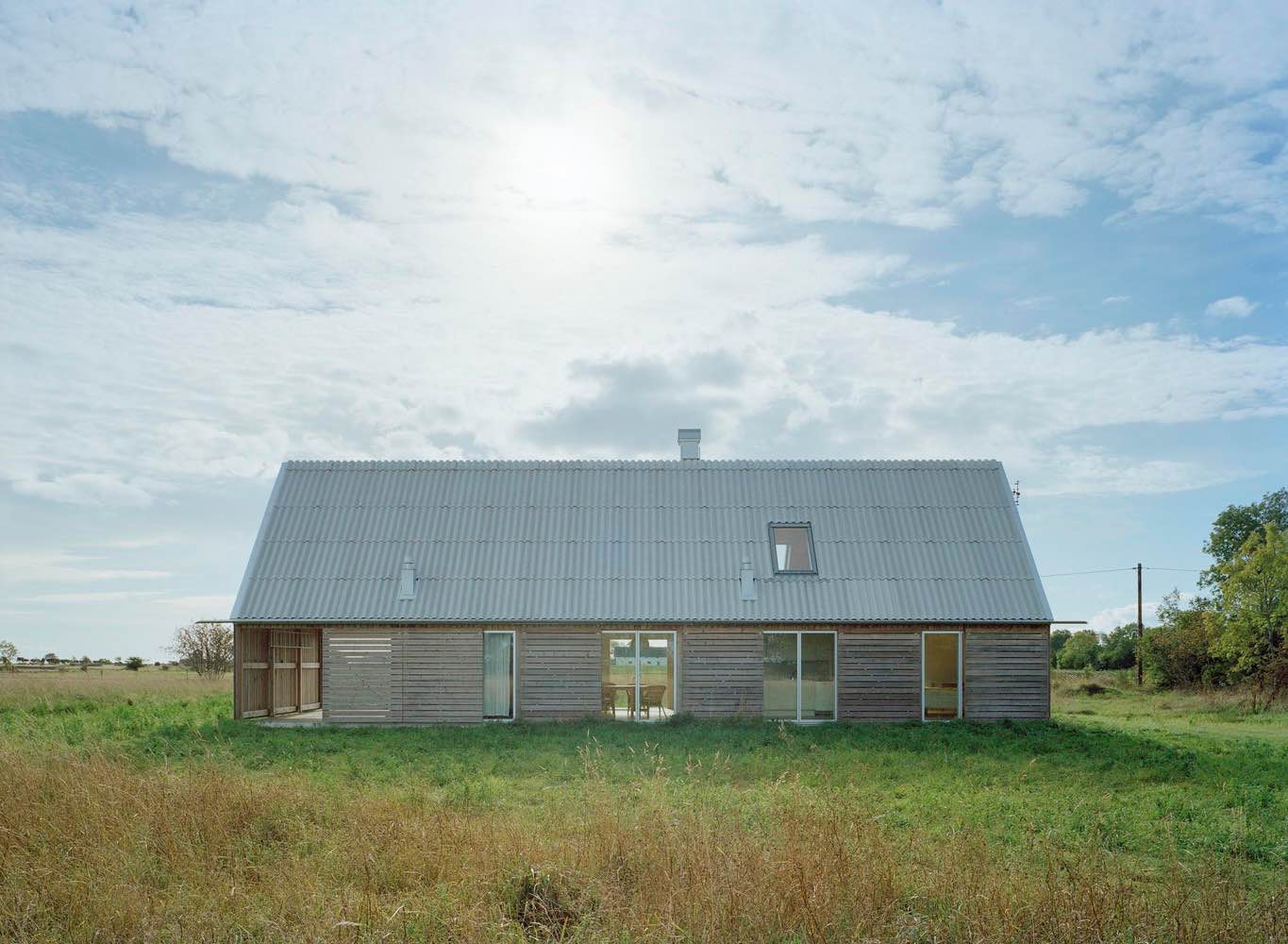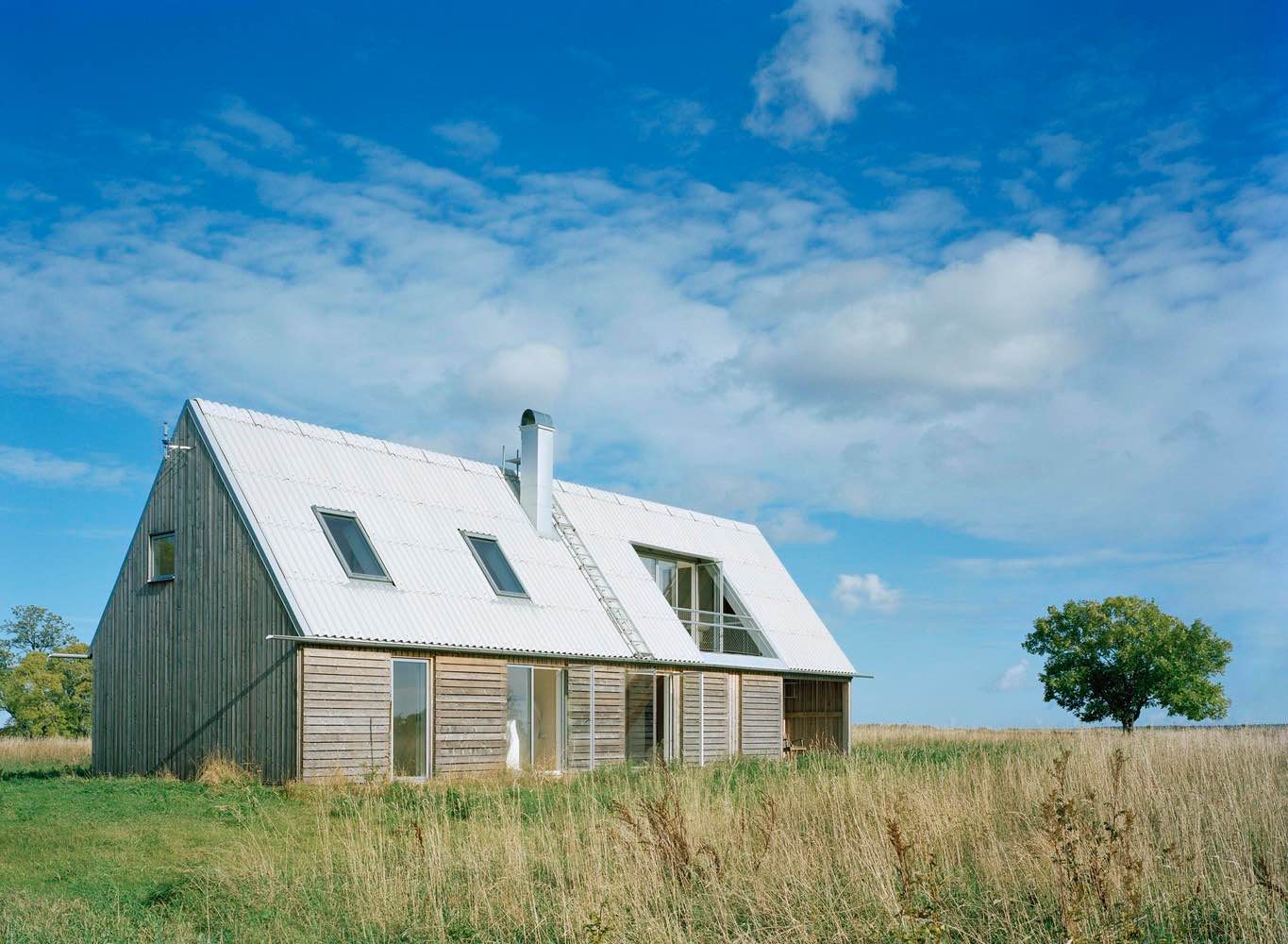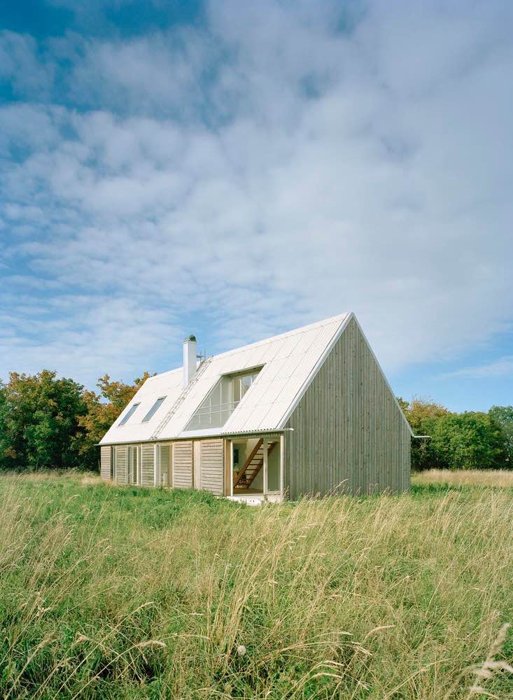 Bryła domu nawiązuje do archetypicznych zabudowań gospodarczych regionu. Prosta forma z dachem dwuspadowym oraz elewacje z modrzewia przywołują skojarzenia z lokalną architekturą rolniczą. Pokrycie dachu z płyt włókno-cementowych dodatkowo wzmacnia to odniesienie, nadając budynkowi powściągliwy, niemal użytkowy charakter. Dom nie konkuruje z krajobrazem, lecz wtapia się w niego swoją skalą i materiałowością.