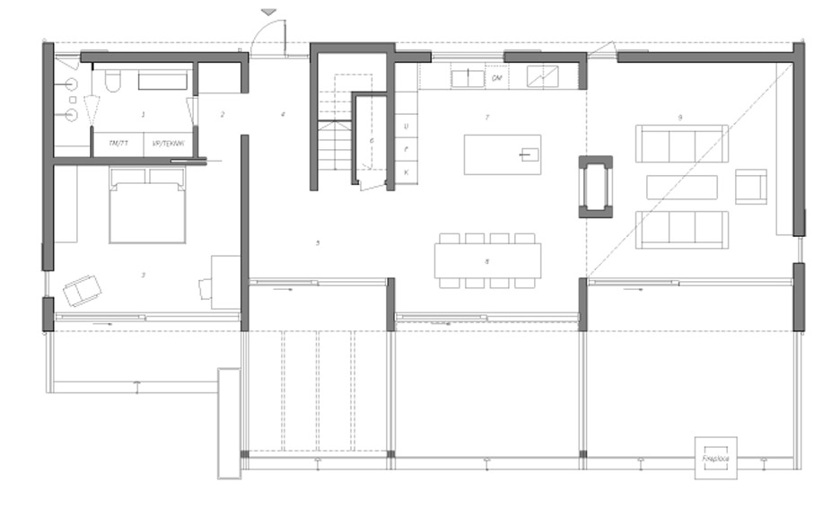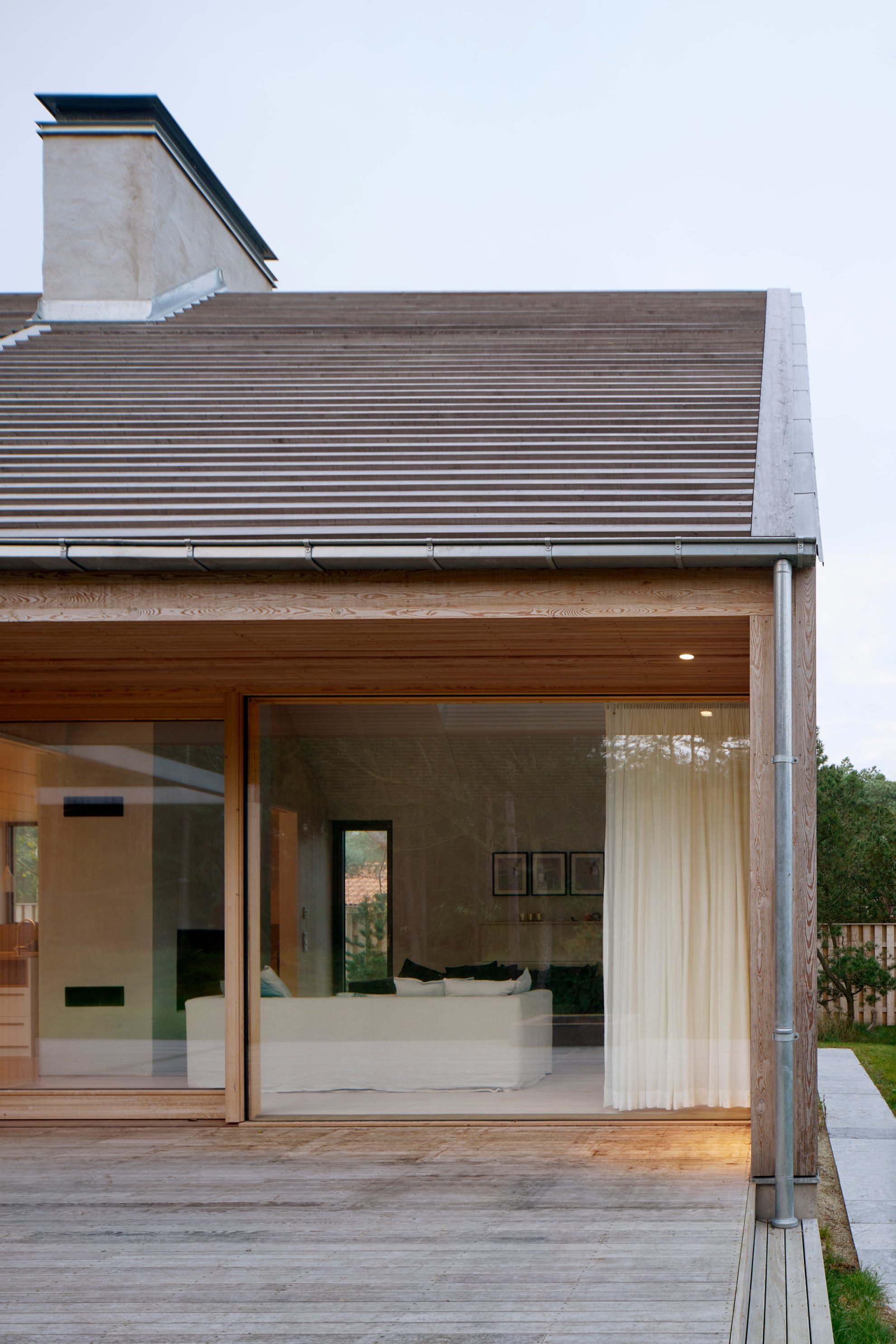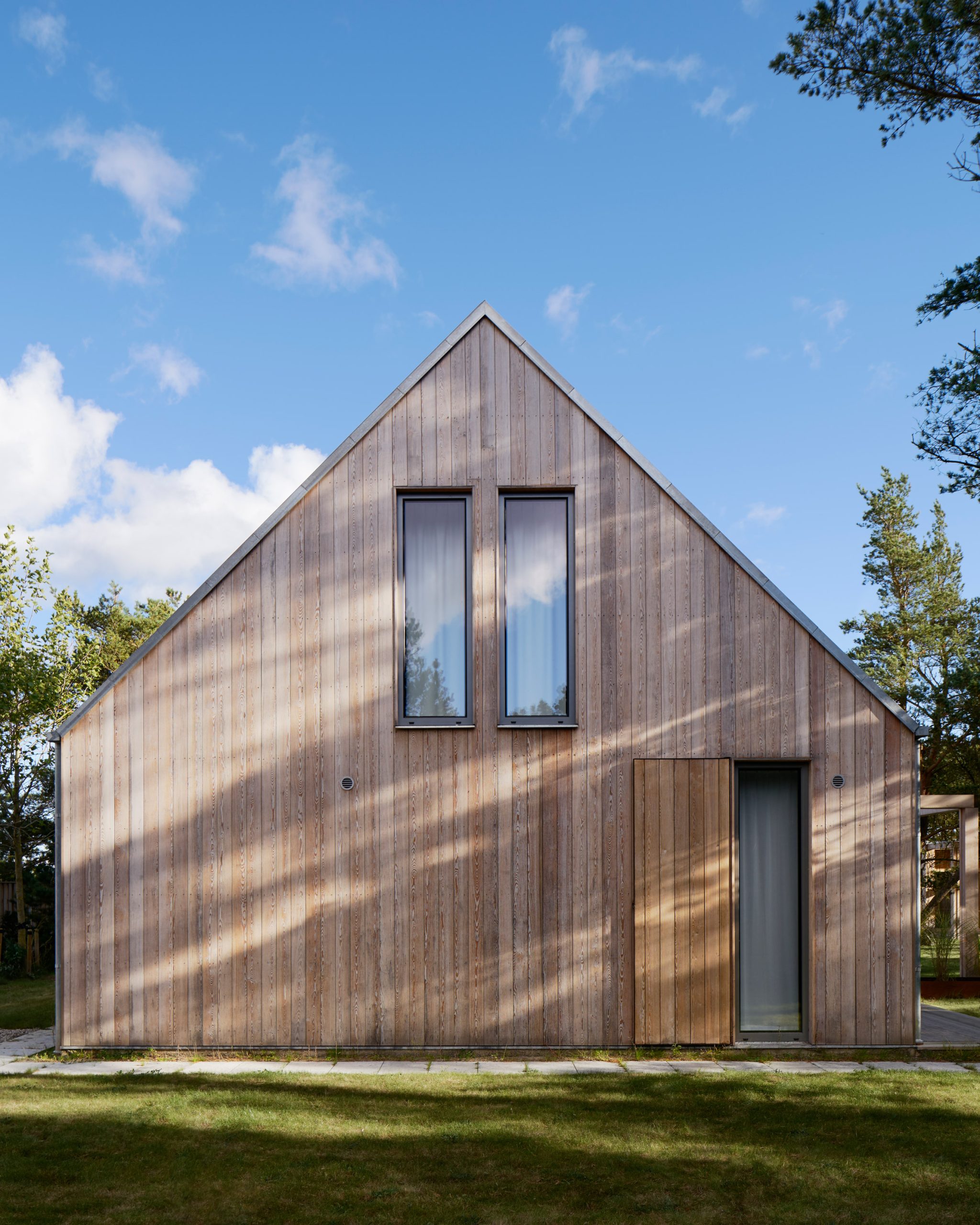 Z zewnątrz, Sommarhus Sandby nawiązuje do tradycyjnych, wiejskich domów skandynawskich, ale jego forma i detale podkreślają nowoczesne podejście do architektury. Drewniane elewacje i dach nadają mu charakterystyczną „stodołową” estetykę, jednocześnie łącząc ją z nowoczesnymi rozwiązaniami projektowymi. Ten współczesny dom z elementami tradycji skandynawskiej nie tylko wpisuje się w naturalne otoczenie, ale także zapewnia komfort i funkcjonalność, które odpowiadają na współczesne potrzeby użytkowników.