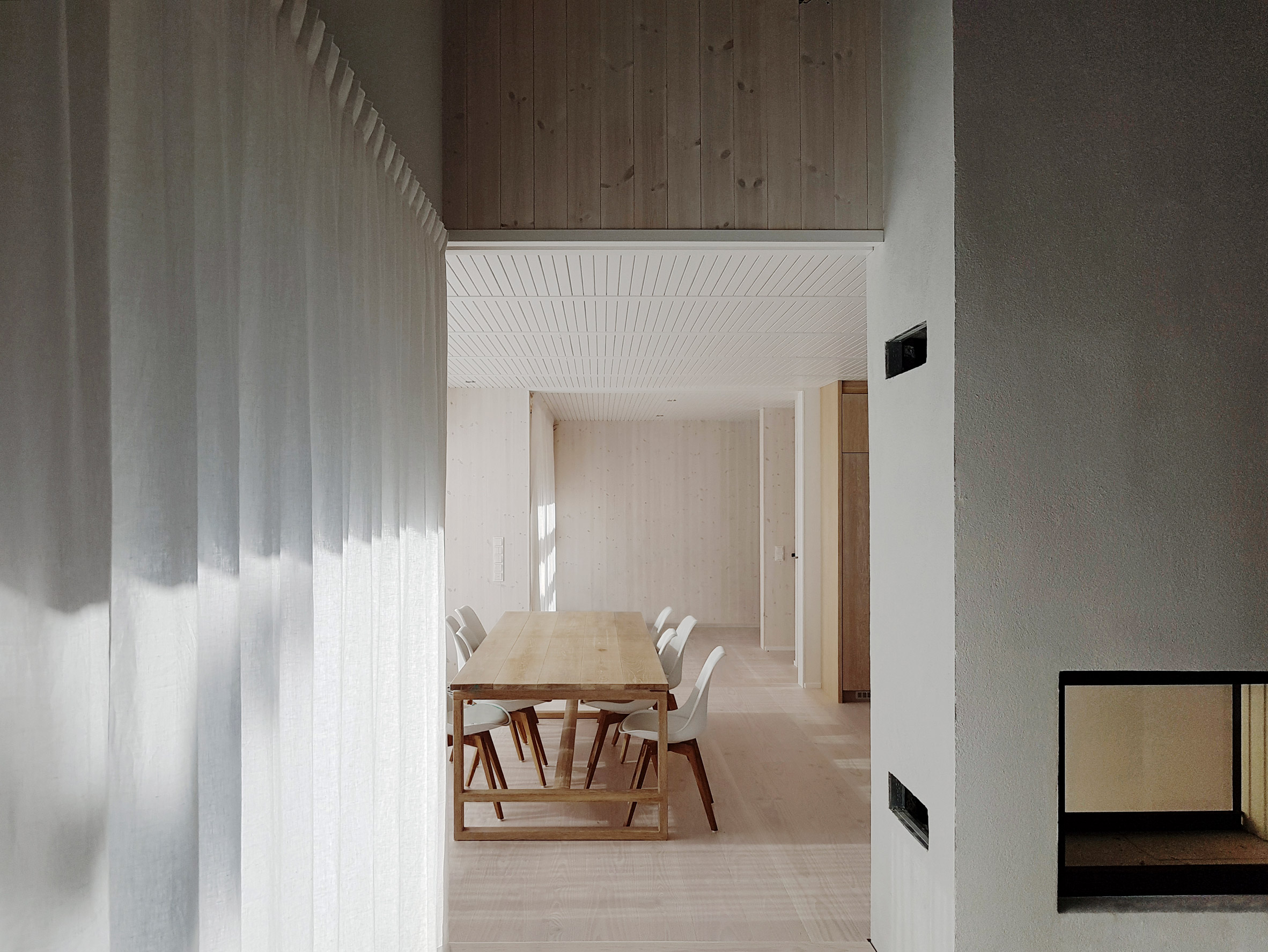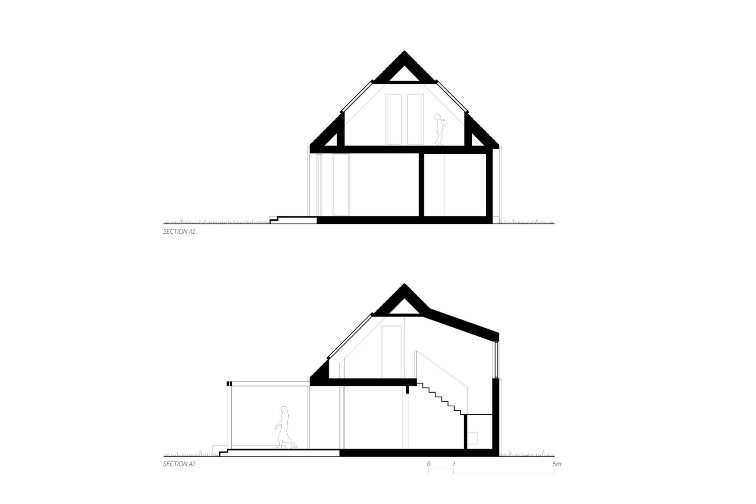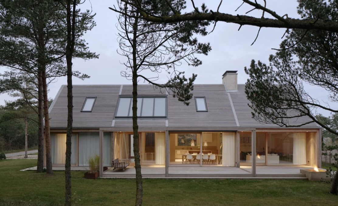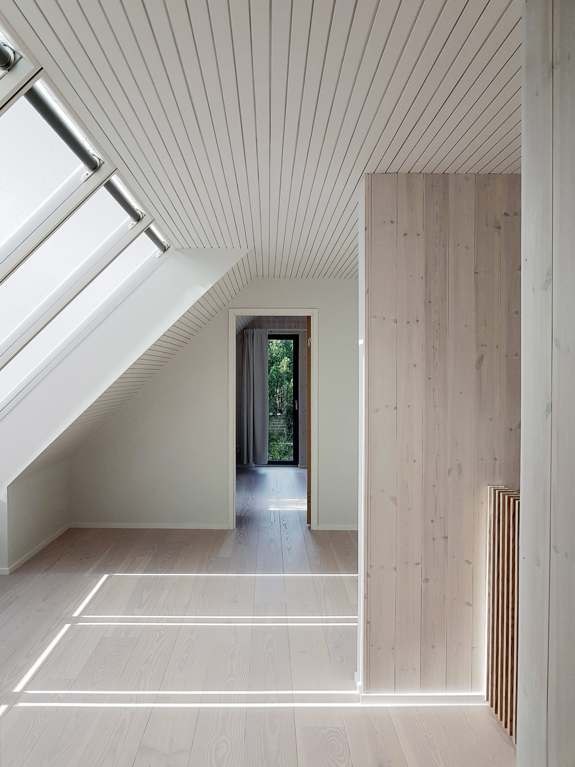 Dom o powierzchni 167 m² został zaprojektowany z myślą o rodzinie z dwójką dzieci, stanowiąc przestrzeń na lato, w której każdy znajdzie swoje miejsce. Dwupoziomowy układ zapewnia komfort i funkcjonalność. Na górnym poziomie znajdują się dwa pokoje dziecięce, które mogą zostać łatwo przekształcone w trzy, oraz wspólna przestrzeń i łazienka. Wszystkie pomieszczenia posiadają świetliki, które wprowadzają do wnętrza naturalne światło, a duże przeszklenia umożliwiają podziwianie otaczającej przyrody. Na parterze zlokalizowane są główna sypialnia, przestronna kuchnia z jadalnią, a także salon, który można otworzyć na drewniany taras i ogród za pomocą dużych przesuwnych drzwi. Dom łączy w sobie komfort nowoczesnego życia z estetyką zgodną z naturą i tradycją.