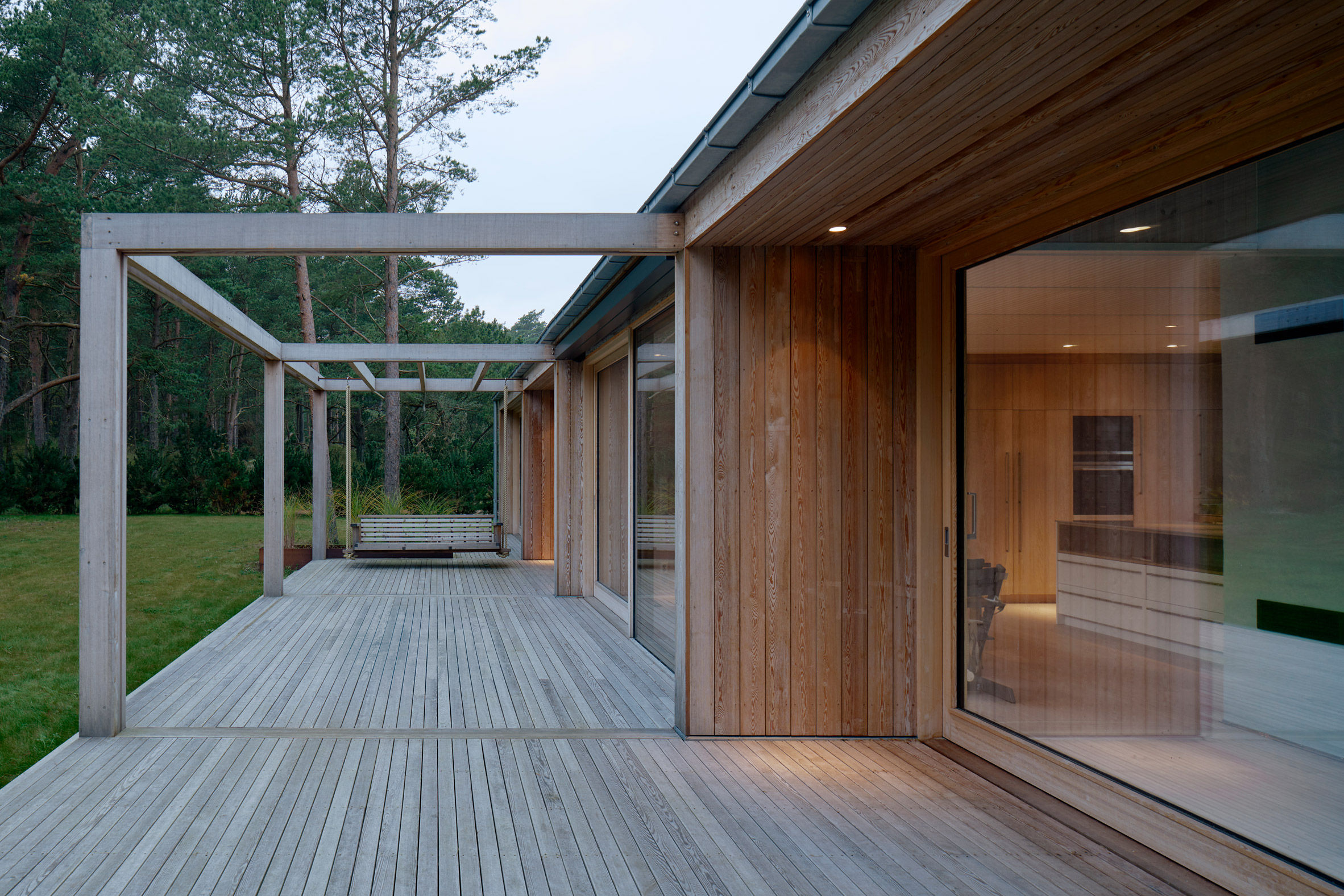 Elewacje domu zostały wykończone panelem stojącym o niestandardowym profilu, który – podobnie jak drewniany taras i pergola – wykonany jest z modrzewia syberyjskiego. Drewno zostało zabezpieczone uszczelniaczem na bazie silikonu, co zwiększa jego trwałość, odporność na warunki atmosferyczne i zmiany temperatury. Z kolei dach domu pokryty jest panelem zakładkowym, również z modrzewia syberyjskiego, z zastosowaniem uszczelniacza silikonowego.