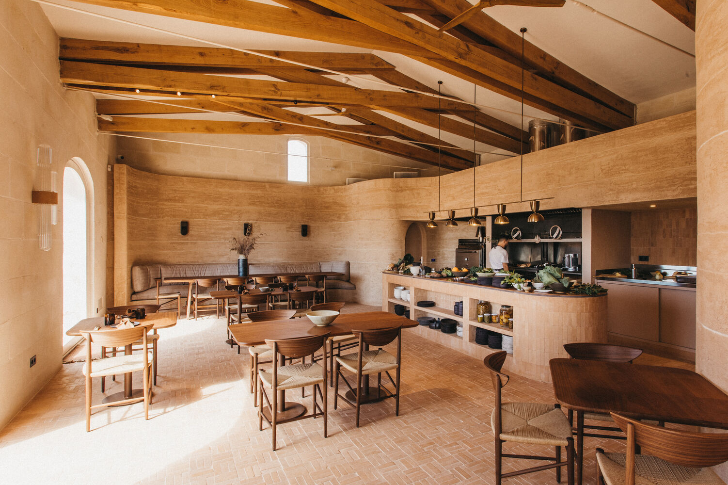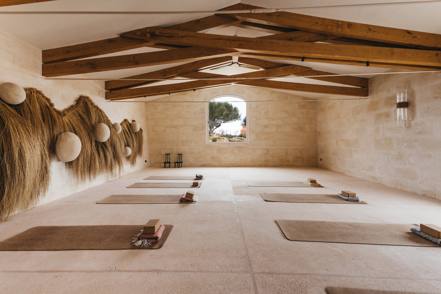 Wnętrza Son Blanc to przestrzenie rozległe i otwarte na przyrodę, co tworzy idealne tło do ekspresji architektonicznej. Główne lokalne materiały takie jak kamień, drewno i glina zostały użyte do dekoracji czternastu pokoi w tym wyjątkowym domu wiejskim. To właśnie w bryle Boyera – w części obiektu, która obejmuje recepcję, restaurację i salę sportową – ujawnia się tożsamość hotelu. Belki w tych przestrzeniach tworzą nową oprawę graficzną, a zakrzywiony podział wewnętrzny moduluje i ogranicza różne przestrzenie, zrywając z klasyczną geometrią i ukrywając obszary techniczne. Dzięki temu zyskano różne funkcje i przeznaczenia budynku, tworząc wrażenie harmonii z naturą.