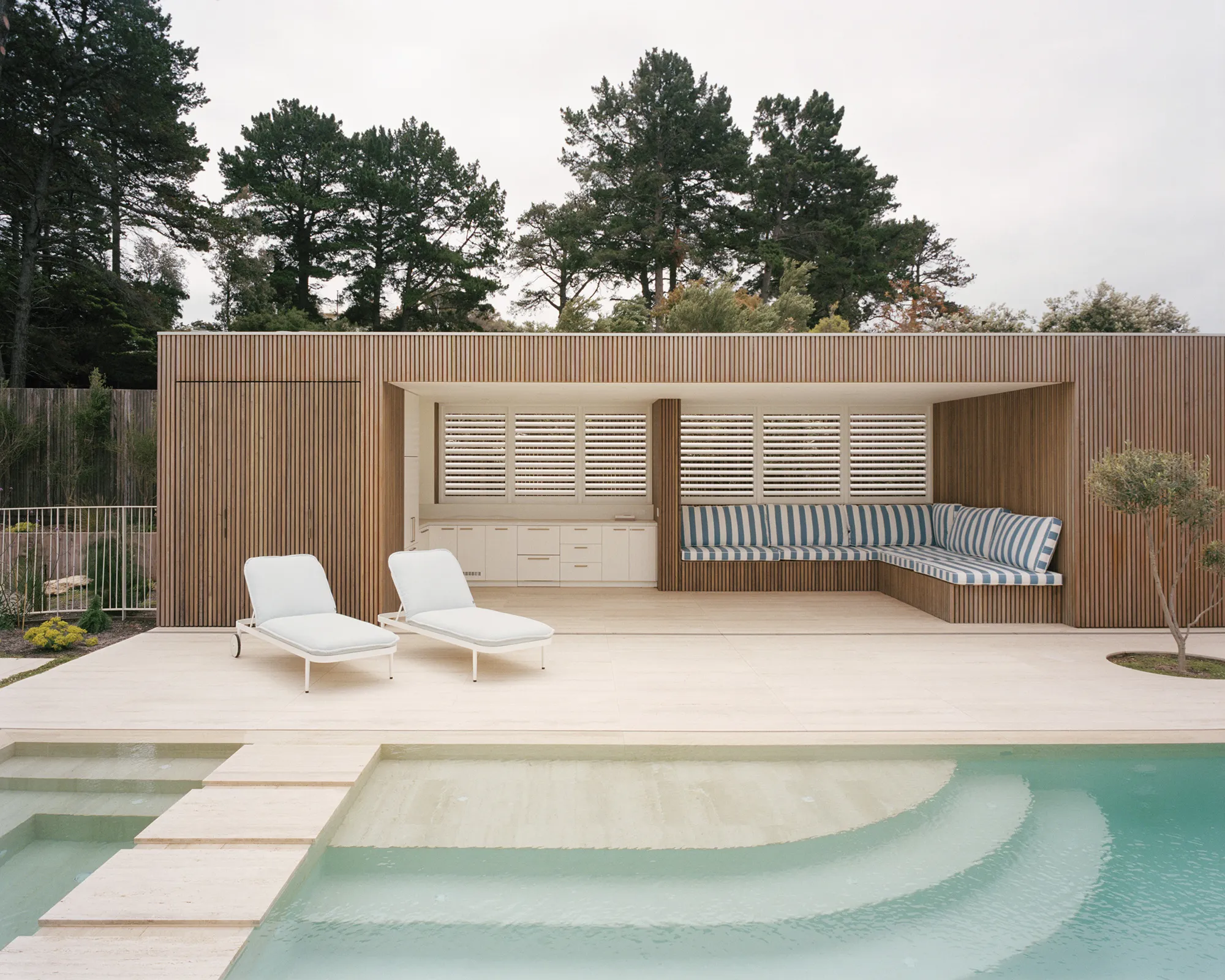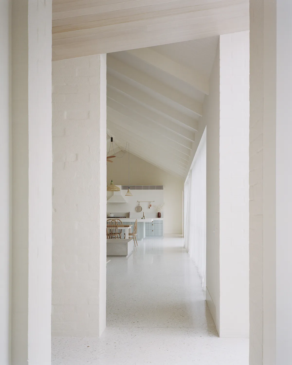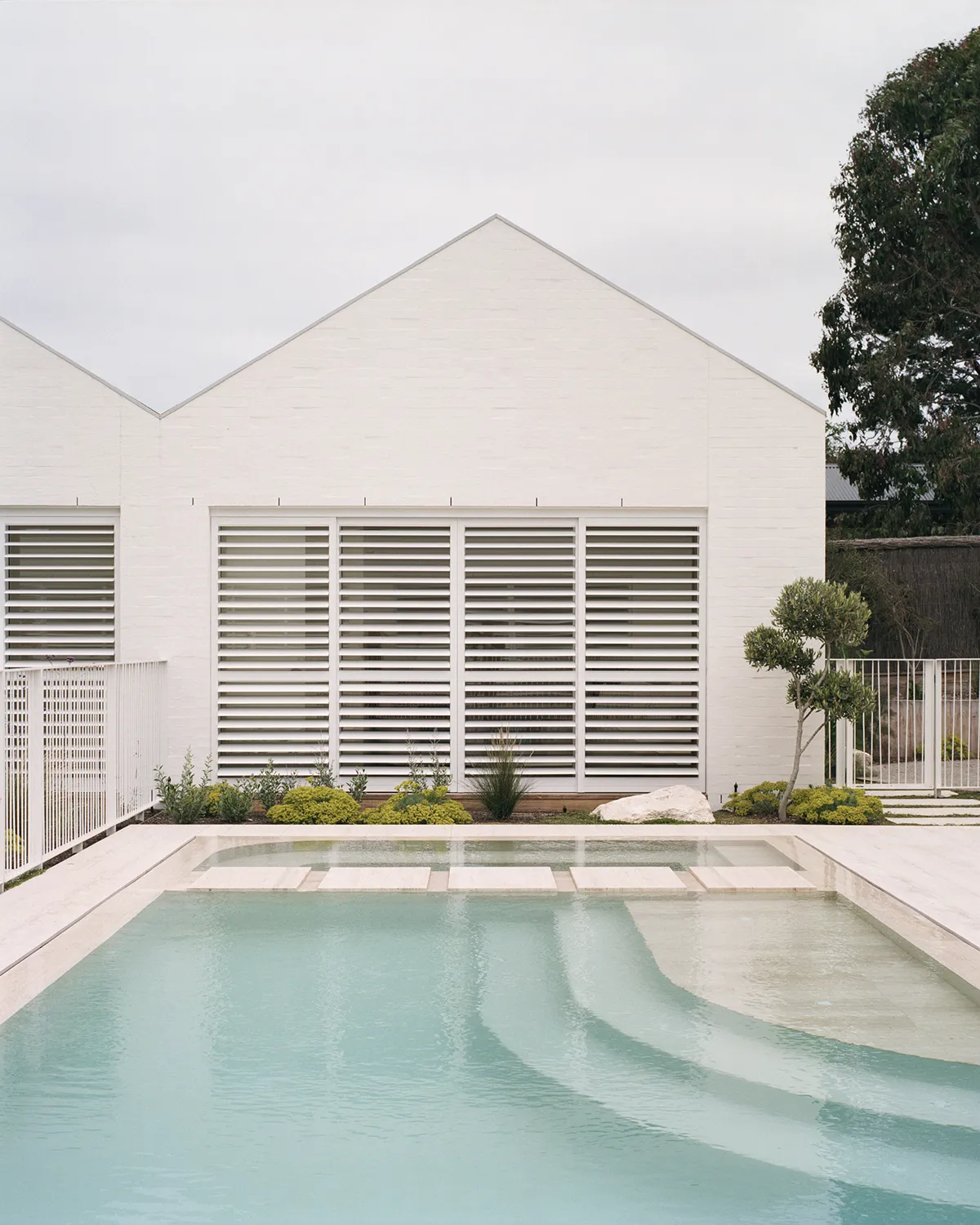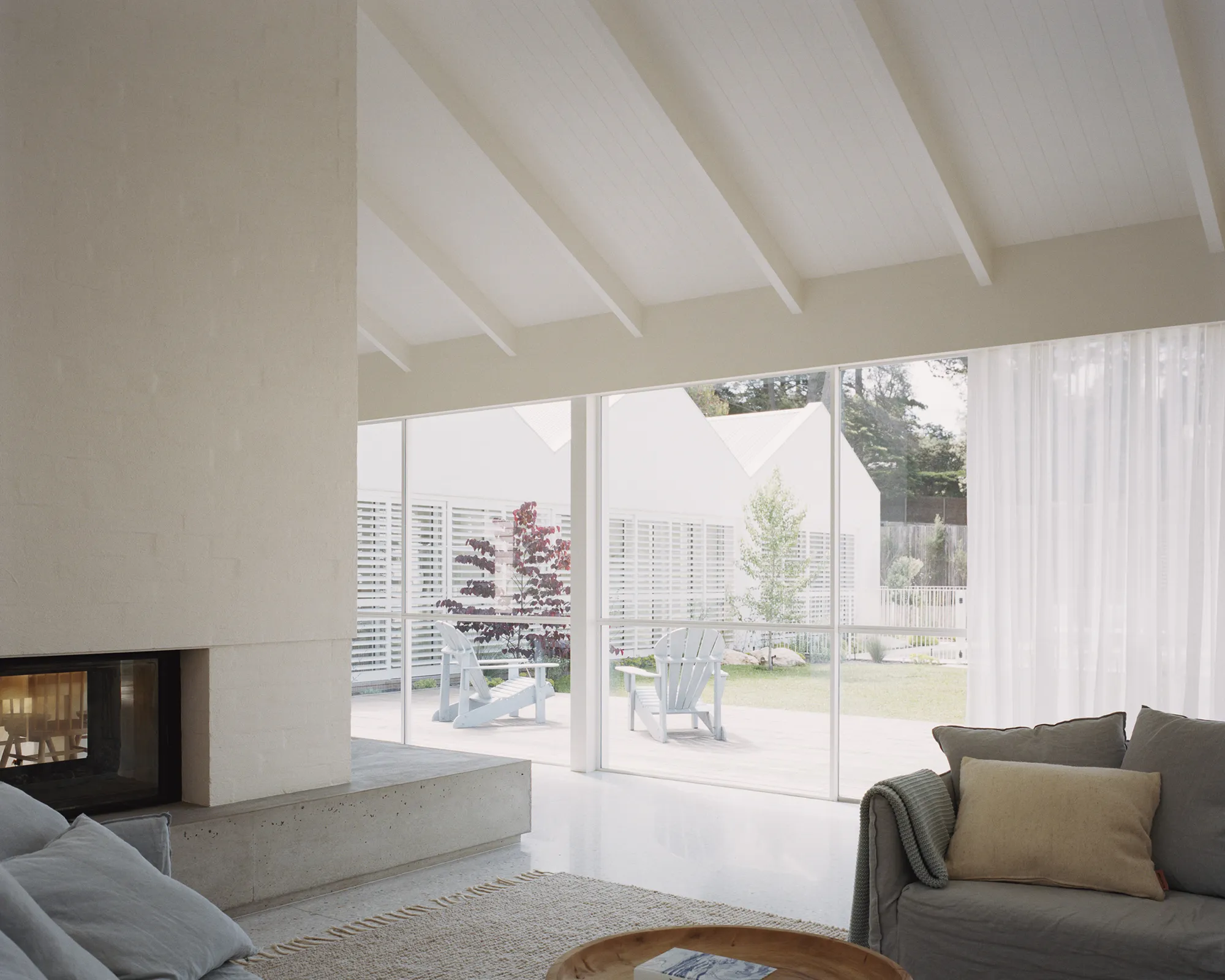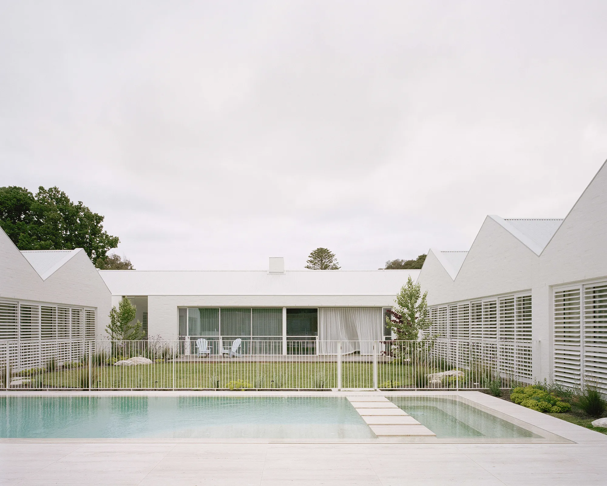 Dom został zaprojektowany wśród typowej zabudowy wakacyjnej linii brzegowej zatoki Port Phillip, jednak zamiast rywalizować o widoki na wodę, budynek wycofuje się i skupia uwagę na wewnętrznym dziedzińcu. Projekt składa się z pięciu osobnych pawilonów rozłożonych wokół wewnętrznej przestrzeni ogrodowej — co pozwala na stworzenie spokojnej, zorientowanej na rodzinne życie strefy wypoczynku.