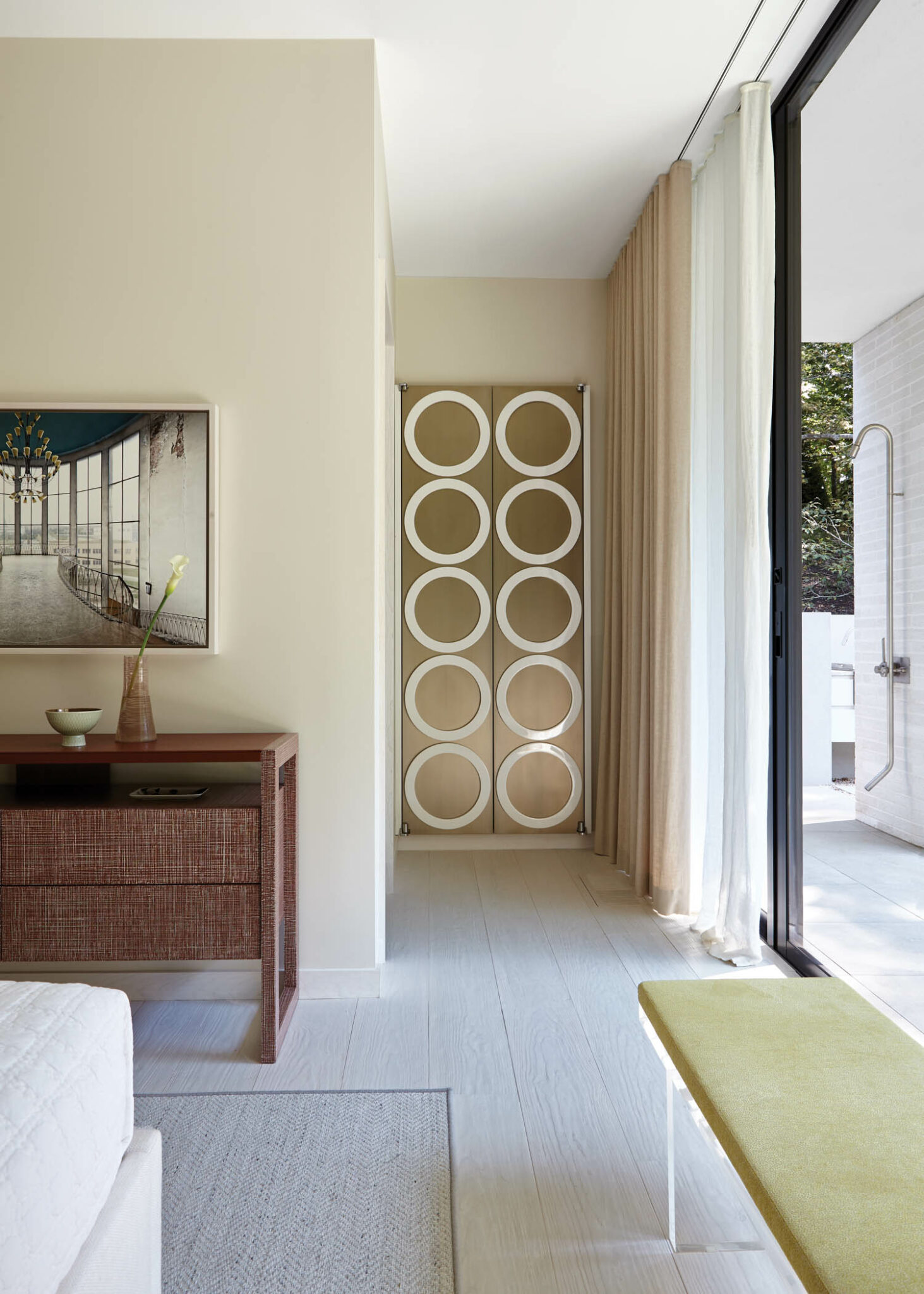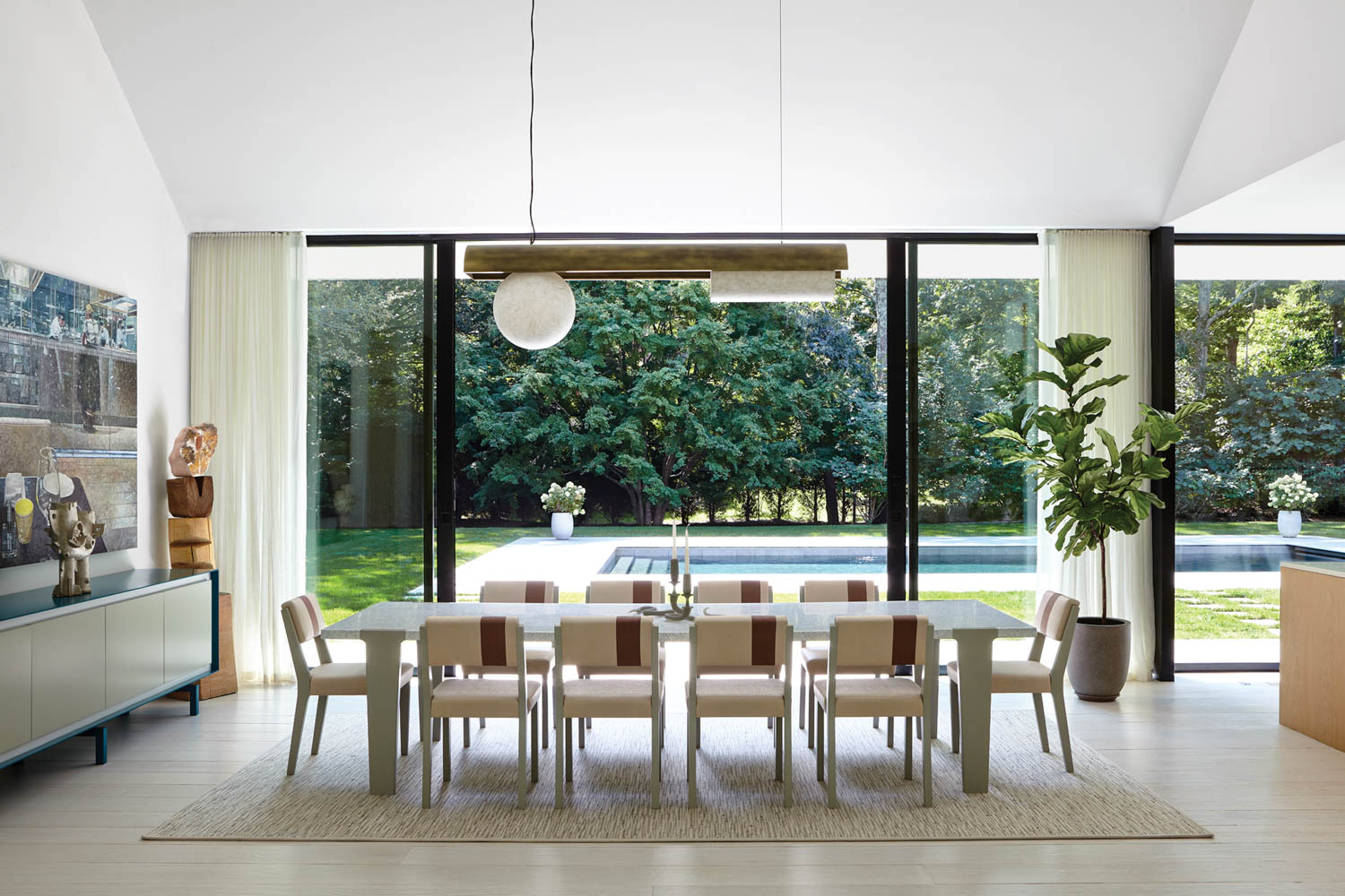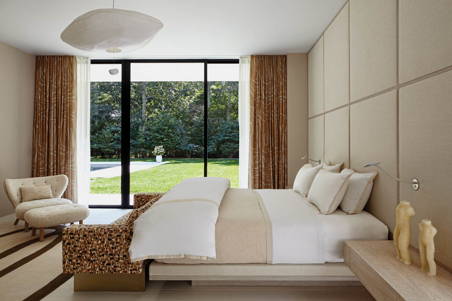 Przeszklone ściany o wysokości 3 metrów otwierają dom na otaczający krajobraz, dając poczucie płynnego przejścia między wnętrzem a ogrodem. Wnętrze domu to 8000 stóp kwadratowych doskonale przemyślanej przestrzeni mieszkalnej, zaprojektowanej przez samego Shemtova – od układu funkcjonalnego po autorskie meble wykonane przez jego firmę. Wysmakowana prostota łączy się tu z ciepłem naturalnych materiałów, jak drewno sosnowe poddane szczotkowaniu i bielone tynki, przełamane mocnymi akcentami z drewna wenge, lnu i skóry.