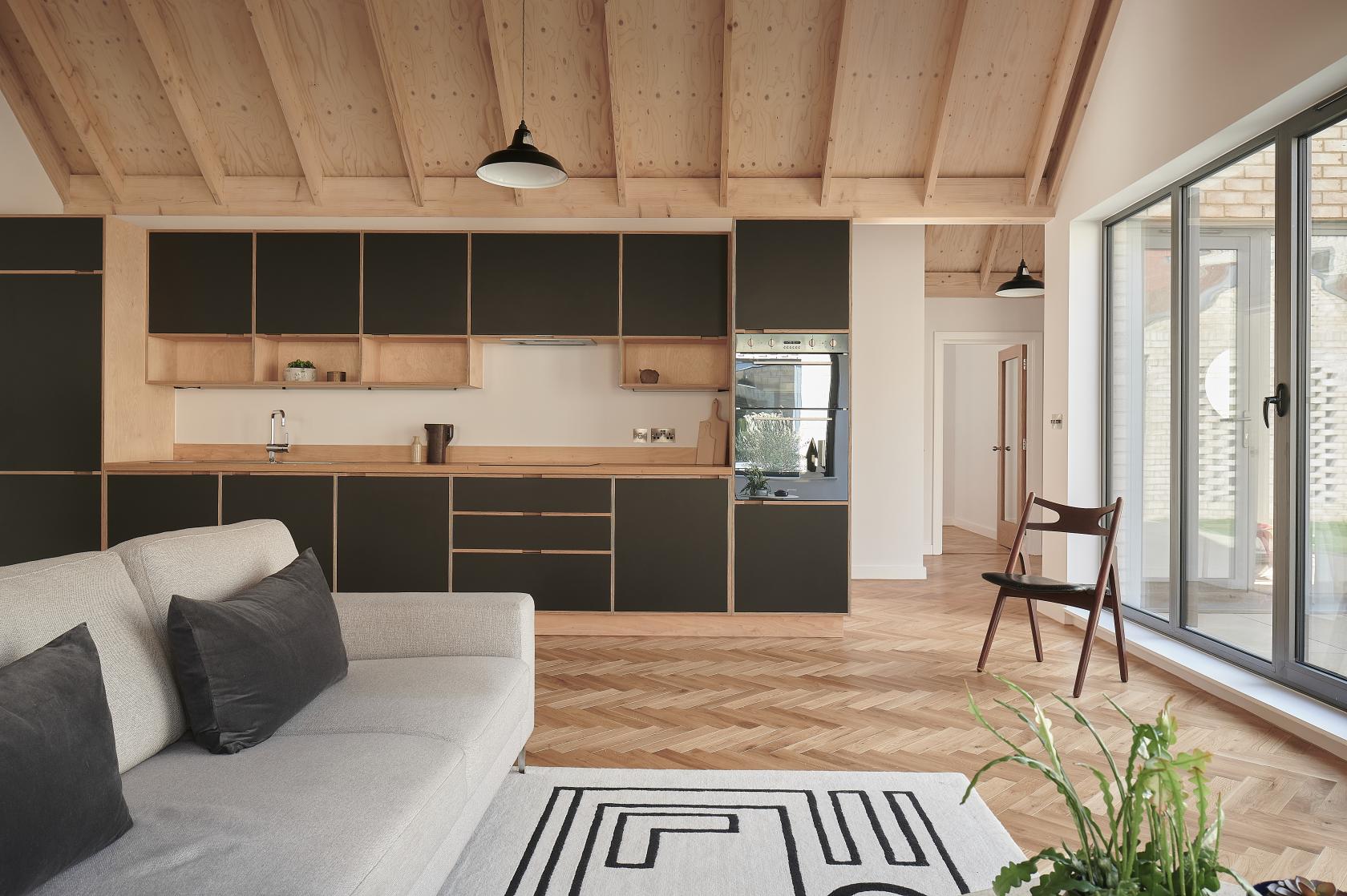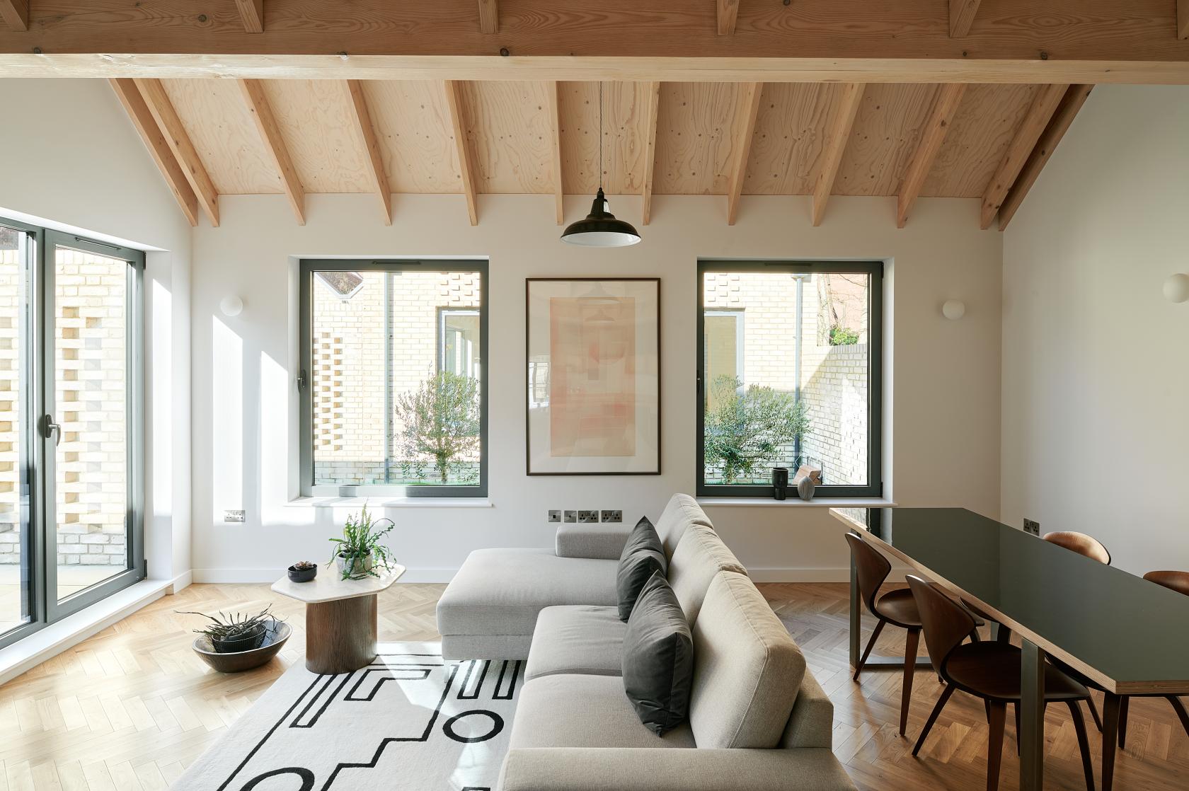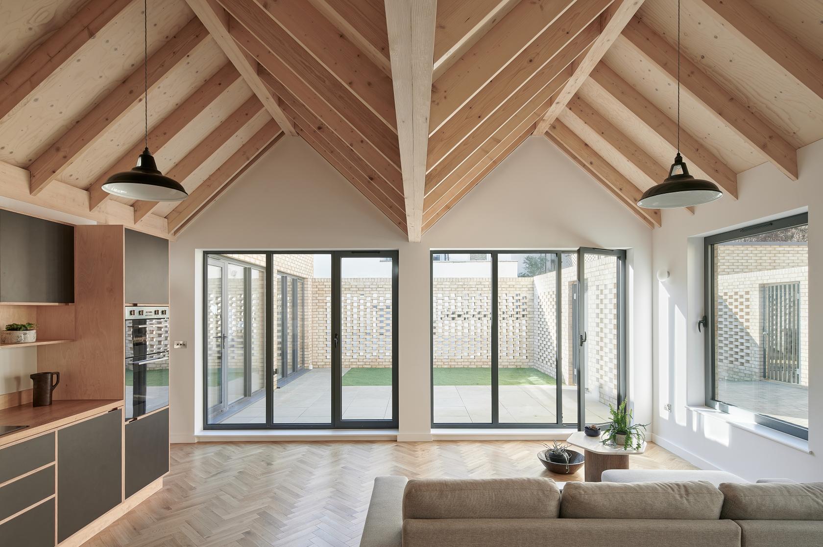 Jednym z kluczowych elementów tego projektu jest sposób, w jaki przestronność i światło są wprowadzane do wnętrza. Rozległe przeszklenia wzdłuż dziedzińców pozwalają, by promienie słoneczne wnikały głęboko do mieszkań, zmieniając się w zależności od pory dnia. Wewnętrzna nachylona forma dachu, odsłonięta konstrukcja oraz prostota materiałów potęgują wrażenie przestronności, co sprawia, że Spencer Courtyard to doskonały przykład, jak nowoczesna stodoła może funkcjonować w kontekście miejskim.
