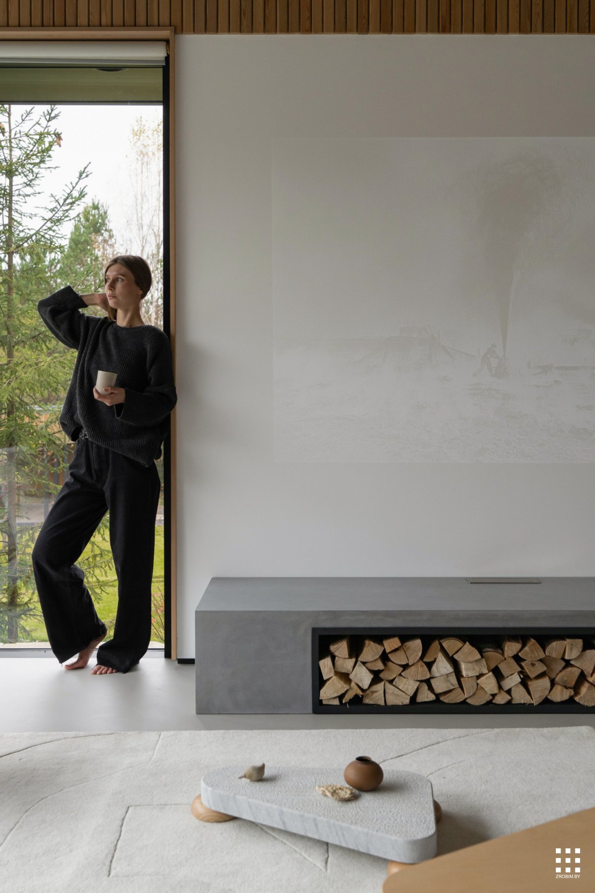Podłogę wykonano z materiału o chłodnym, szarym odcieniu, który wizualnie przypomina kamień i dopełnia naturalny charakter wnętrza. Taki kontrast między ciepłem drewna a surowością „kamiennej” powierzchni buduje równowagę i nowoczesny charakter aranżacji.