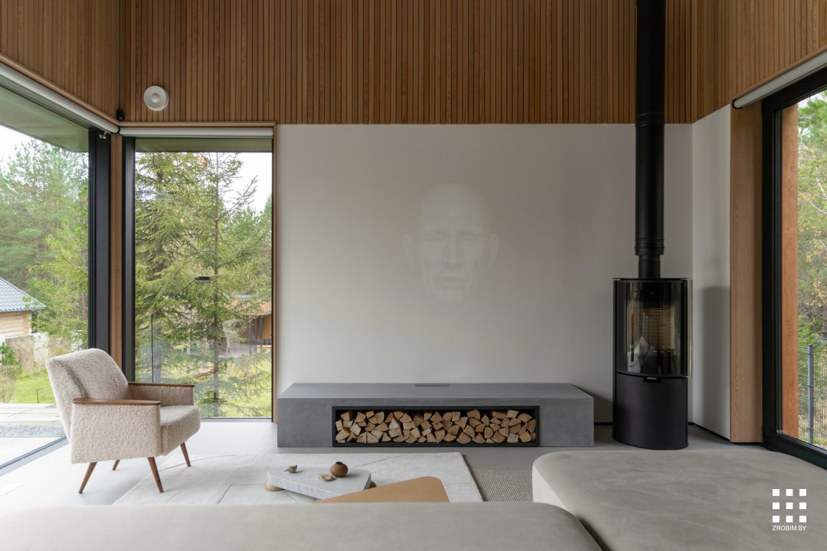 Głównym założeniem projektu było połączenie wnętrza domu z naturą. Architekci zastosowali paletę naturalnych barw – dominują odcienie zieleni, które pojawiają się m.in. w płytkach oraz fornirach. W zestawieniu z ciepłymi drewnianymi listwami tworzą one atmosferę przypominającą leśne otoczenie, jednocześnie ocieplając i uspokajając przestrzeń.