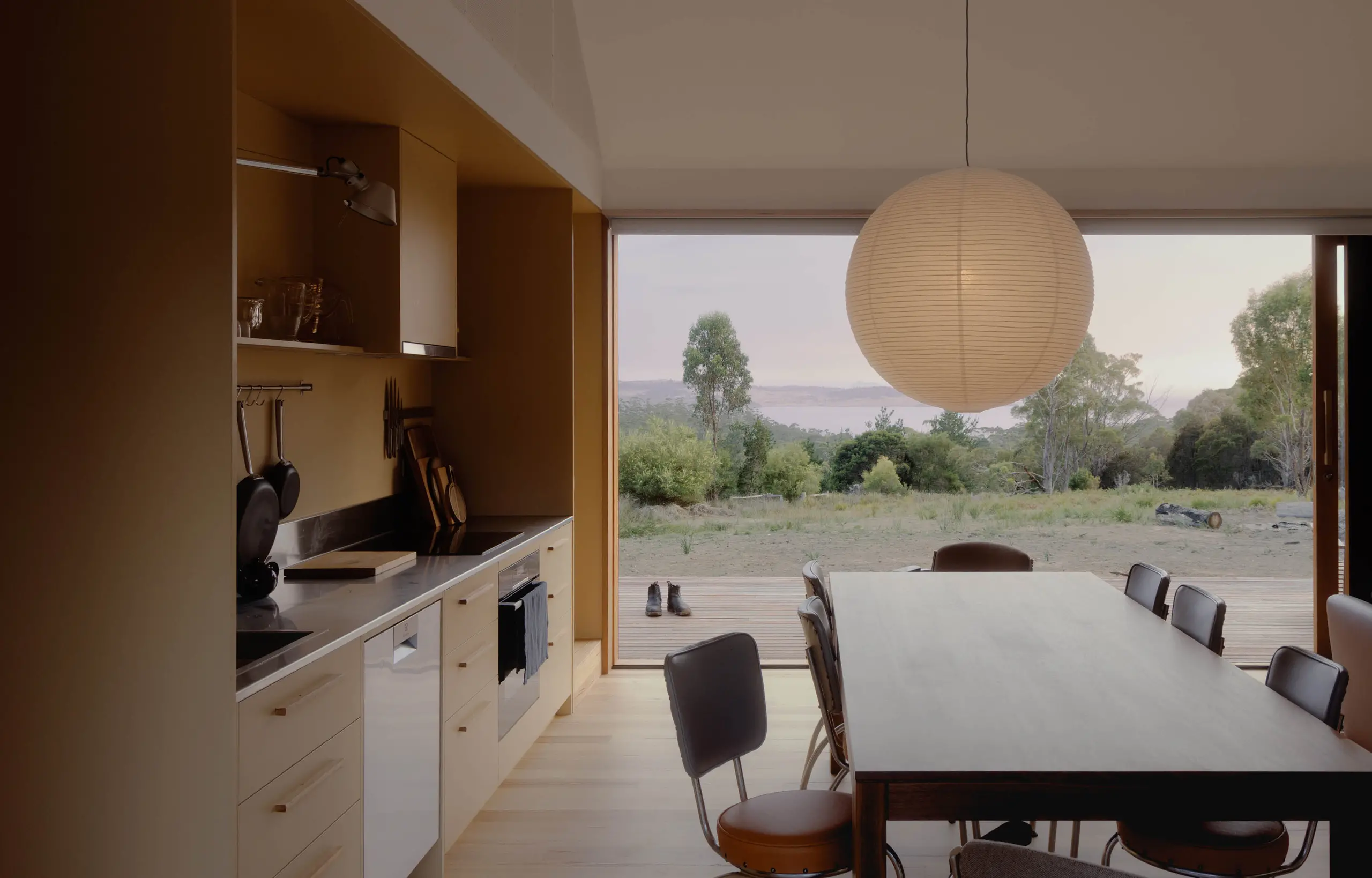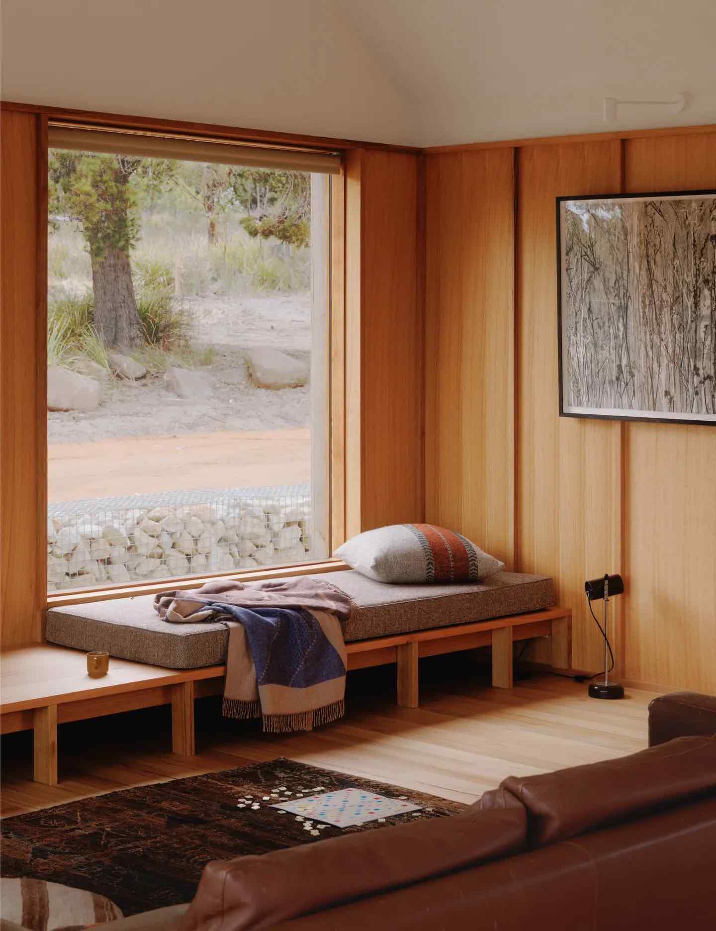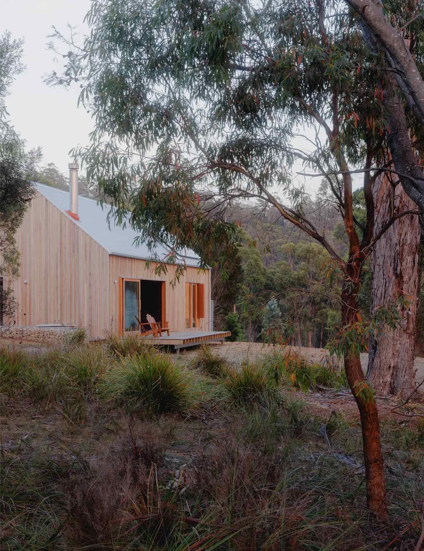 Okna obramowane tasmańskim dębem zostały rozmieszczone tak, by tworzyć ramy dla widoków w każdym kierunku – na las, na dziedziniec wejściowy i na szerokie, oceaniczne horyzonty. Wysunięty taras od północy unosi się nad urwistym terenem, stając się naturalnym punktem obserwacyjnym. Jak mówią architekci, jego krawędź to „miejsce, gdzie można usiąść i chłonąć zapach eukaliptusów, słuchać wiatru i czuć przestrzeń”.