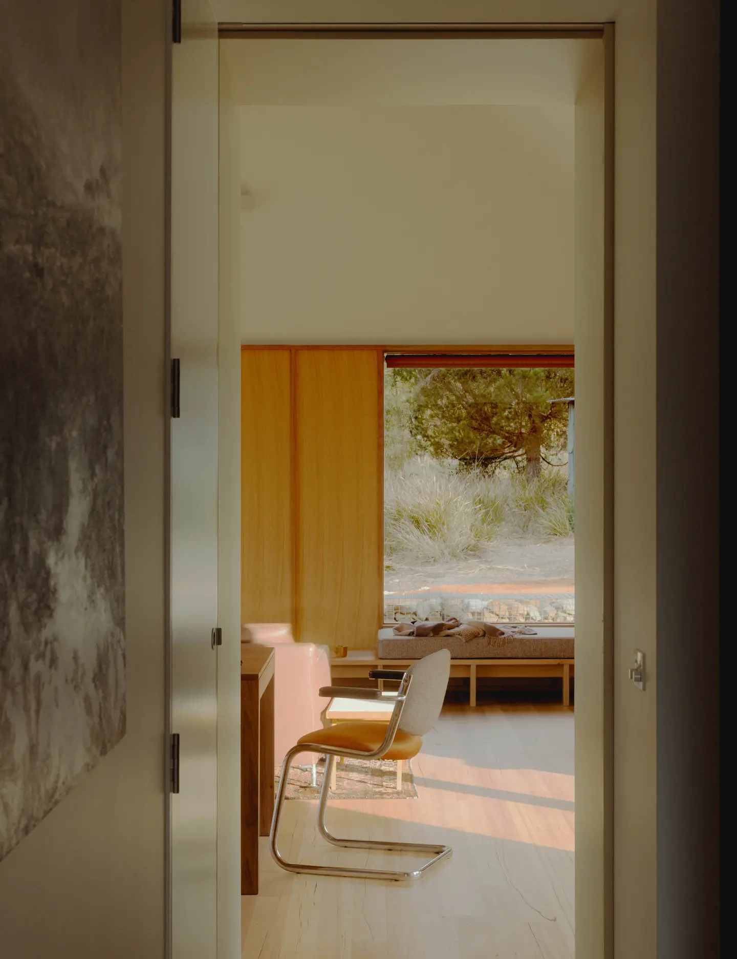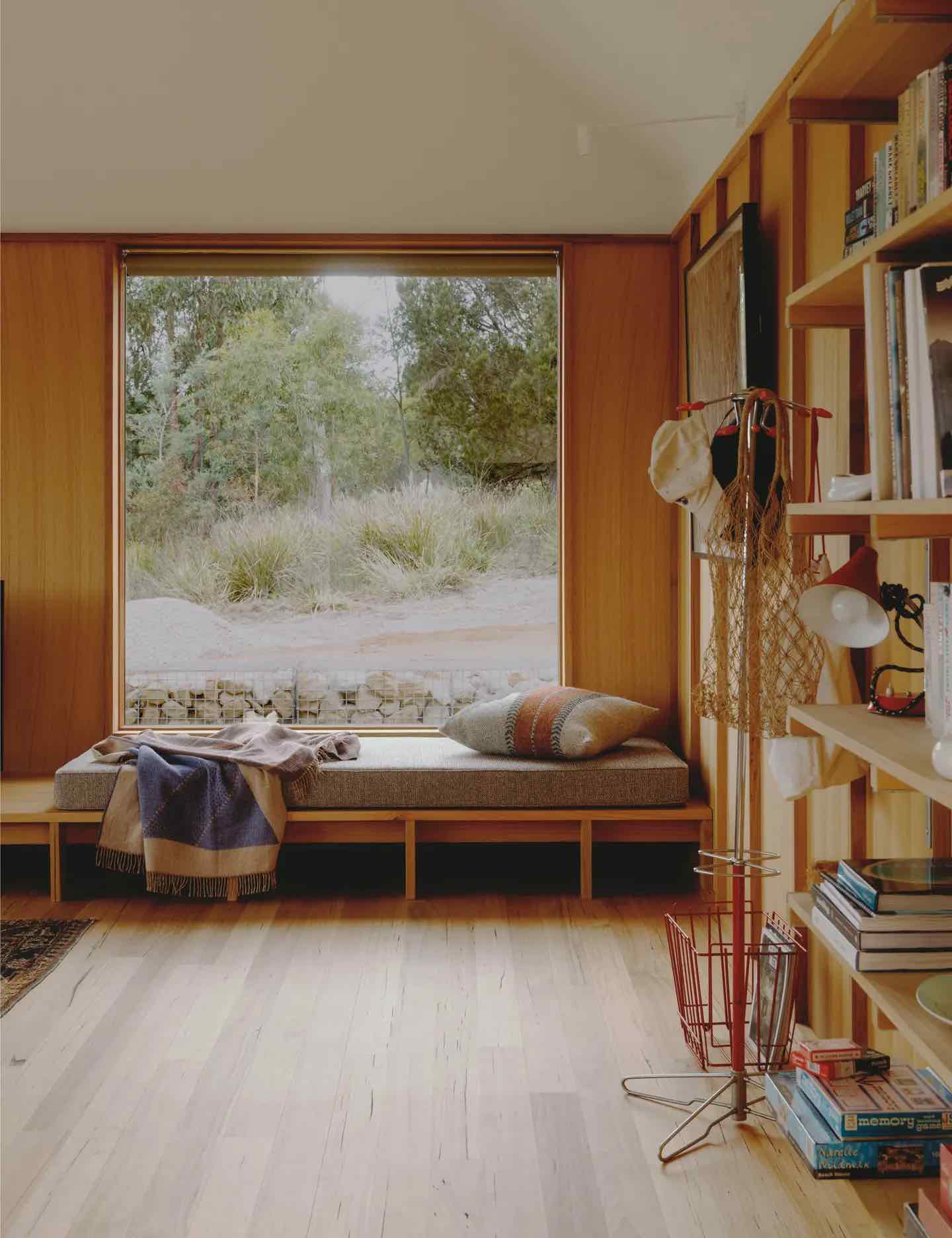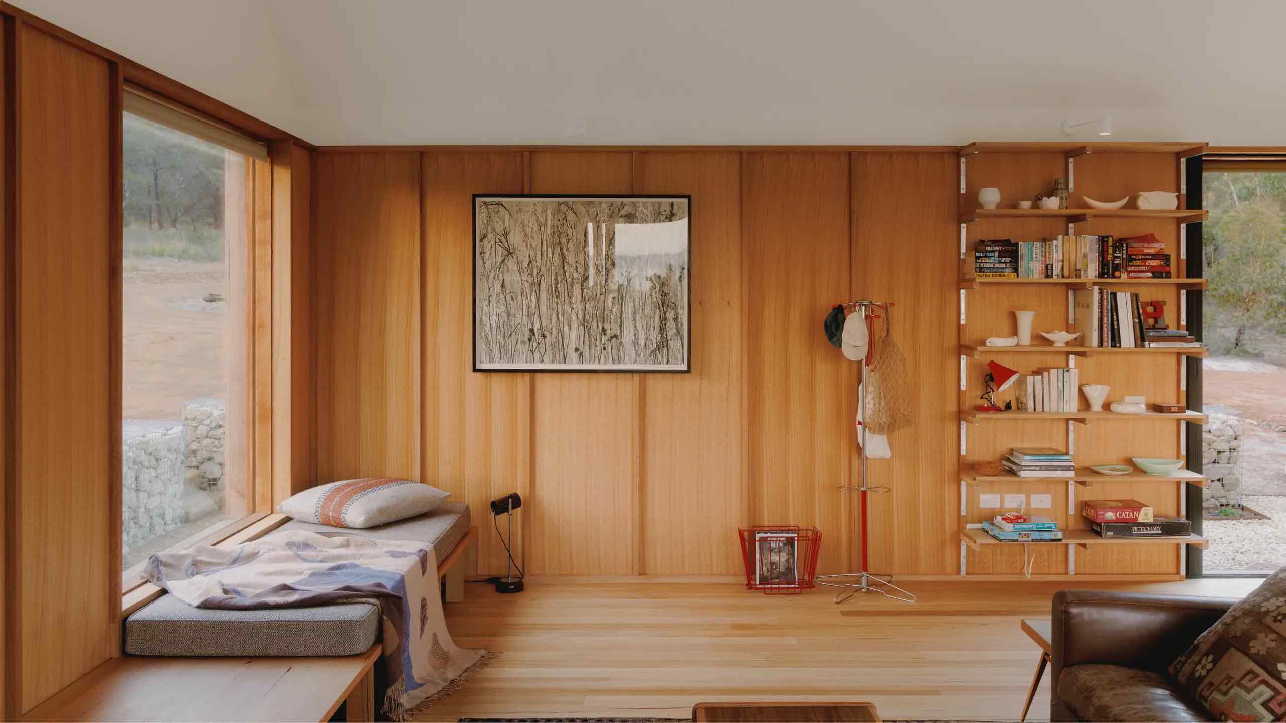 Okna obramowane tasmańskim dębem zostały rozmieszczone tak, by tworzyć ramy dla widoków w każdym kierunku – na las, na dziedziniec wejściowy i na szerokie, oceaniczne horyzonty. Wysunięty taras od północy unosi się nad urwistym terenem, stając się naturalnym punktem obserwacyjnym. Jak mówią architekci, jego krawędź to „miejsce, gdzie można usiąść i chłonąć zapach eukaliptusów, słuchać wiatru i czuć przestrzeń”.