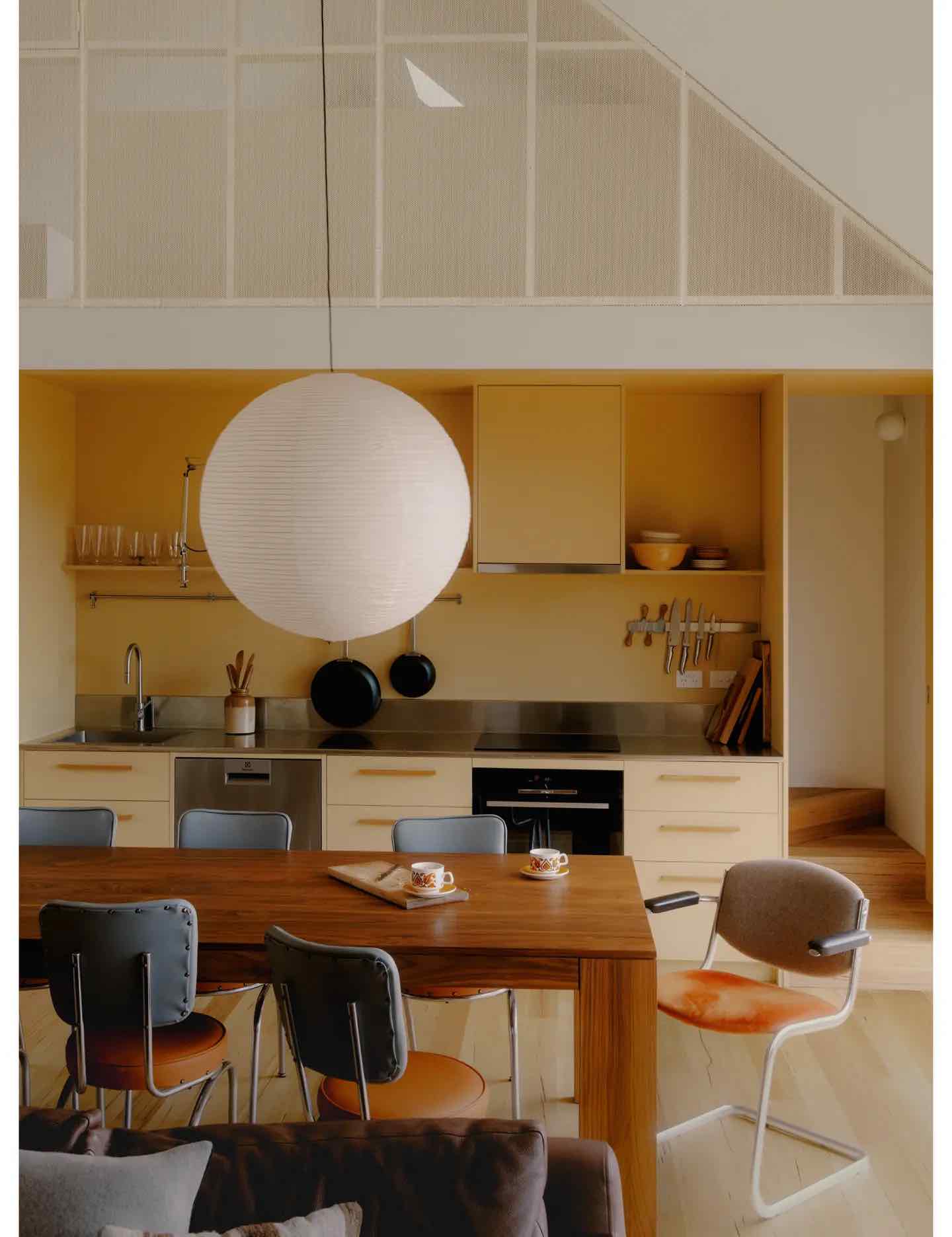 Wnętrze domu podzielono na dwie strefy. Skrzydło sypialni i łazienek mieści się na jednym końcu planu, oferując kameralność i poczucie schronienia. Część dzienna to przestronny, dwukondygnacyjny salon połączony z kuchnią i jadalnią, z którego rozciąga się panoramiczny widok na ocean. Między nimi znajduje się kuchenny rdzeń – szafa i zabudowa z forniru Laminex w kolorze Pale Honey, wprowadzająca do wnętrza ciepło i subtelne refleksy światła.
