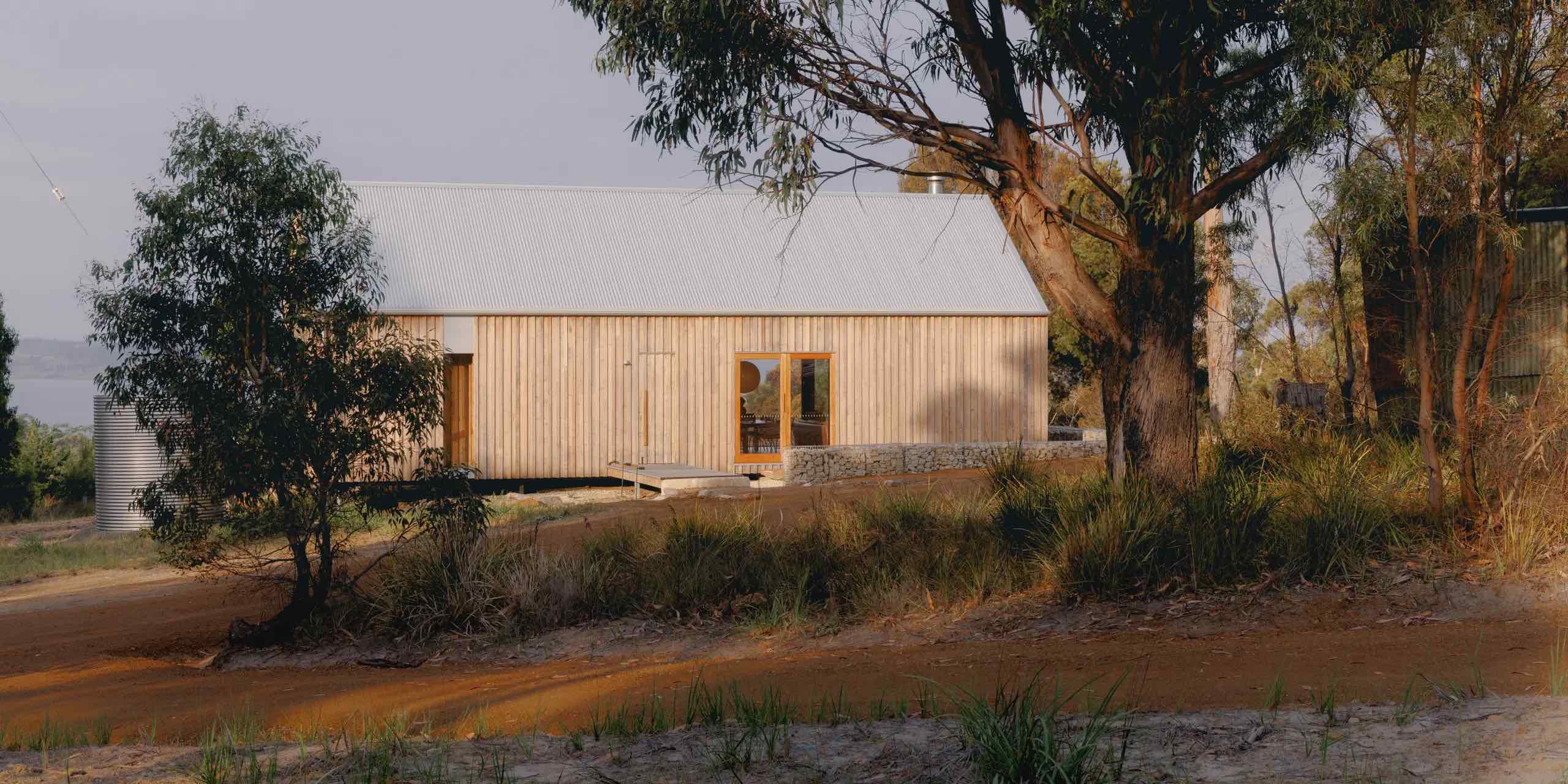 Fasady domu pokryto pionową okładziną z lokalnego eukaliptusa niebieskiego (blue gum). Drewno to reaguje na pogodę – po deszczu ciemnieje, a z czasem patynuje, wtapiając się w kolorystykę nadmorskiej roślinności. Dach o klasycznej, dwuspadowej formie i prosta sylweta budynku przywołują skojarzenia z tradycyjnymi chatami regionu, ale detale i proporcje zdradzają współczesną wrażliwość projektową.