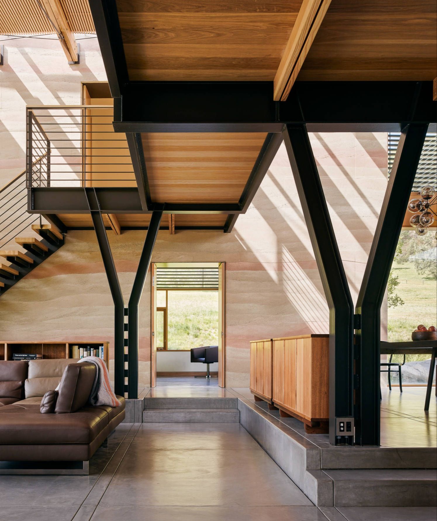 We wnętrzu kluczową rolę odgrywa drewno, które w połączeniu z chłodniejszymi materiałami, takimi jak beton czy stal, skutecznie ociepla odbiór przestrzeni. Naturalne wykończenia nie tylko podnoszą komfort użytkowania, ale także wzmacniają wizualne i emocjonalne powiązanie domu z otaczającym środowiskiem. Kontrast pomiędzy surowymi, nowoczesnymi powierzchniami a ciepłem drewna tworzy spójną, zrównoważoną estetykę, charakterystyczną dla współczesnych domów jednorodzinnych projektowanych w duchu minimalizmu i świadomej architektury. Całość stanowi przykład przemyślanego projektu, w którym krajobraz, materiały i światło współtworzą jakość codziennego życia.