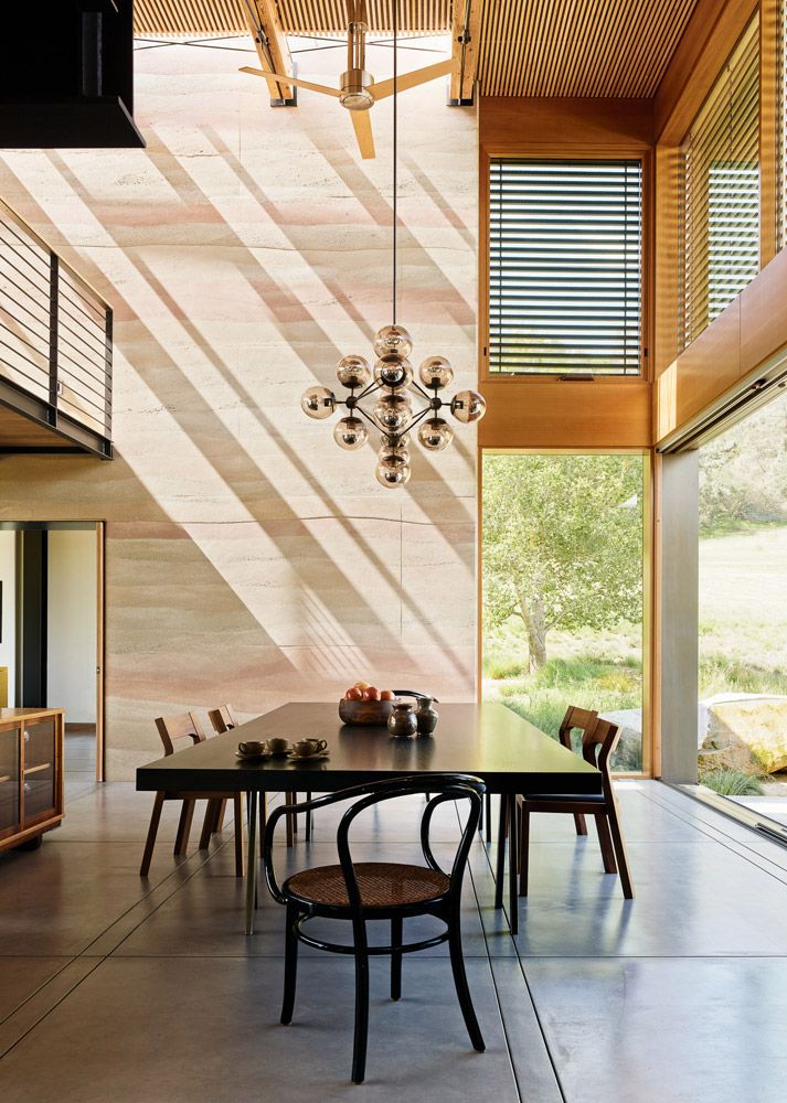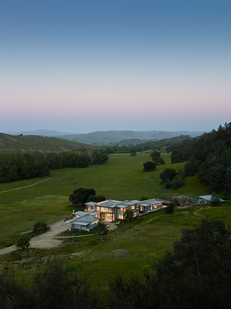 Budynek wyrasta u podstawy rozległego wzgórza, harmonijnie wpisując się w naturalne ukształtowanie terenu i otwierając się na rozległe, wschodnie widoki. Takie usytuowanie domu pozwala maksymalnie wykorzystać poranne światło dzienne, które naturalnie doświetla wnętrza i podkreśla ich relację z krajobrazem. Bryła domu została zaprojektowana w sposób prosty i czytelny, a jej forma – inspirowana archetypem, jaki reprezentuje nowoczesna stodoła – nie dominuje nad otoczeniem, lecz stanowi jego spokojne dopełnienie. Architektura krajobrazowa, orientacja budynku oraz otwarcia widokowe wspólnie budują poczucie bliskości natury i kontaktu z otwartą przestrzenią.