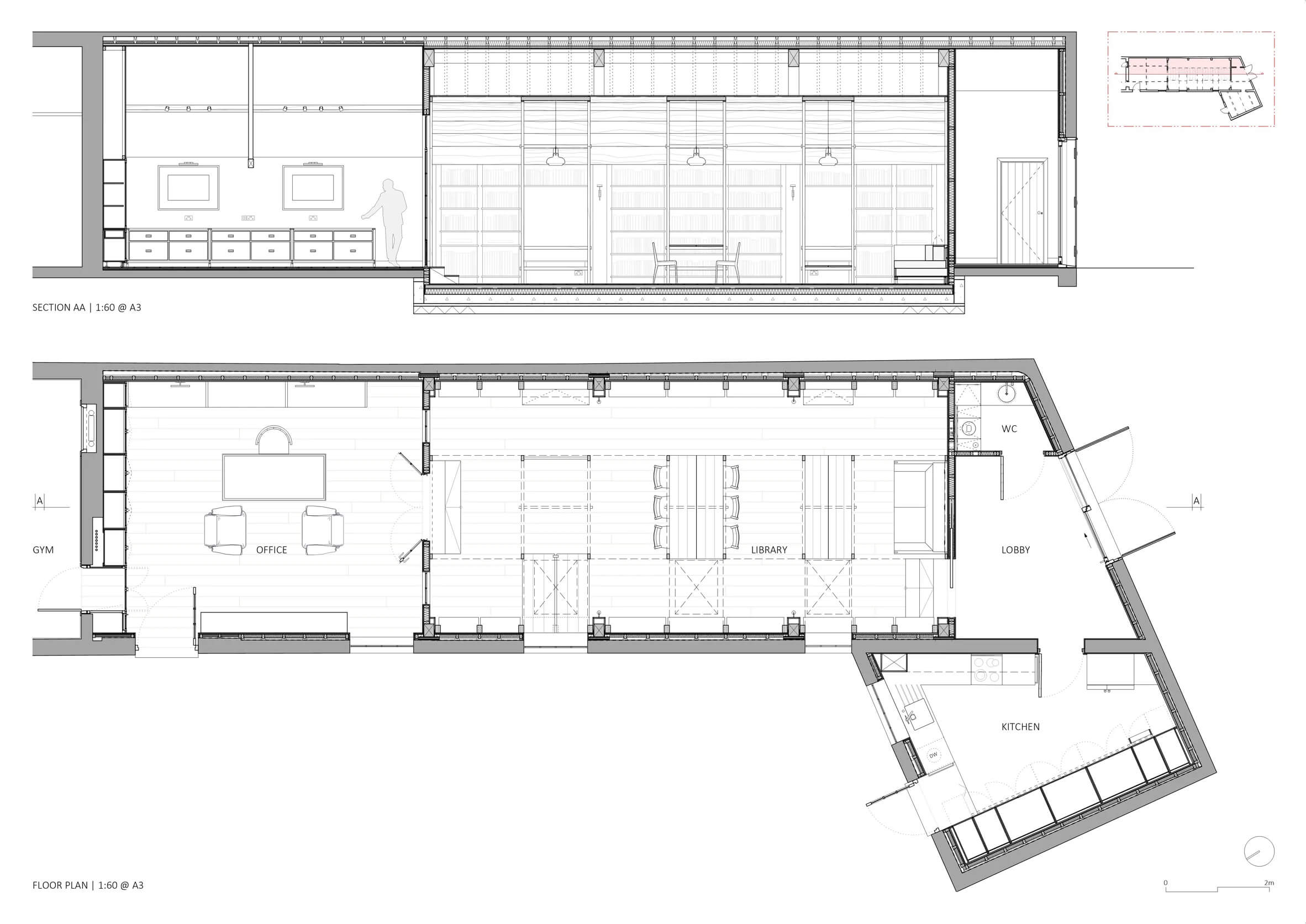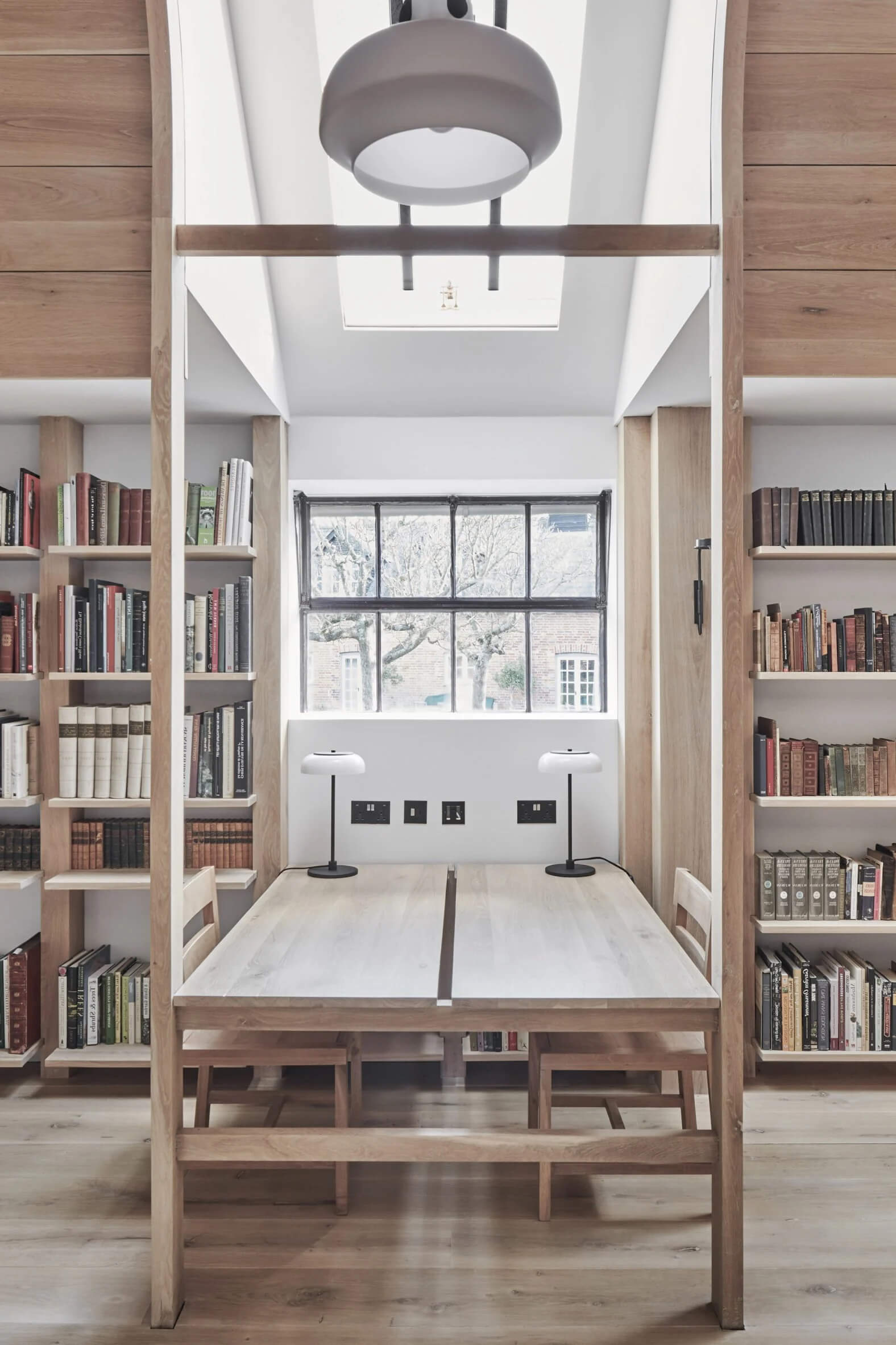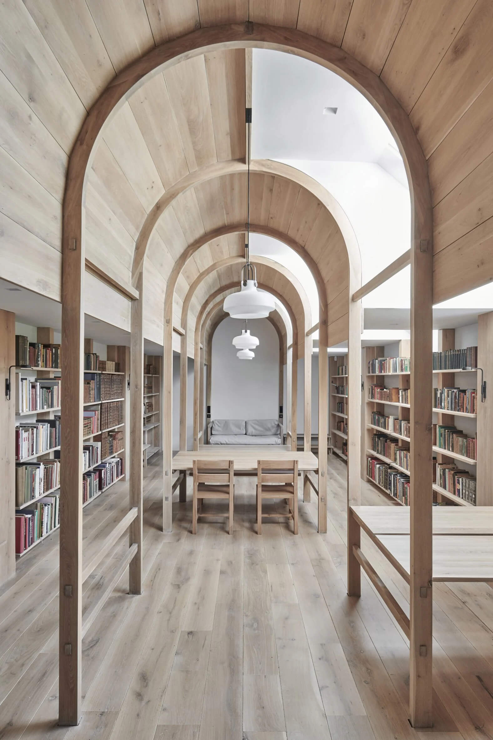 Centralnym punktem wnętrza jest drewniana arkada, inspirowana klasyczną architekturą palladiańską, która nawiązuje do kolekcji książek właściciela. Biblioteka mieści „nawę” z miejscami do siedzenia pomiędzy półkami na książki, wykonanymi z litego dębu. Biurka ustawiono tak, by maksymalnie wykorzystać światło z okien, a wieczorem przestrzeń doświetlają duże lampy wiszące.