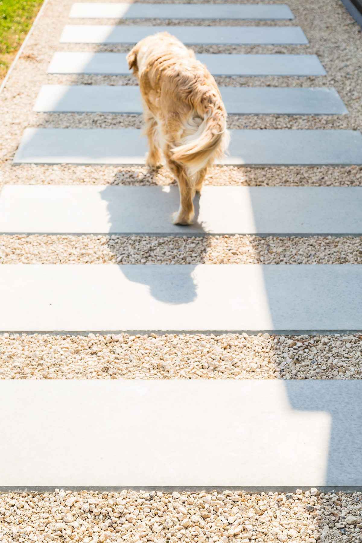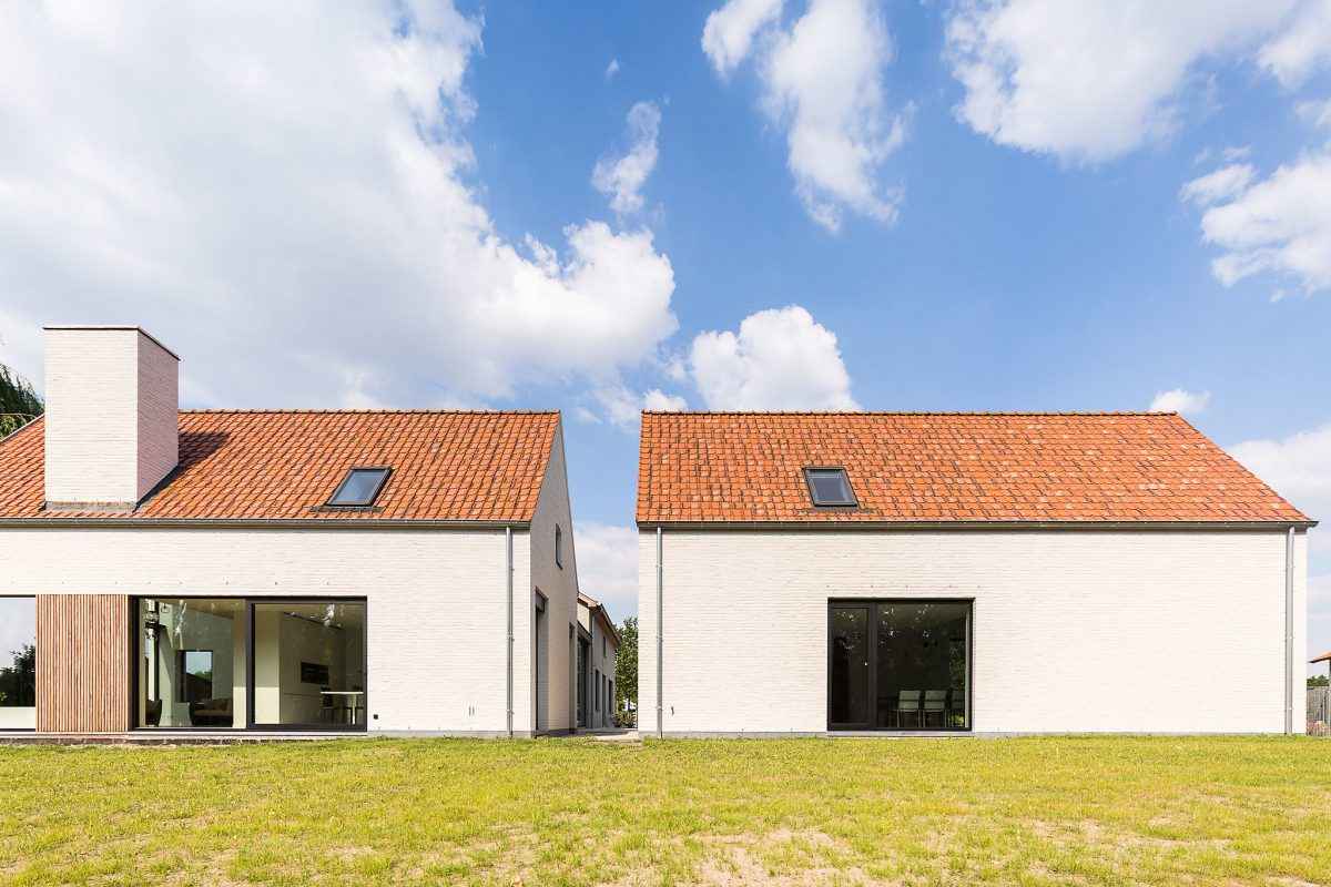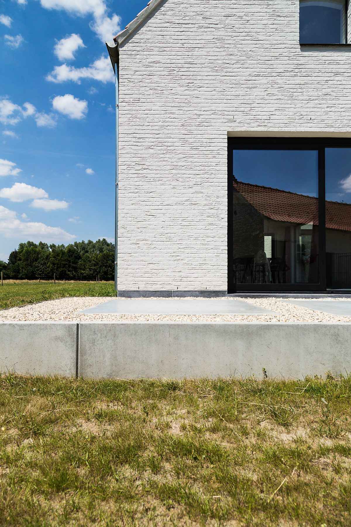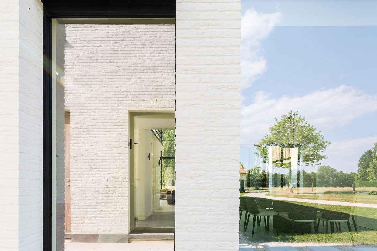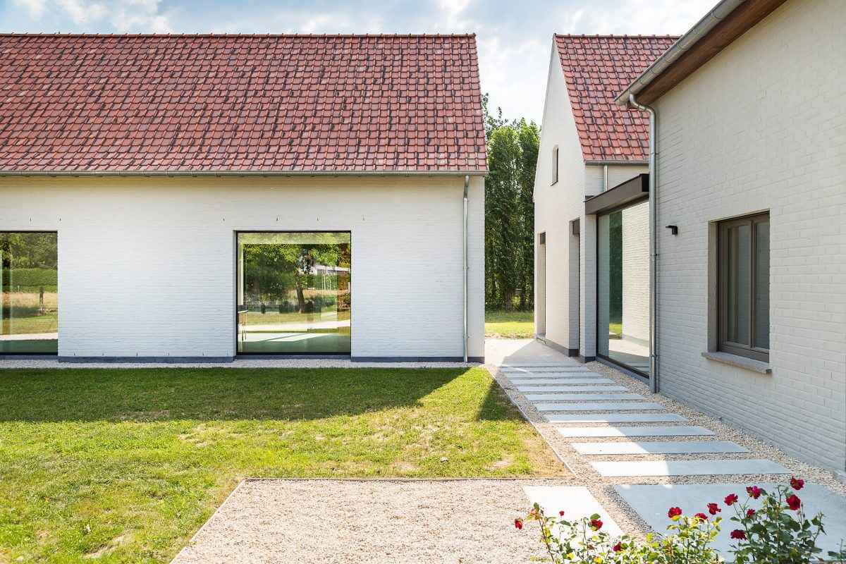 W koncepcji projektowej zachowano kubaturę i typologię flamandzkiej zabudowy, jednak rozdzielono bryły głównego domu i oficyny, wyrównując je w jednej linii, co zapewnia wizualną spójność i rytm kompozycji. Połączenie tych dwóch części zrealizowano poprzez przeszkloną centralną przestrzeń, pełniącą funkcję jadalni. To miejsce stało się sercem domu – przejrzystym, jasnym i otwartym na krajobraz. Takie rozwiązanie pozwala na naturalne przenikanie światła i natury do wnętrza, a jednocześnie subtelnie oddziela strefy użytkowe.