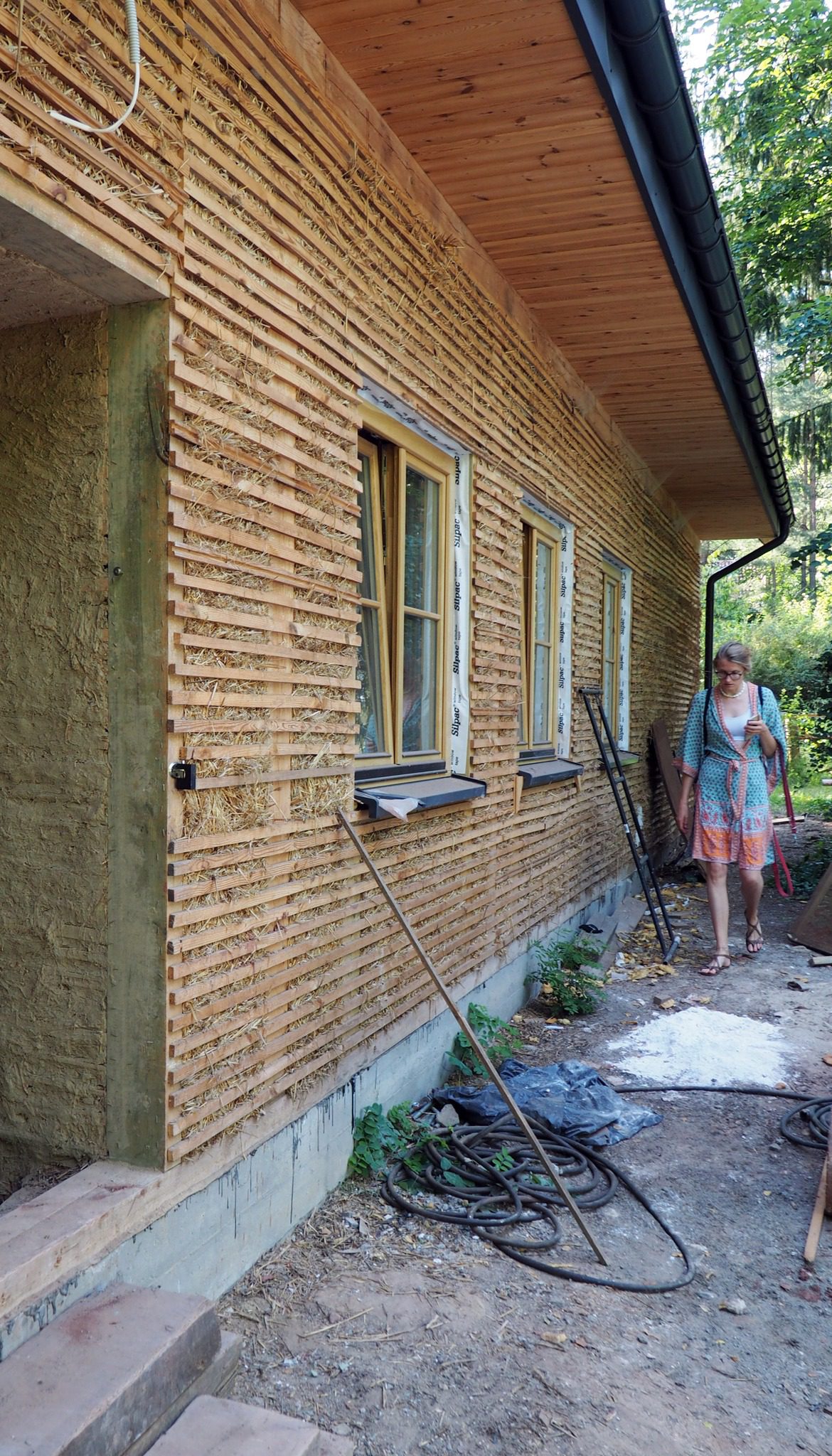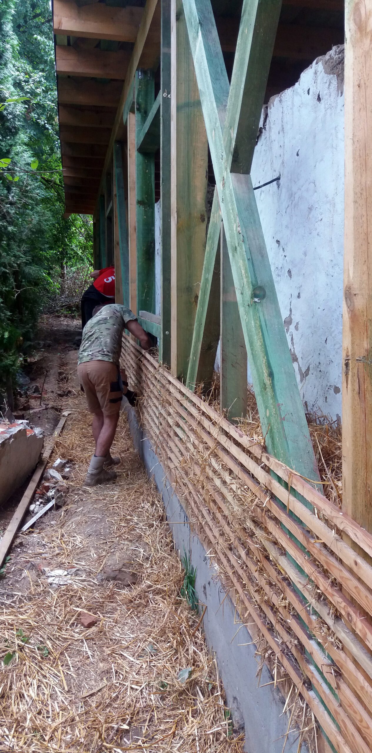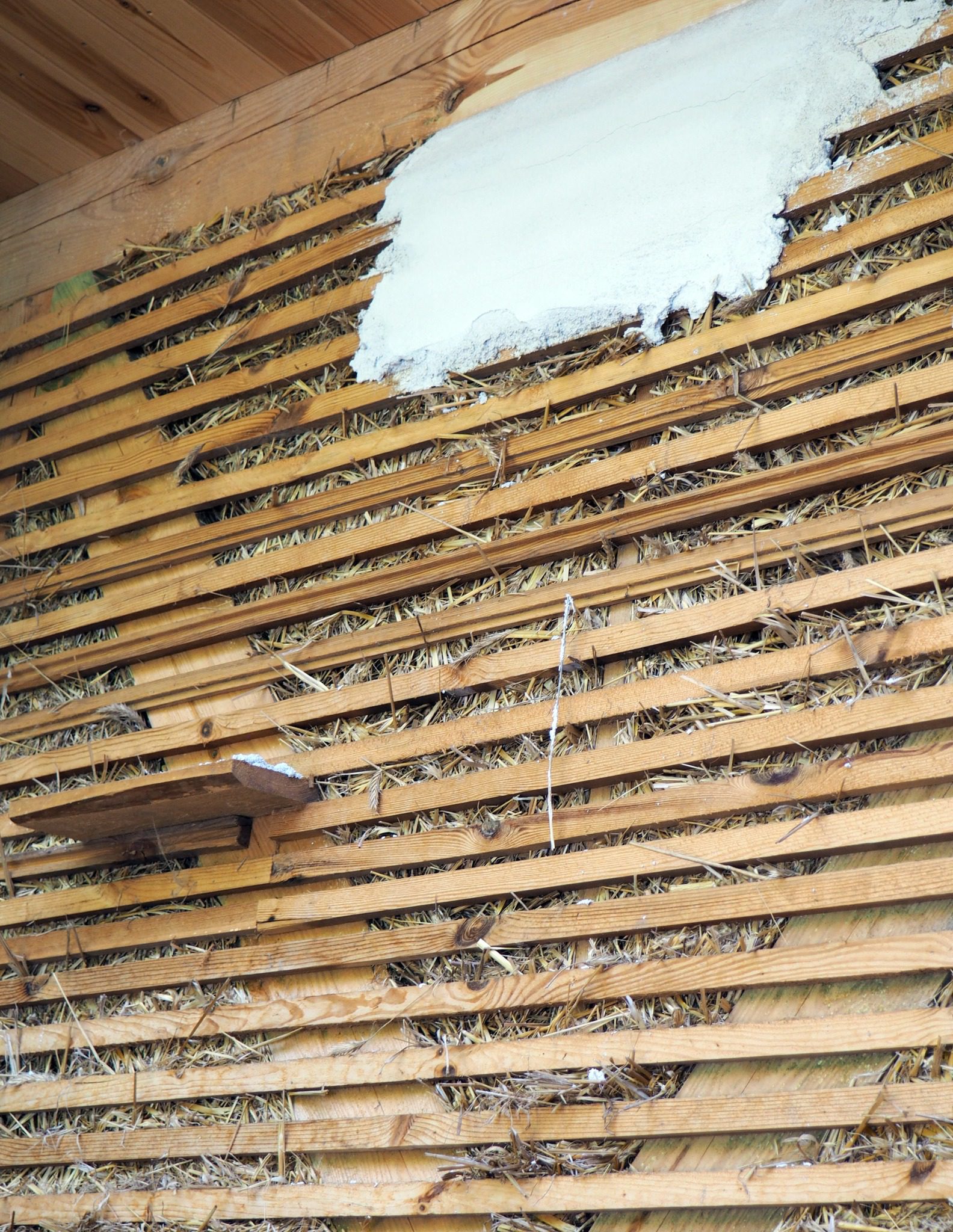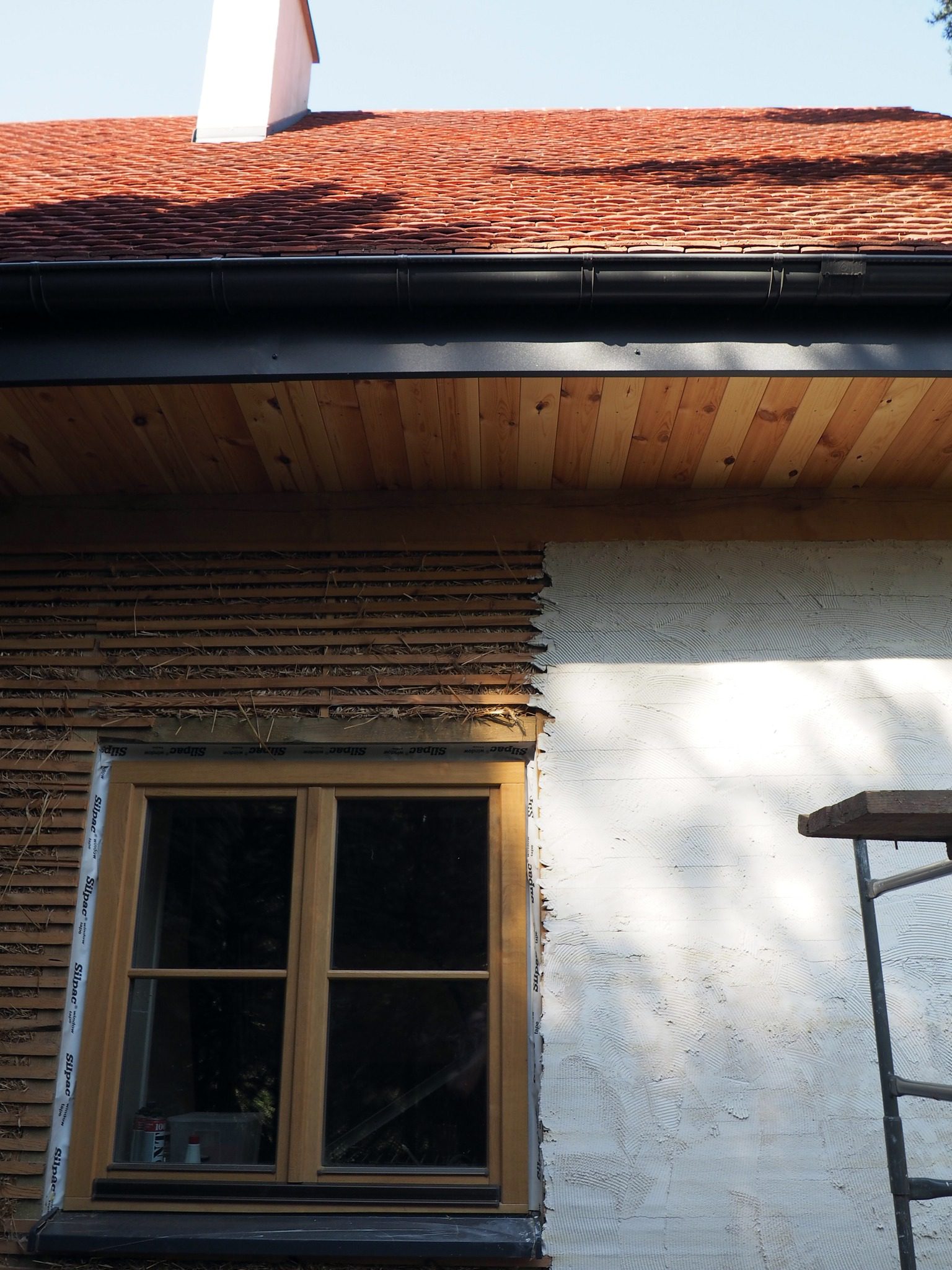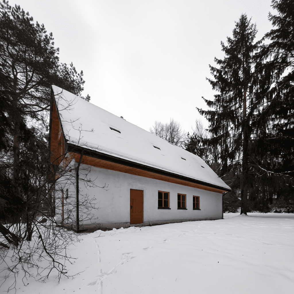 Po osuszeniu, wzmocnieniu i poszerzeniu istniejących fundamentów wprowadzono nową, niezależną konstrukcję drewnianą, która przejęła ciężar stropu i dachu. Przestrzeń powstała pomiędzy nią a historycznymi murami, osłonięta głębokimi okapami, została wypełniona sprasowaną słomą. Całość wykończono grubą warstwą oddychającego tynku wapiennego, nadającego elewacjom miękki, organiczny charakter, przywodzący na myśl tradycyjną architekturę polskich dworów.
