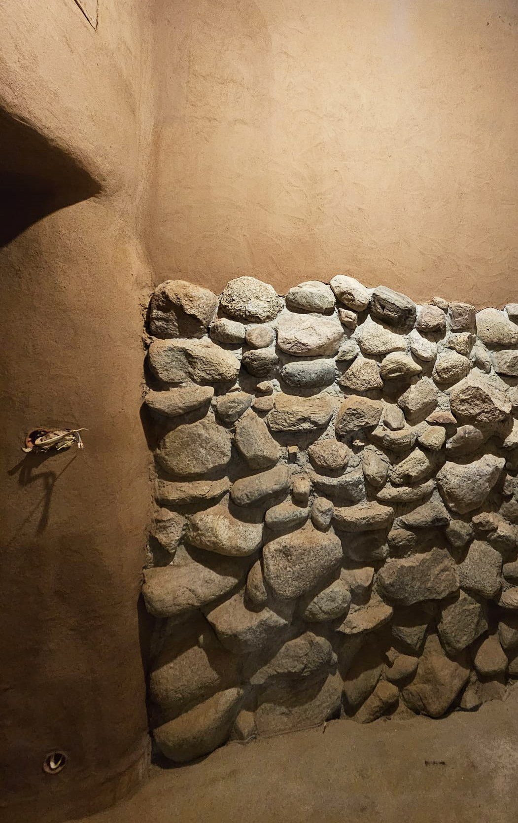 Zastosowanie naturalnych, paroprzepuszczalnych materiałów izolacyjnych od zewnątrz pozwoliło wyeksponować we wnętrzach fragmenty oryginalnych ścian z gliny, kamienia i cegły. Ich nieregularność i surowa struktura zostały subtelnie podkreślone tynkiem glinianym, który dopełnia całość bez ingerowania w autentyczność materiału.