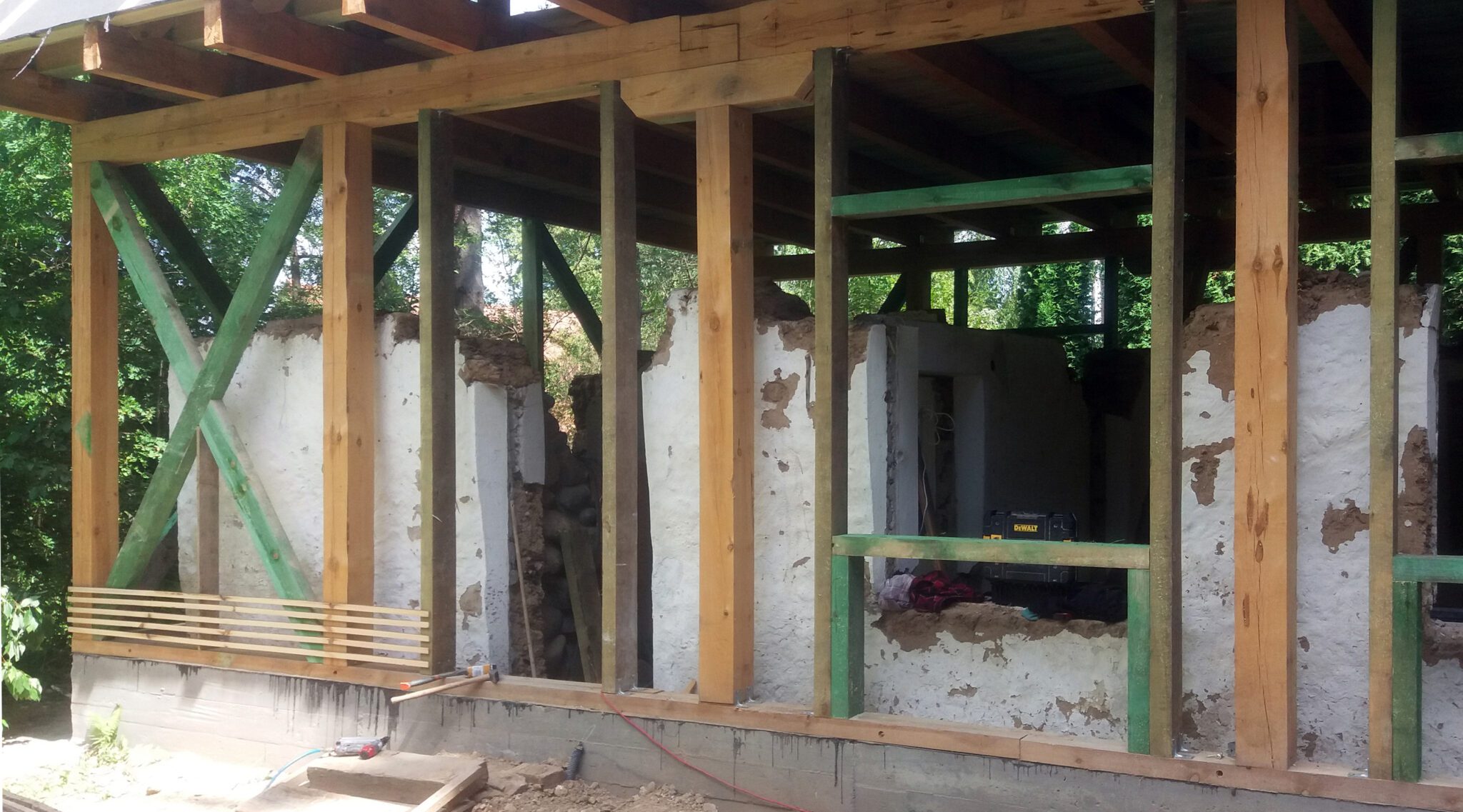 konstrukcja: istniejące fundamenty oraz mury ceglano-kamienne + nowa, niezależna konstrukcja drewniana ścian i dachu