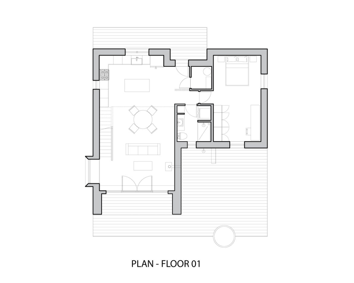 Stella House to przykład zrównoważonego rozwoju, w którym dbałość o szczegóły i jakość materiałów gra kluczową rolę. W sypialni na piętrze znajdują się duże świetliki, które poszerzają przestrzeń, zalewając wnętrze naturalnym światłem. Latem południowa weranda skutecznie zacienia wnętrza, a zimą przepuszcza promienie słoneczne, ogrzewając pomieszczenia i tworząc komfortowy mikroklimat.
