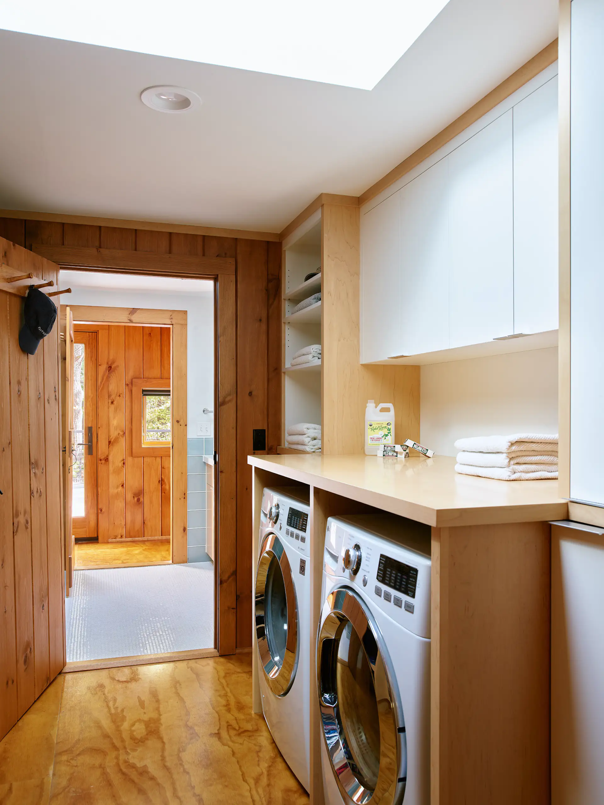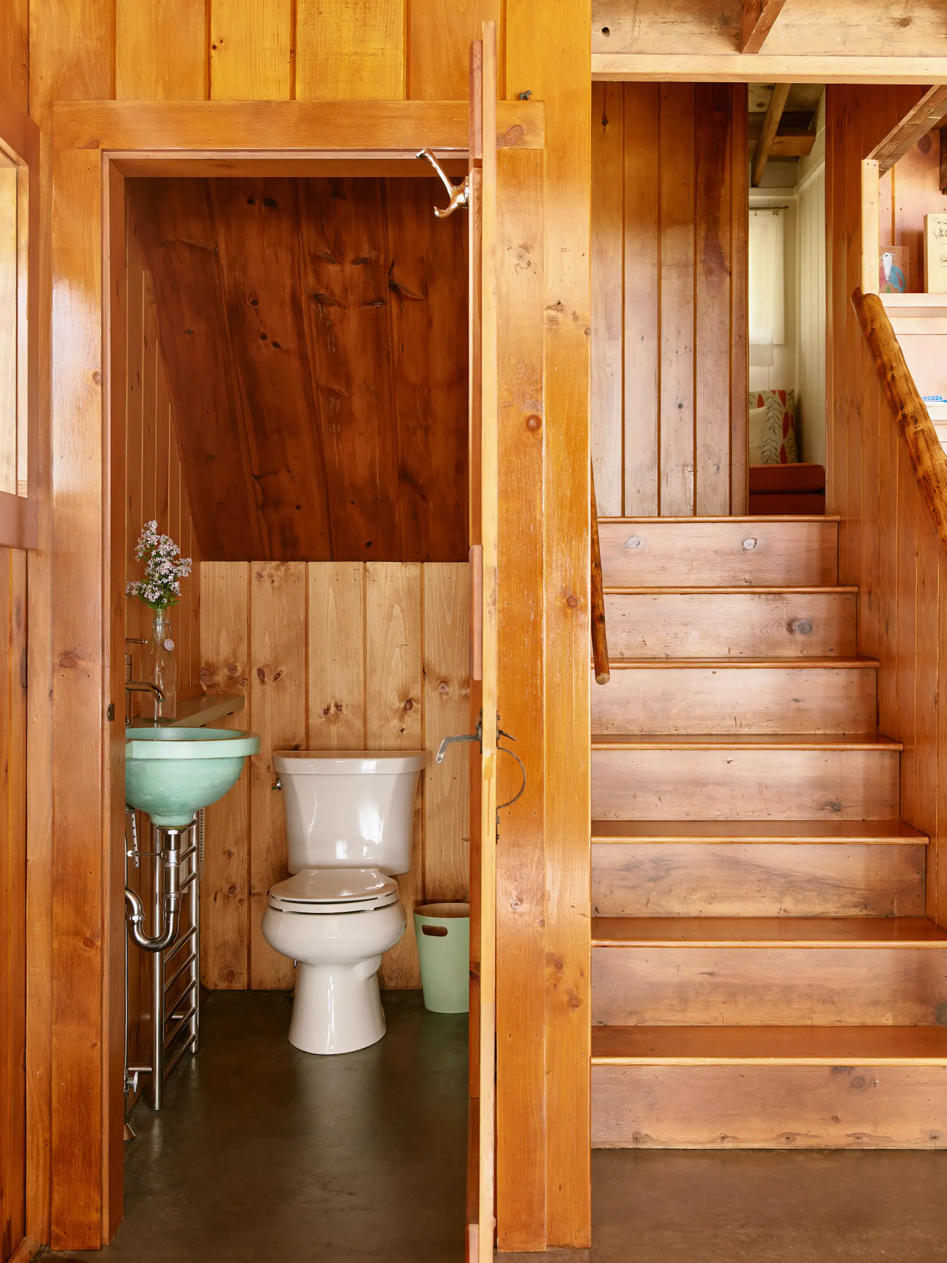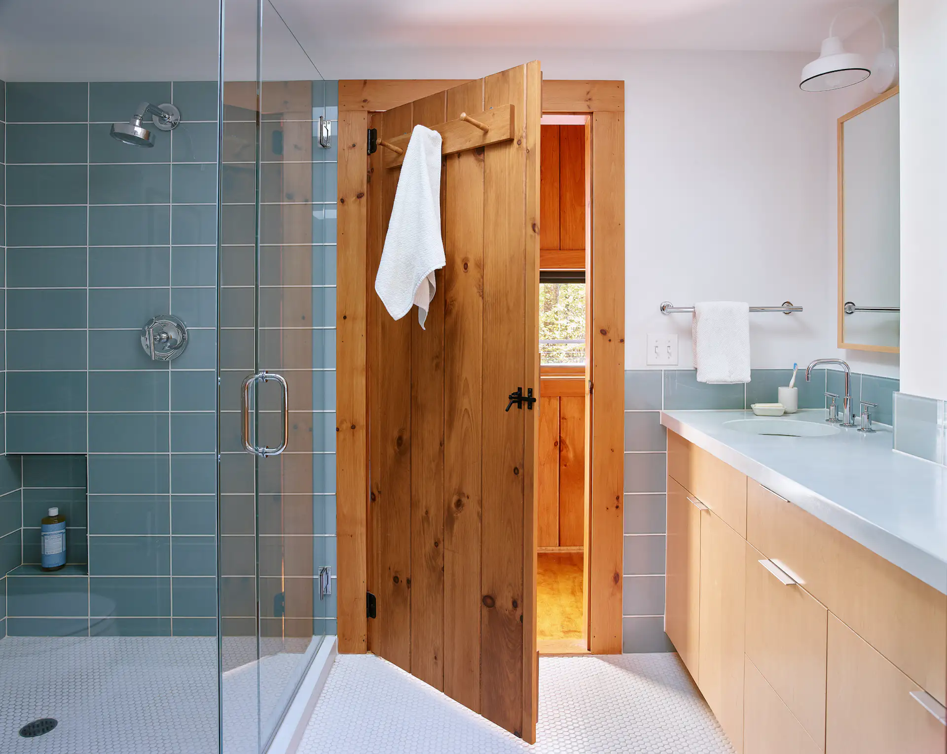 Wnętrza zostały wzbogacone o kilka kluczowych elementów. Architektka usunęła podwieszany sufit, ukazując drewniane belki stropowe, a przewody świateł szynowych zostały sprytnie ukryte, co wprowadziło bardziej przestronną atmosferę. Nowa główna łazienka z niestandardową toaletką z klonu oraz białym betonowym blatem, a także płytki ceramiczne w stylu Moonbeam, dodają elegancji, łącząc współczesny design z rustykalnym stylem.