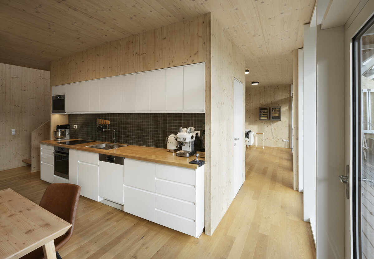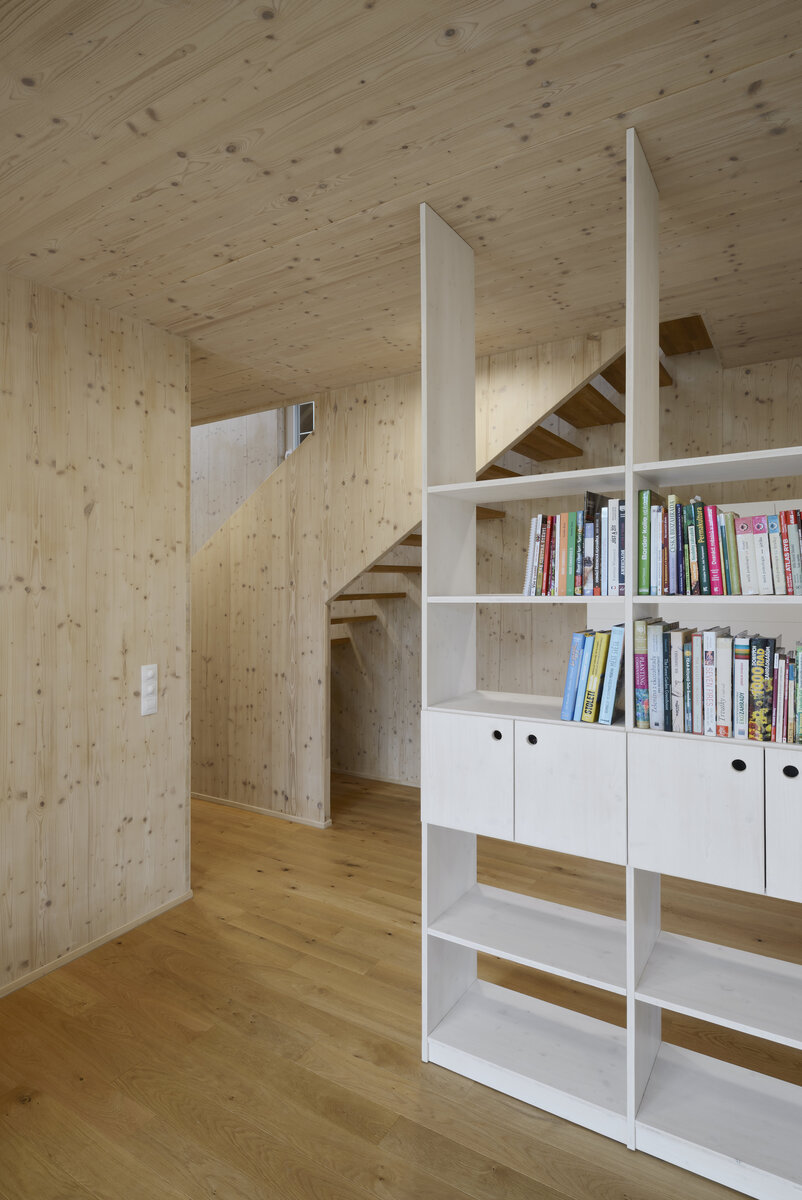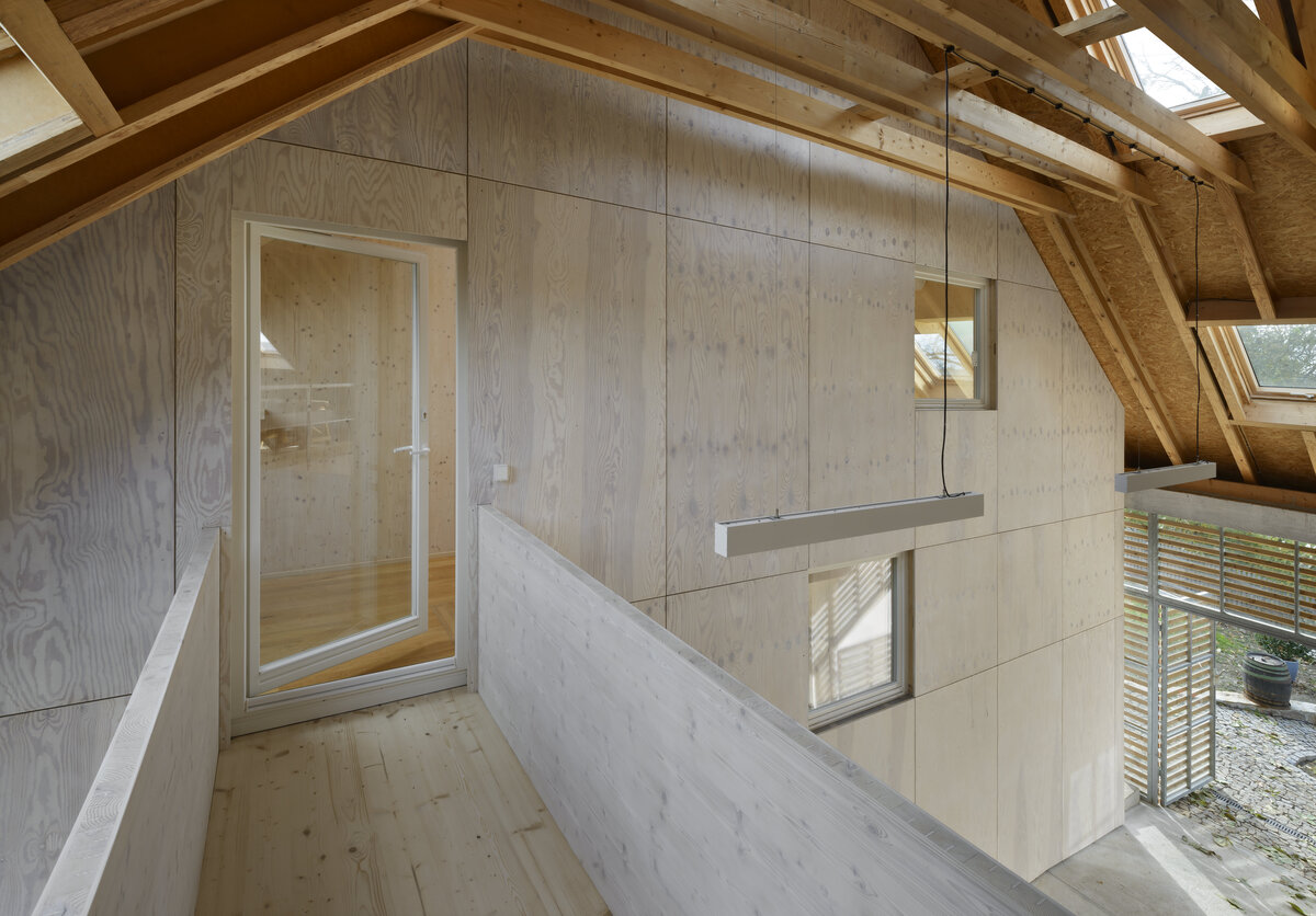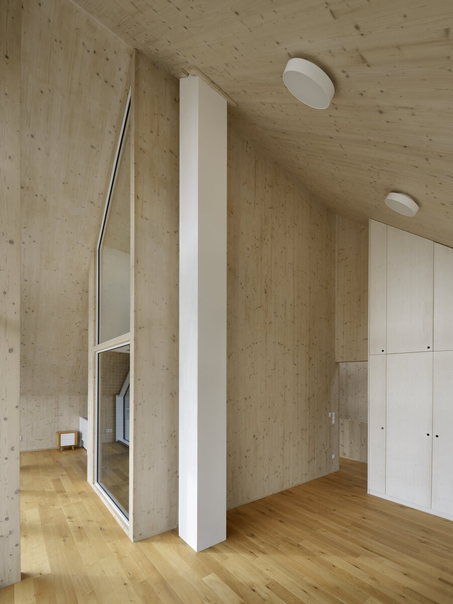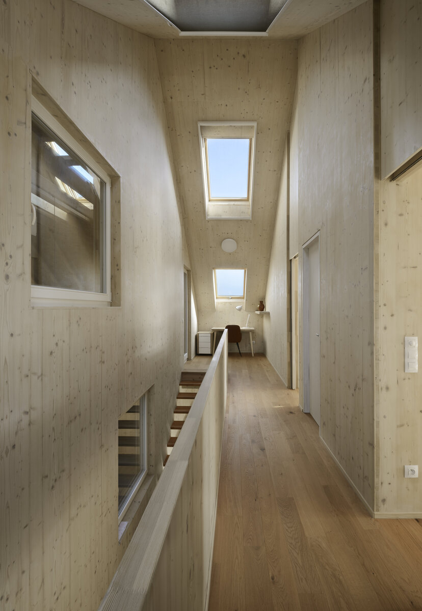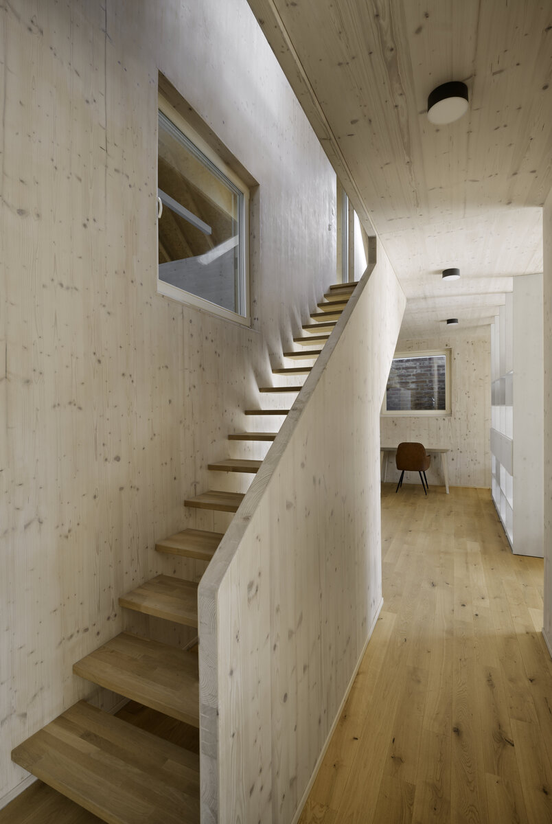 Przestrzenie mieszkalne rozmieszczone są wokół wewnętrznego rdzenia, w którym na parterze zlokalizowane są usługi budynku, a na piętrze łazienka. Z piętra można wyjść także poprzez szeroki taras. Dzięki temu, że fasada jest chroniona przed widokami, ze wszystkich części mieszkalnych i sypialnych, a zwłaszcza łazienki, roztacza się imponujący widok na okolicę.
