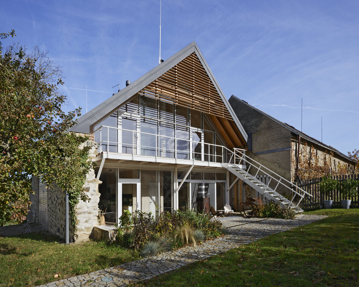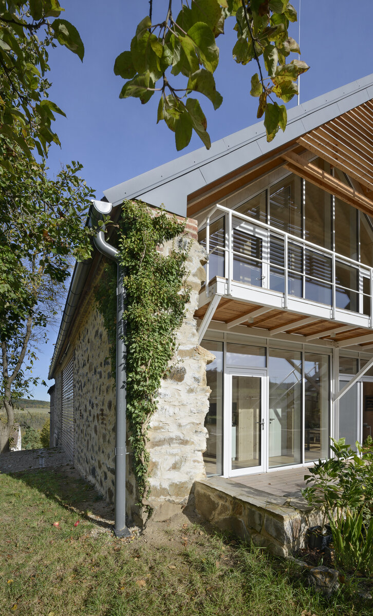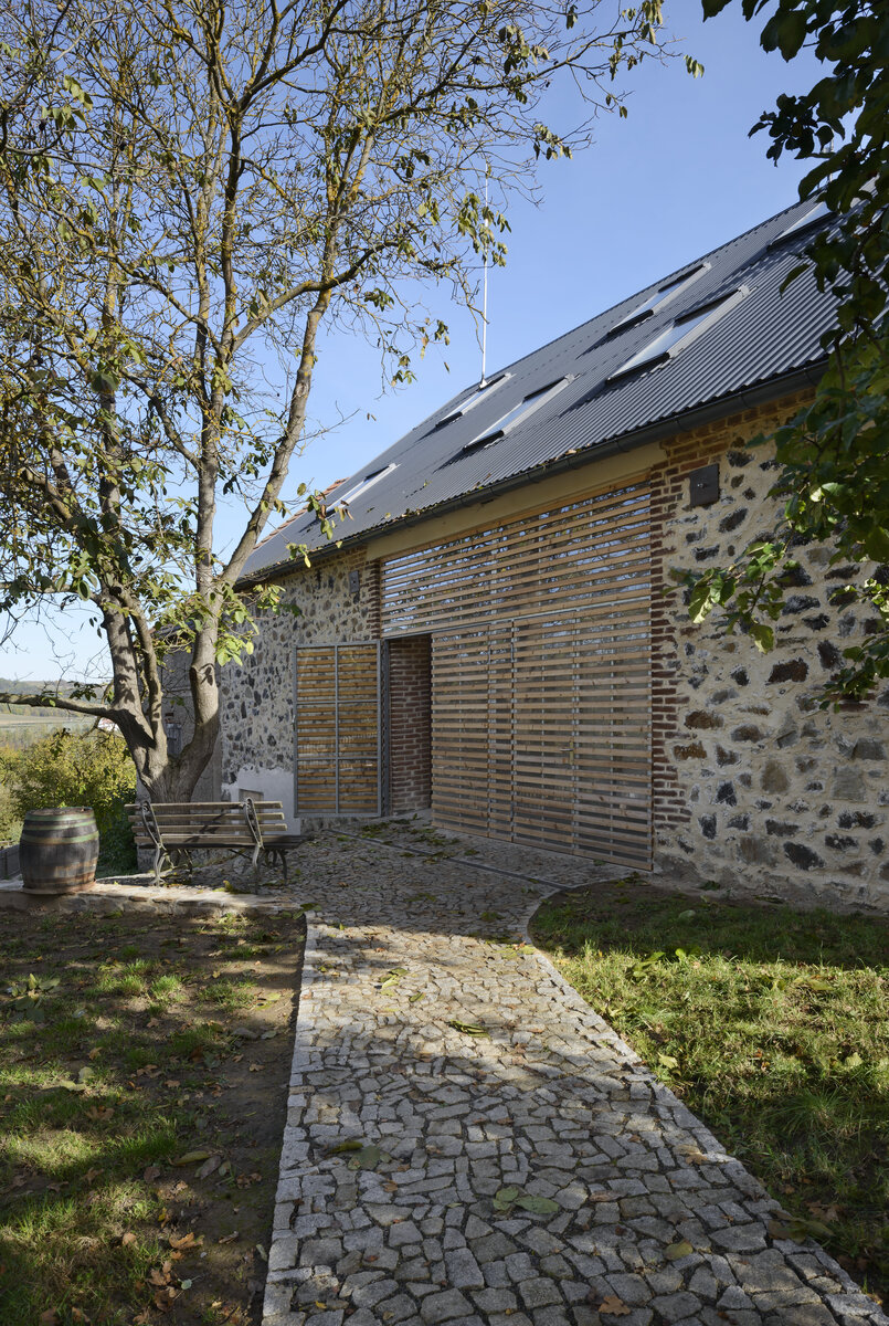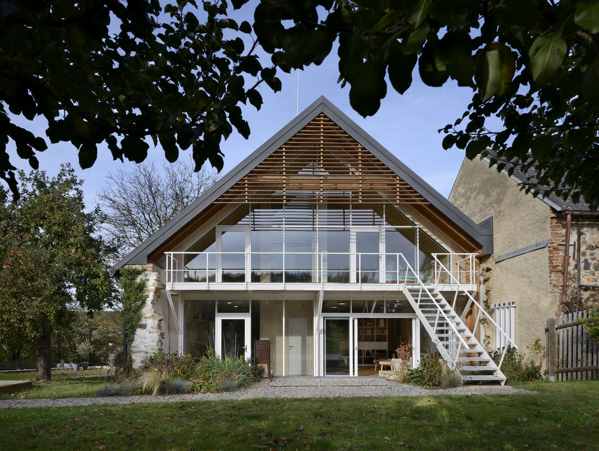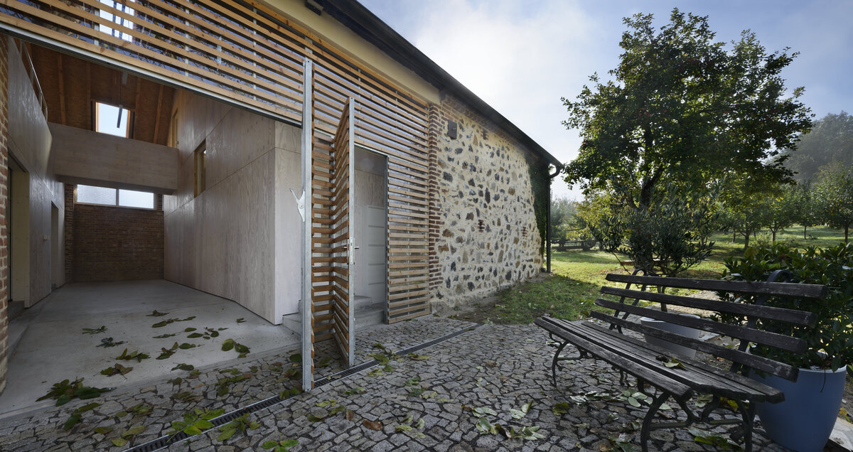 Istniejący budynek stodoły, wybudowany prawdopodobnie pod koniec XIX w., zbudowany został z solidnych ścian z kamienia. Wyburzono jedną ze ścian szczytowych, aby otworzyć widok na ogród i wpuścić odpowiednią ilość światła. Pomiędzy istniejącymi ścianami umieszczono nową konstrukcję z litego drewna, bez konieczności gruntownego izolowania muru.