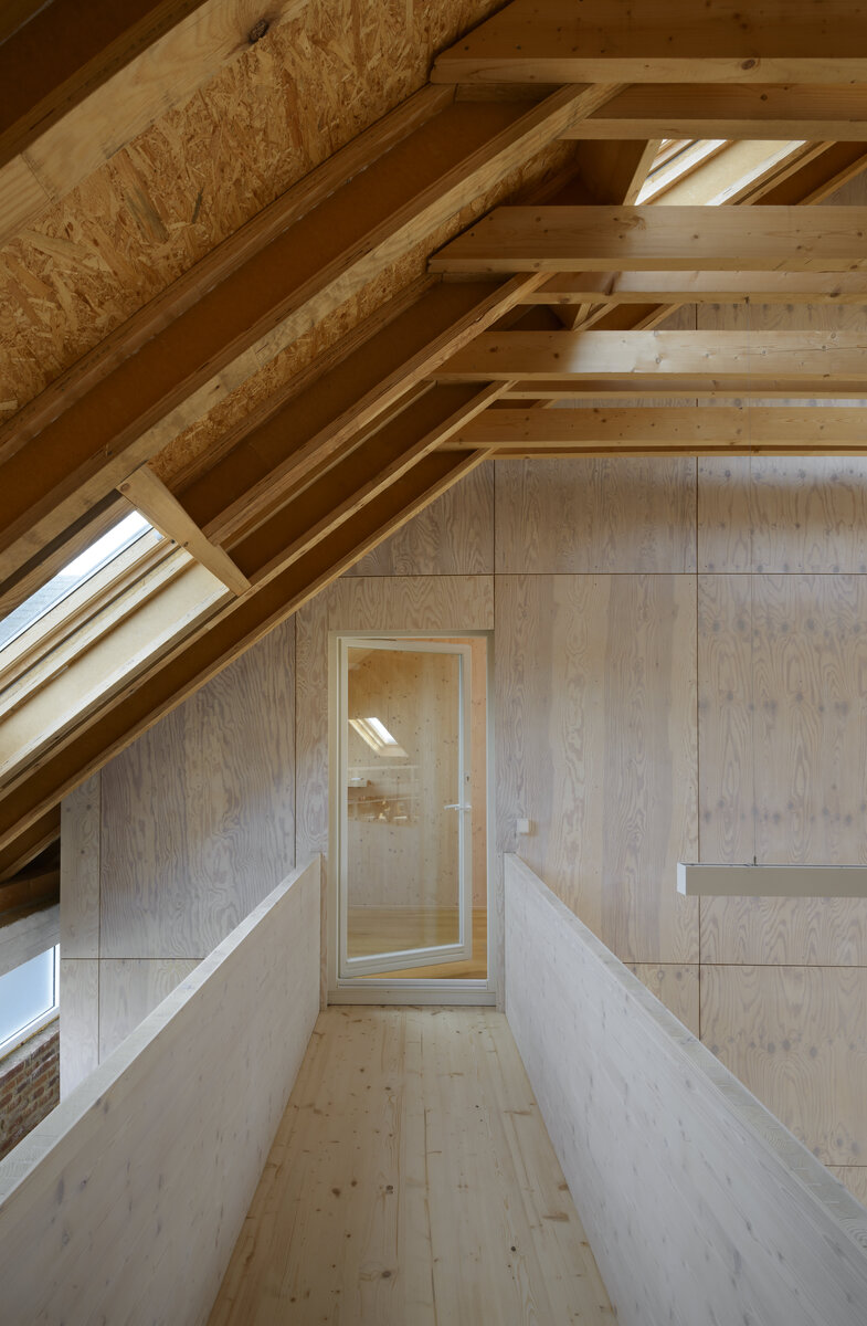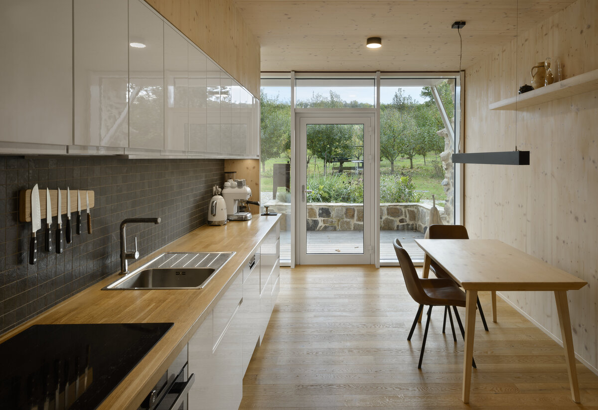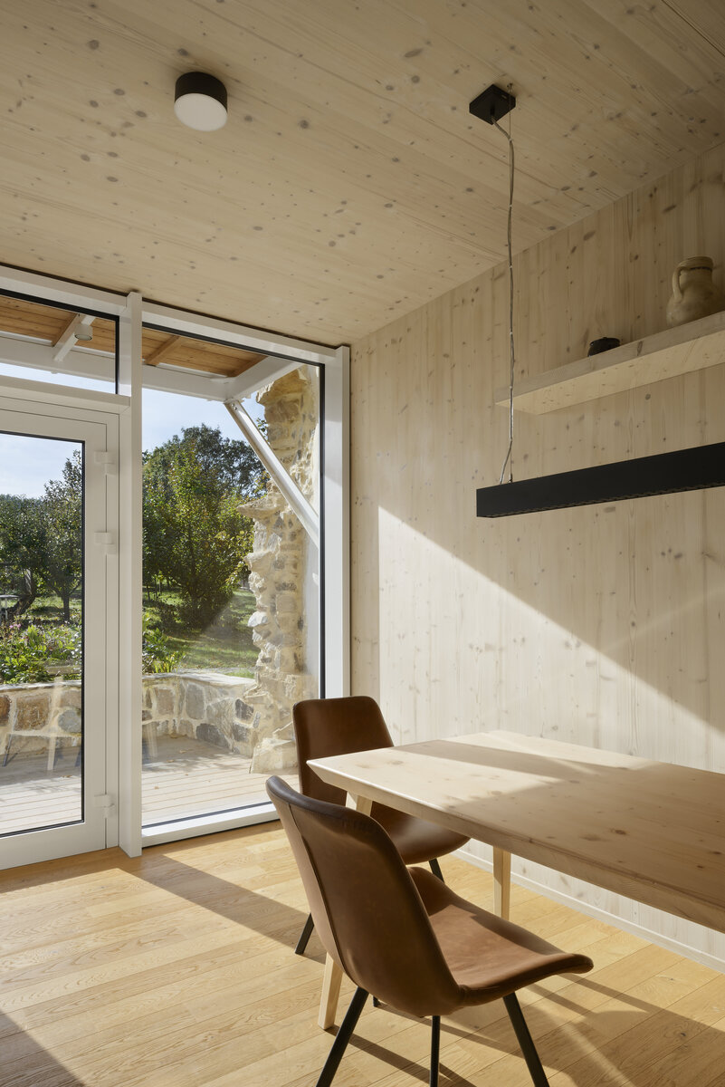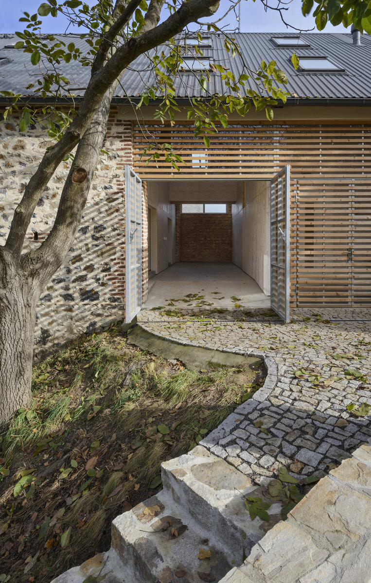 Istniejący budynek stodoły, wybudowany prawdopodobnie pod koniec XIX w., zbudowany został z solidnych ścian z kamienia. Wyburzono jedną ze ścian szczytowych, aby otworzyć widok na ogród i wpuścić odpowiednią ilość światła. Pomiędzy istniejącymi ścianami umieszczono nową konstrukcję z litego drewna, bez konieczności gruntownego izolowania muru.