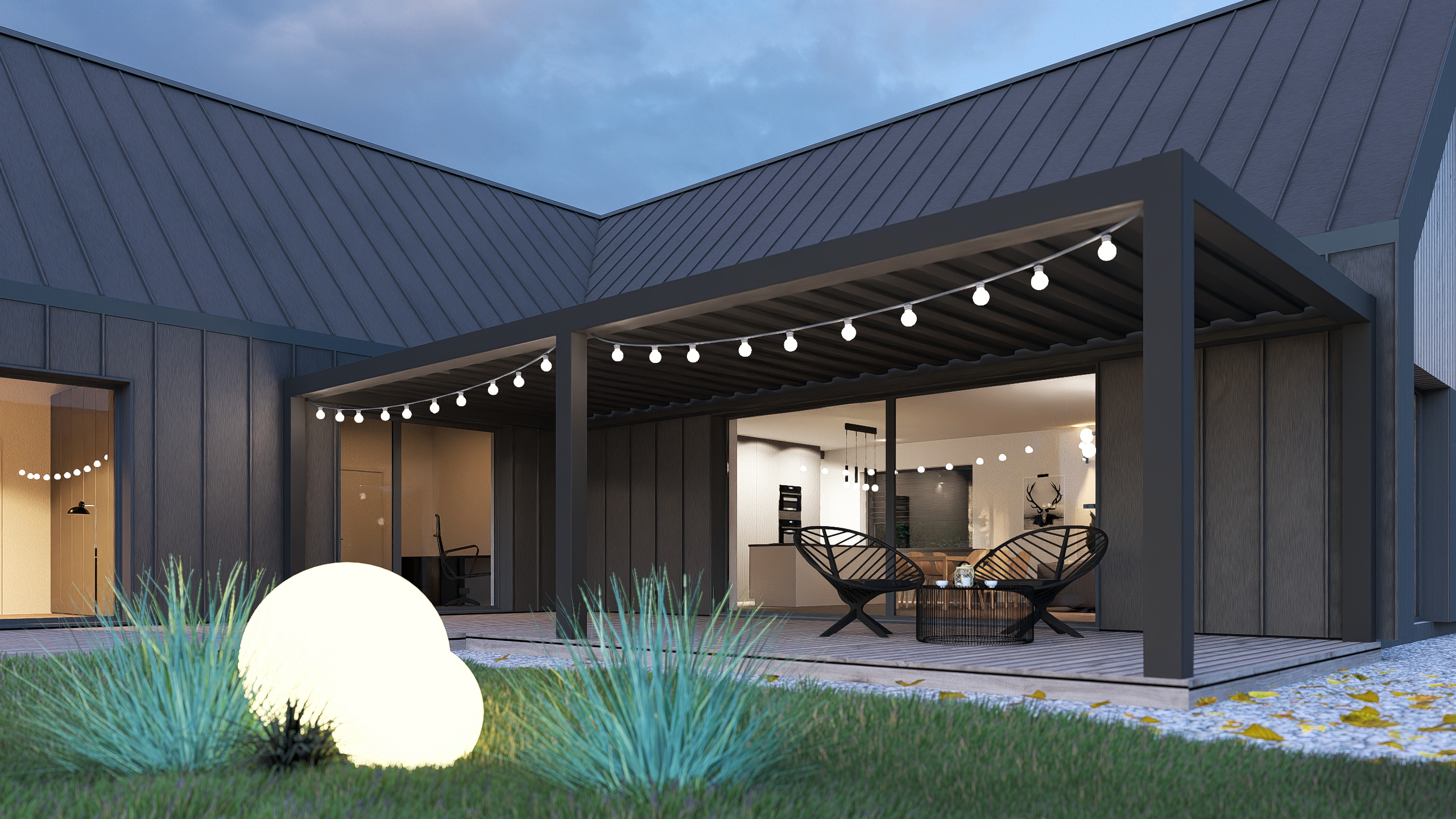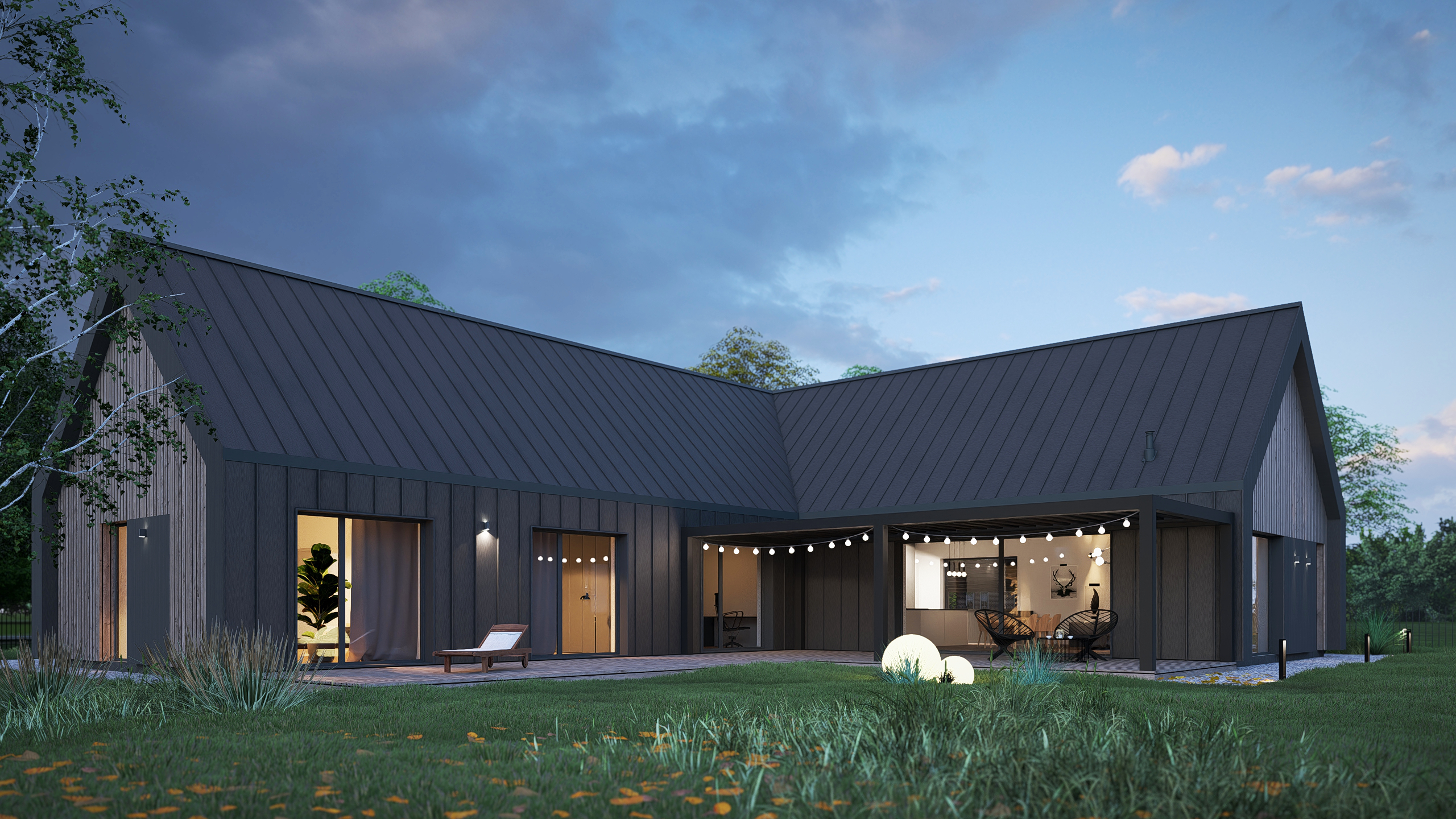 Na elewacji i dachu zastosowana została blacha aluminiowa w rąbek stojący w grafitowym kolorze i okładzina HPL w formie desek na ścianach szczytowych. To efektowne i trwałe materiały, które będą odporne na czas i pogodę.
