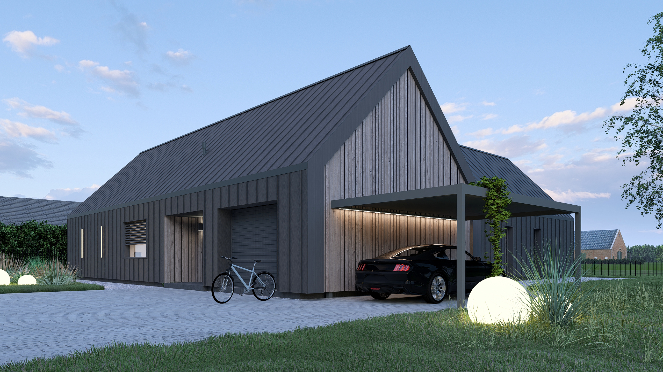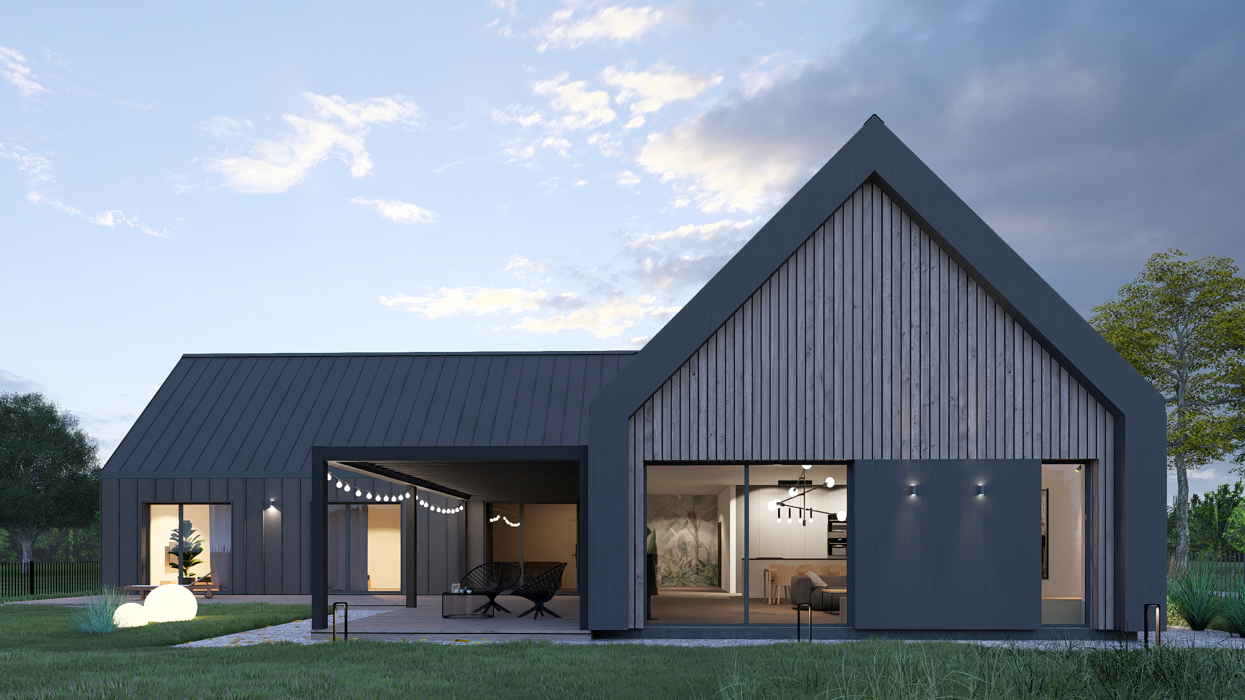 Nowoczesna stodoła o powierzchni użytkowej ok. 200 m2 zlokalizowana jest na narożnikowej działce. Ze względu na bliskość stosunkowo ruchliwej drogi, część dzienna i mieszkalna zostały od niej maksymalnie odsunięte. Jednym z punktów wyjścia do projektowania było również zapewnienie dobrego doświetlenia pomieszczeń, dlatego wszystkie pokoje mają duże przeszklenia z ekspozycją od zachodu i południa.