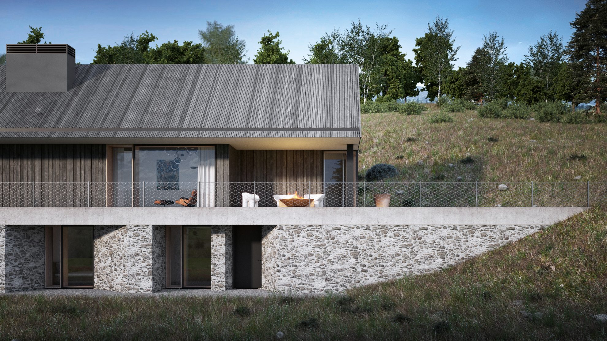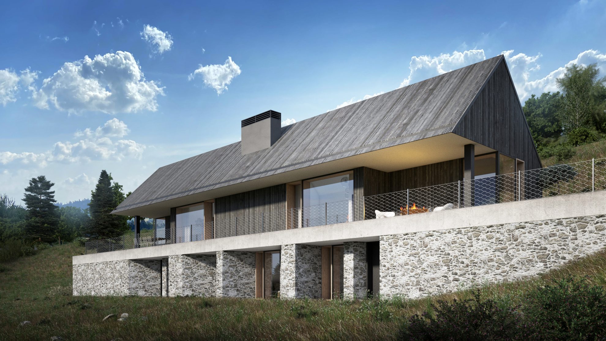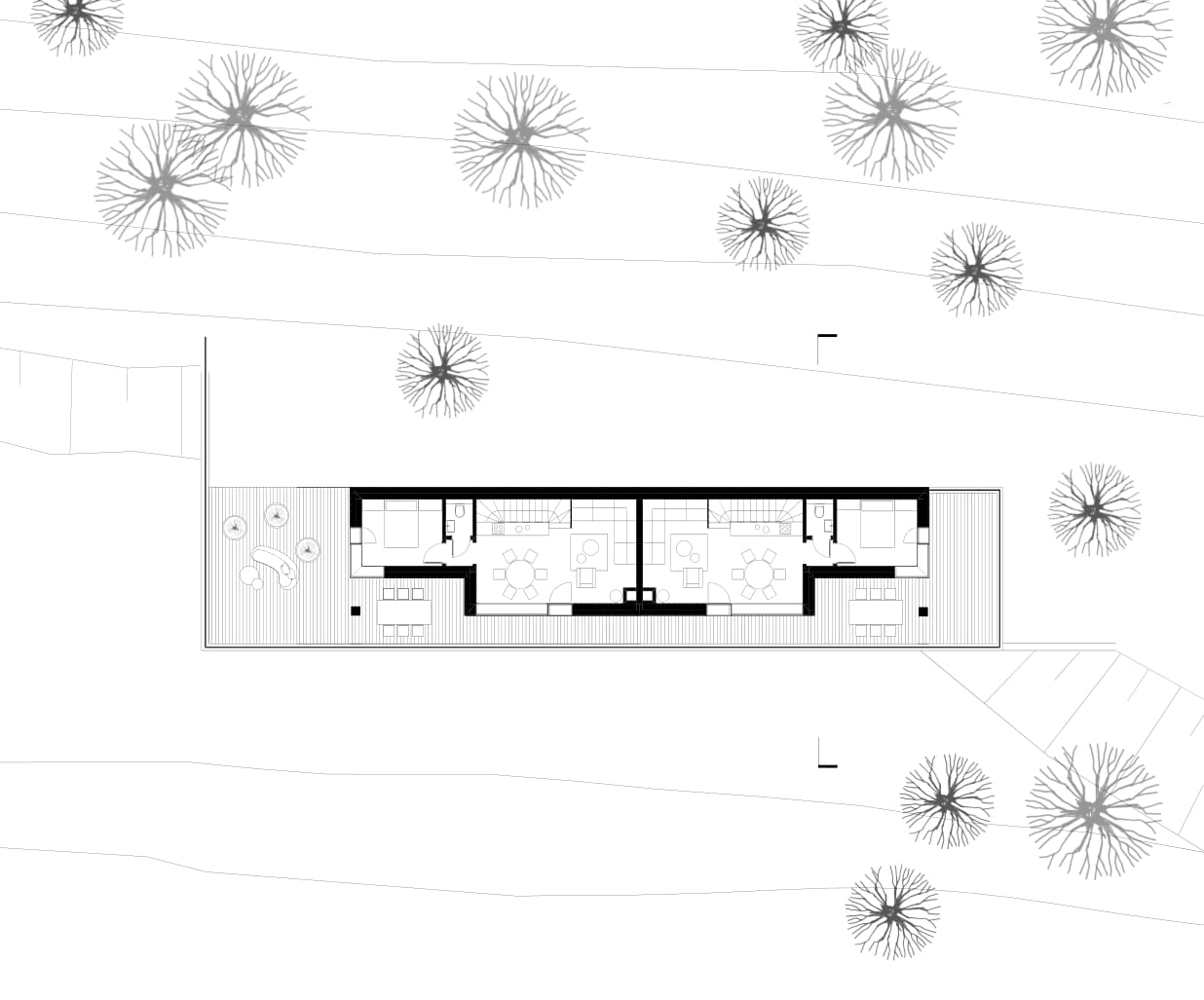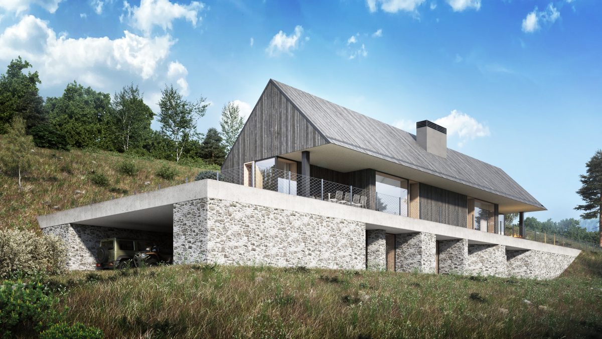 Dom w zabudowie bliźniaczej, stworzony dla dwóch rodzin, położony jest w malowniczych górach Orlickich w Kotlinie Kłodzkiej. Został zaprojektowany z betonu, drewna i kamienia, a jego elewacja jest symetryczna i doskonale wpasowana w krajobraz niskich gór. Naturalne strome nachylenie zbocza, pozwoliło schować część tylne elewacji budynku pod poziomem terenu.