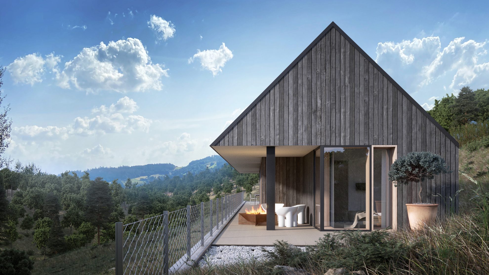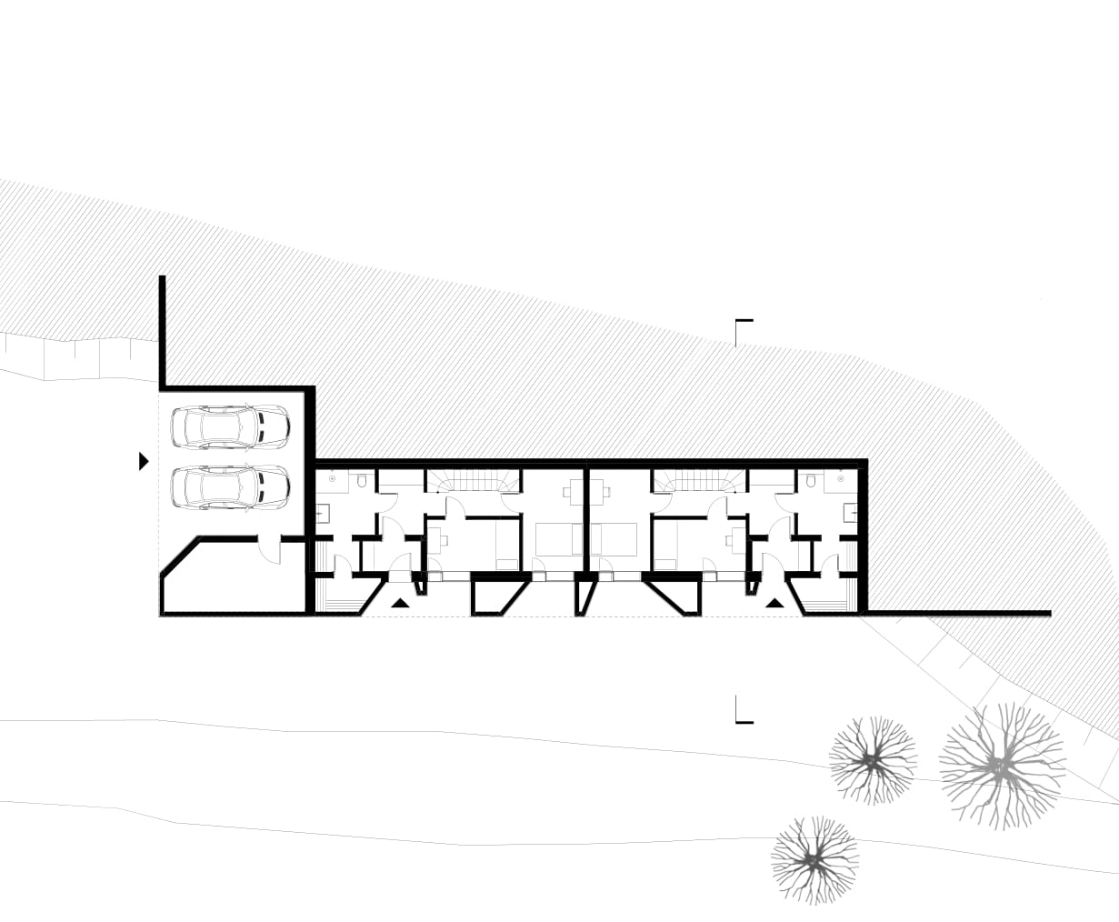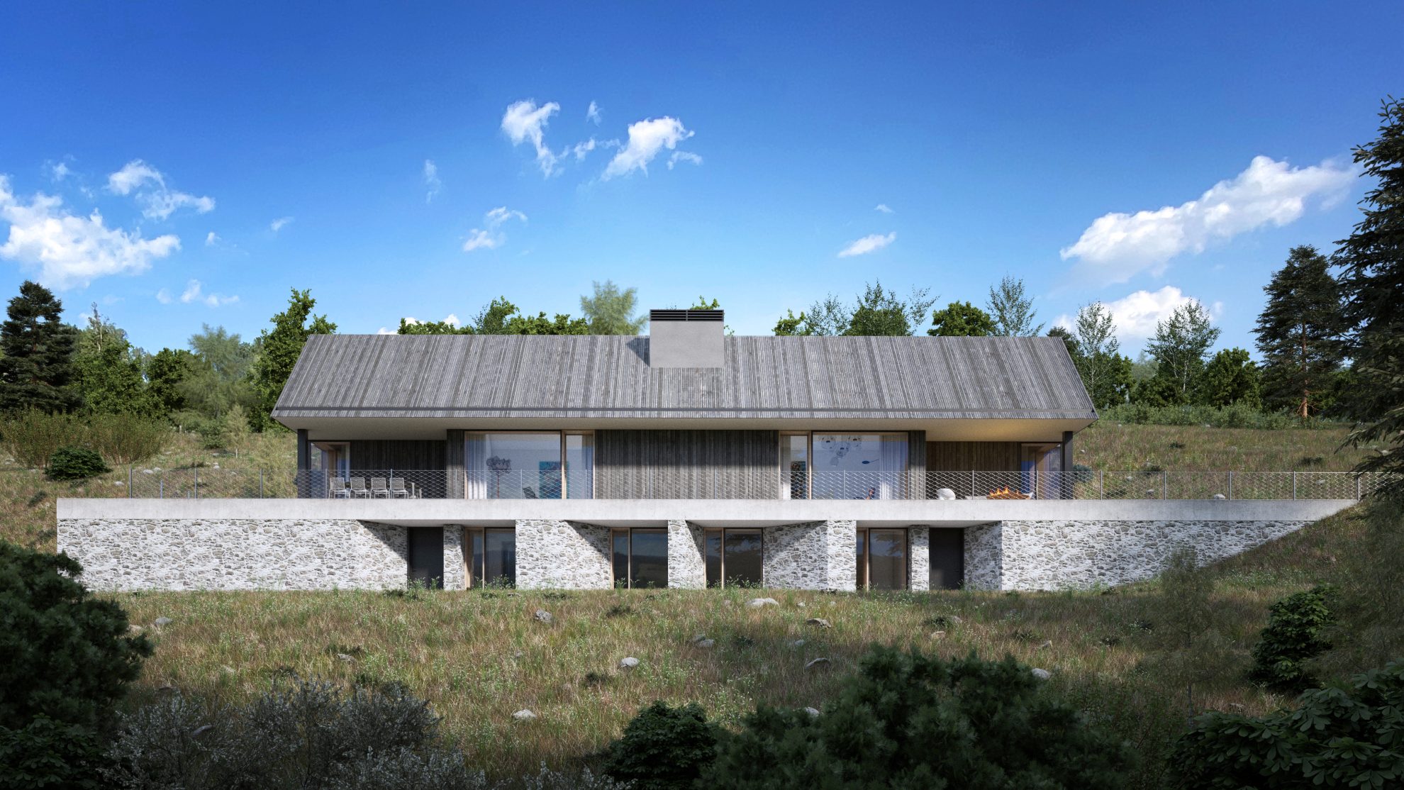 Dom w zabudowie bliźniaczej, stworzony dla dwóch rodzin, położony jest w malowniczych górach Orlickich w Kotlinie Kłodzkiej. Został zaprojektowany z betonu, drewna i kamienia, a jego elewacja jest symetryczna i doskonale wpasowana w krajobraz niskich gór. Naturalne strome nachylenie zbocza, pozwoliło schować część tylne elewacji budynku pod poziomem terenu.