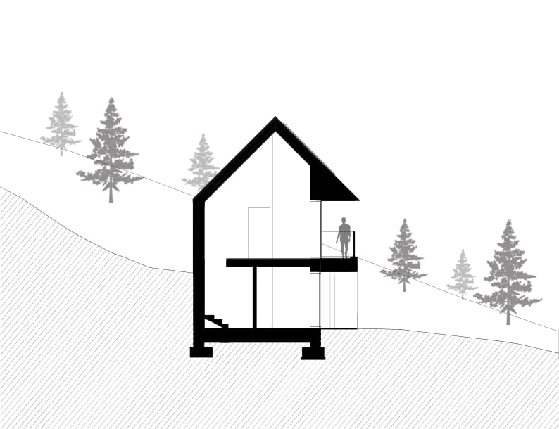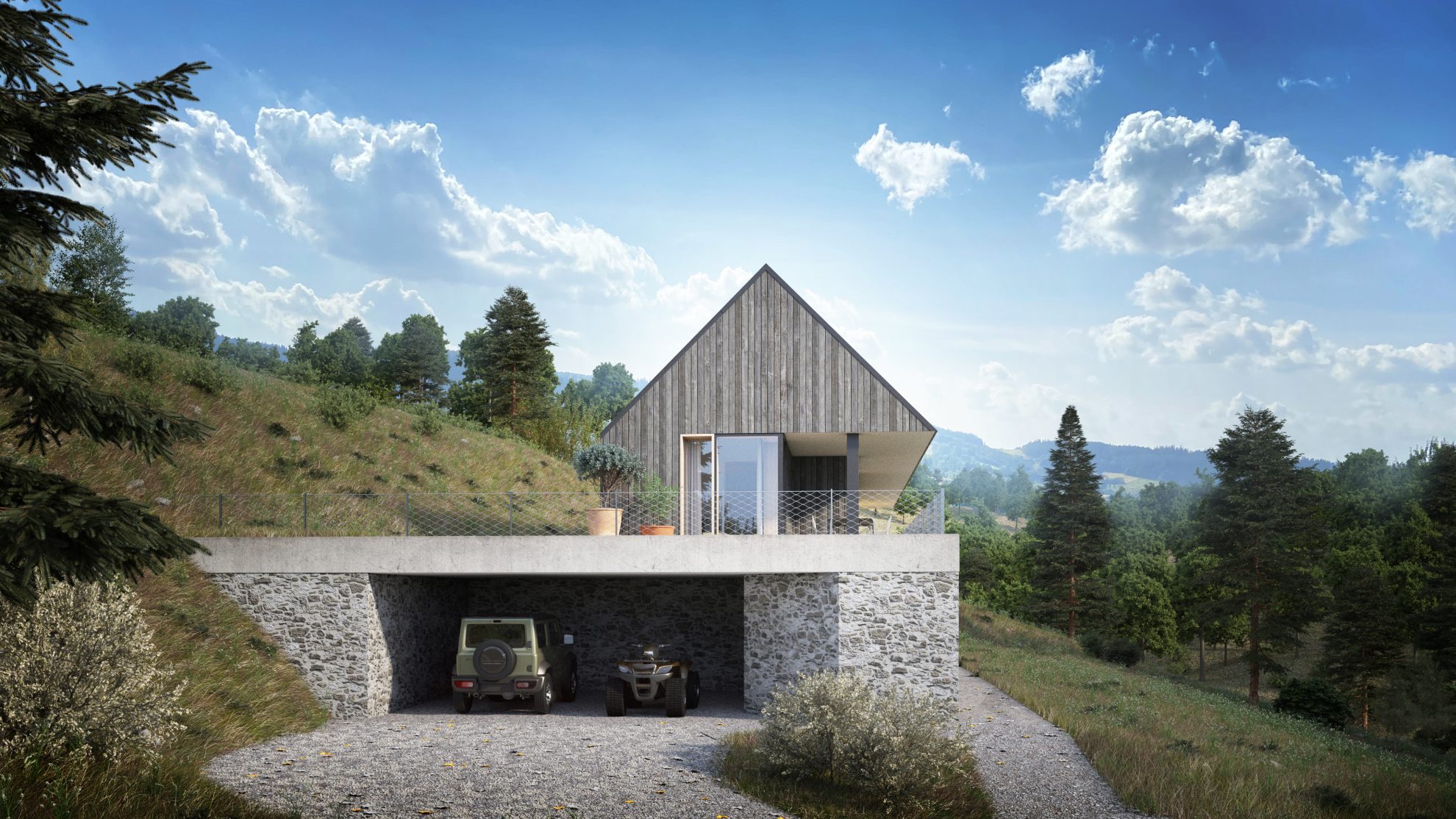 Poza oszczędnością materiałową, posadowienie wykorzystuje też akumulowane ciepło ziemi w zimie, a latem jej chłód. Niższa kondygnacja mieści dwie sypianie oraz łaziankę z sauną. Na piętrze znajduje się salon z kuchnią oraz główną sypialnią, z której również roztacza się widok na góry. Każda z części budynku ma zaledwie 80m2, na których udało się pomieścić aż 3 wygodne sypialnie oraz część dzienną. W zbocze przechodzącym w zielony dach wkomponowana jest wiata samochodowa. Dolna część elewacji obłożnej kamieni, jest współczesną interpretacją tradycyjnych przypór i podcieni, występujących w architekturze górskiej oraz Dolnego Śląska. Również zróżnicowanie na kamienne przyziemie i drewnie piętro, posada swoje odzwierciedlenie w tradycji budowlanej gór oraz regionu.