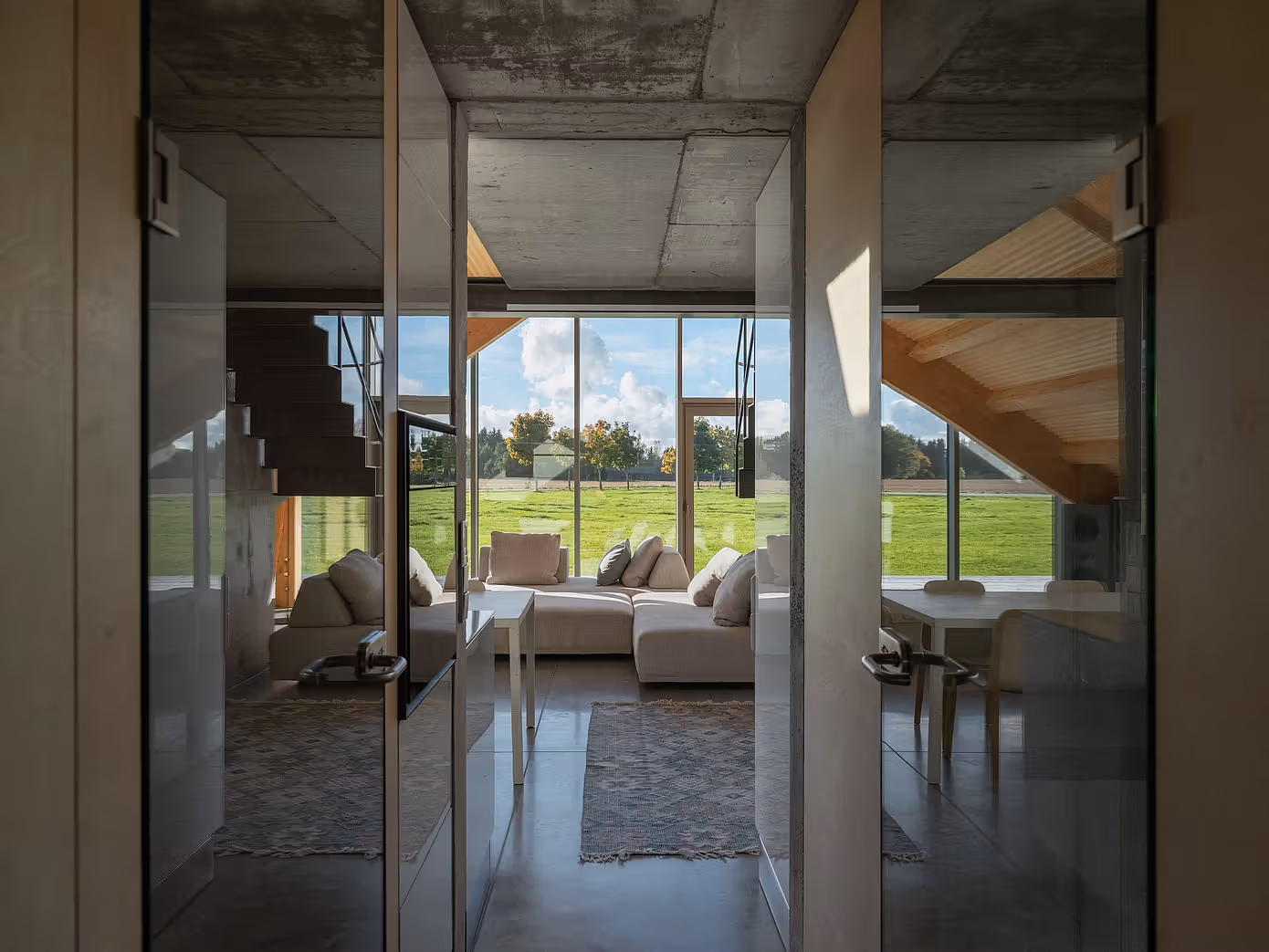 Naturalne światło odgrywa kluczową rolę w kształtowaniu atmosfery wnętrza. Duże przeszklenie w zachodniej elewacji otwiera strefę gościnną na widok pól i zachodzącego słońca, czyniąc światło codziennym rytuałem. Dodatkowo świetlik dachowy, który przechodzi w pionowe okno północnej elewacji, prowadzi światło głęboko do wnętrza, rozjaśniając nawet najbardziej oddalone strefy hali.