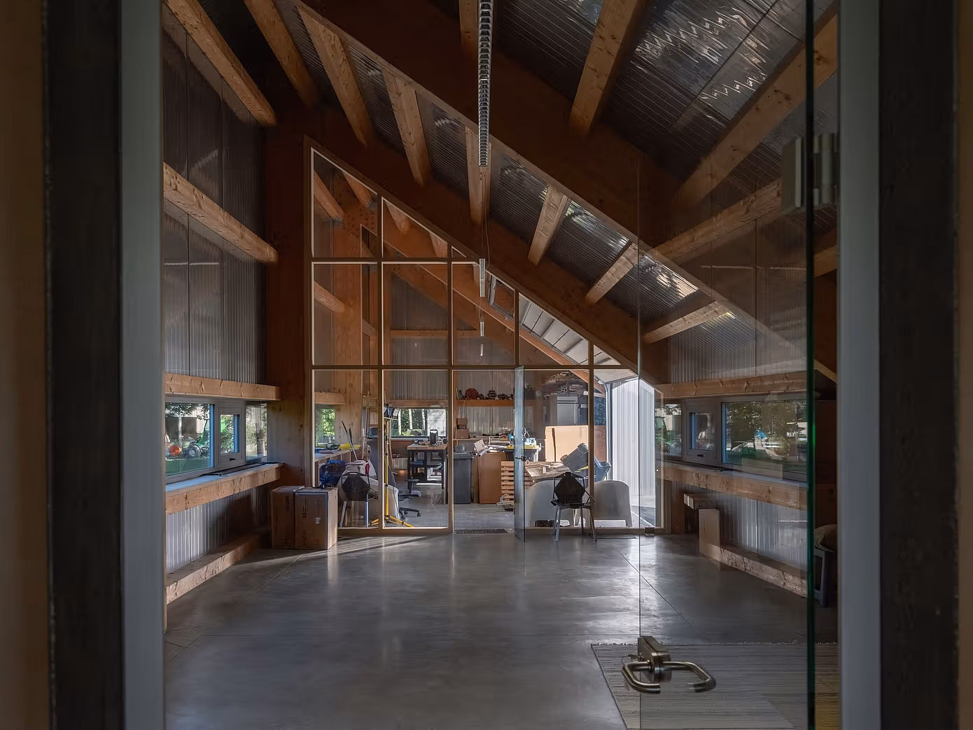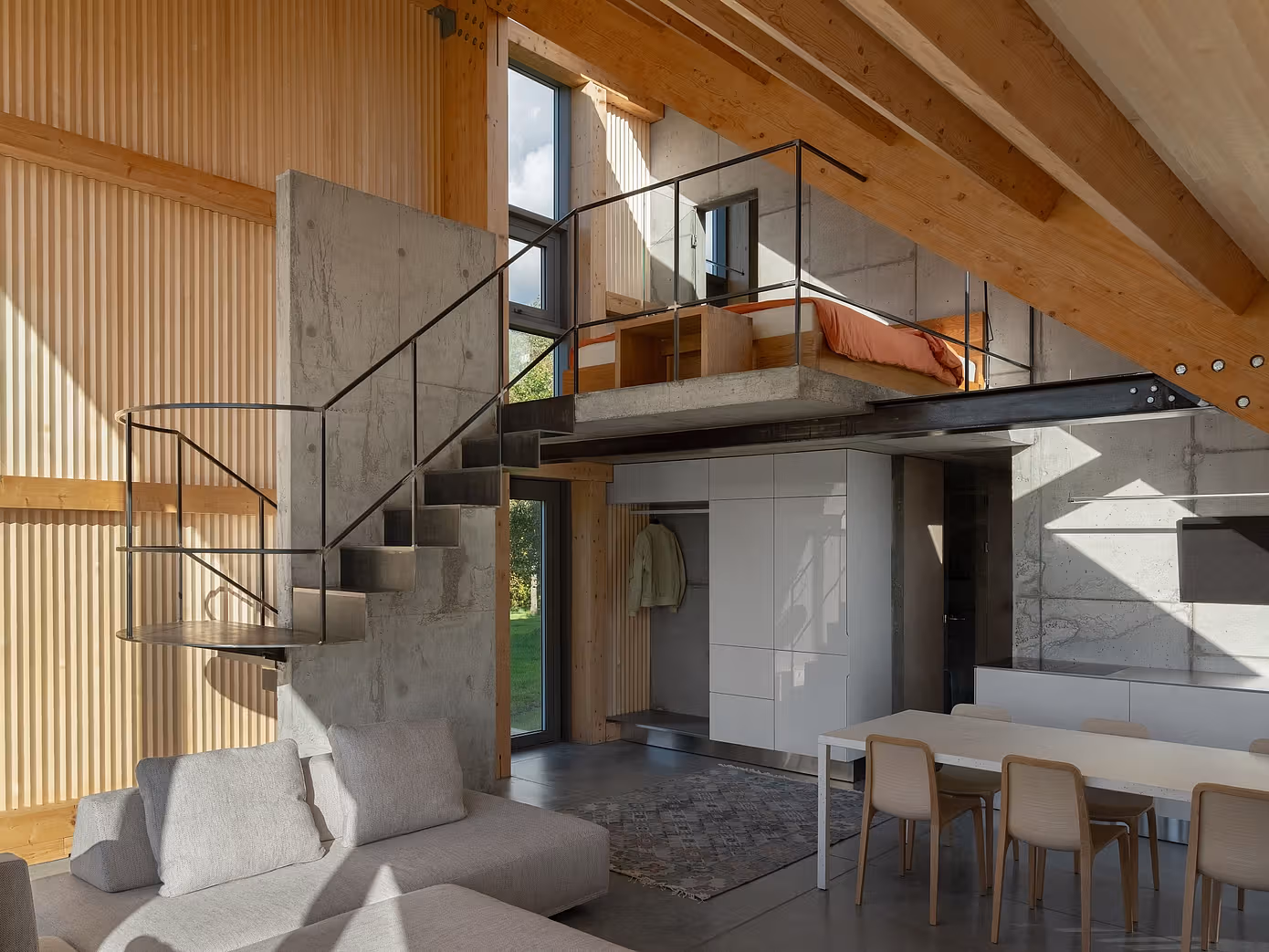 We wnętrzu dominują odsłonięte ramy z drewna klejonego warstwowo klasy GL28h, które nadają przestrzeni rytm i porządek. Ich masywność i naturalna faktura wprowadzają ciepło, równoważąc surowość betonowej posadzki. Zestawienie betonu i drewna buduje loftowy charakter wnętrza, w którym można bez obaw wnosić narzędzia i maszyny, a jednocześnie spędzać spokojne wieczory z gośćmi.