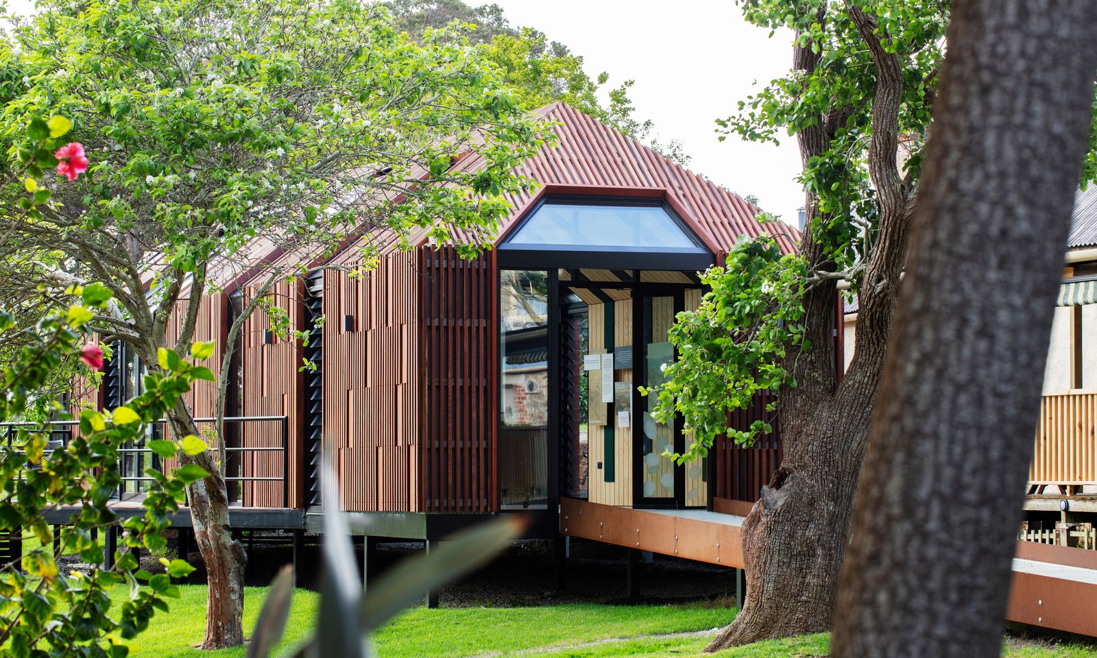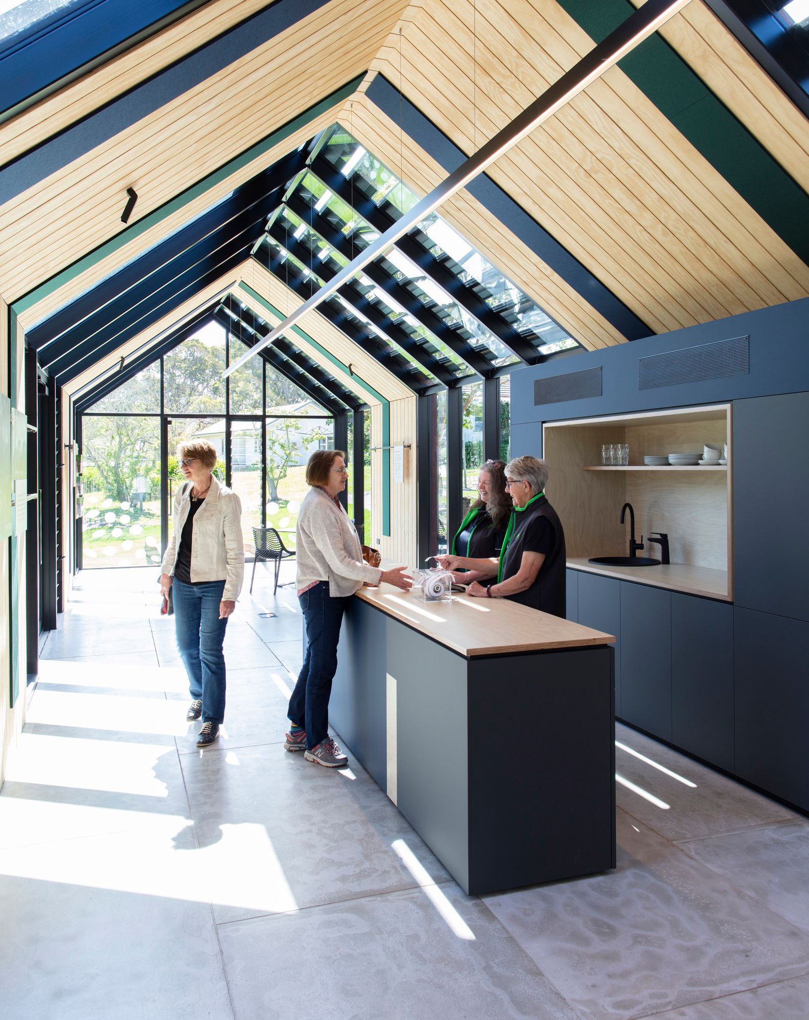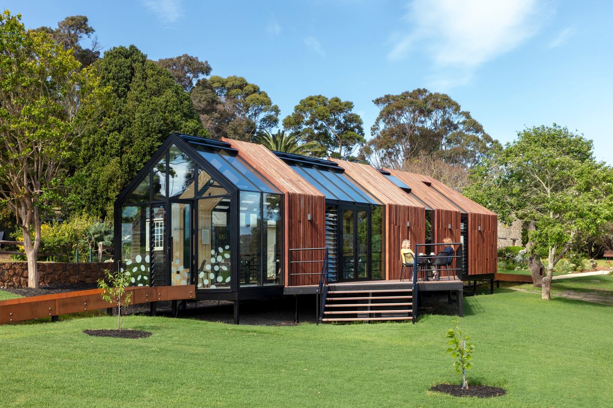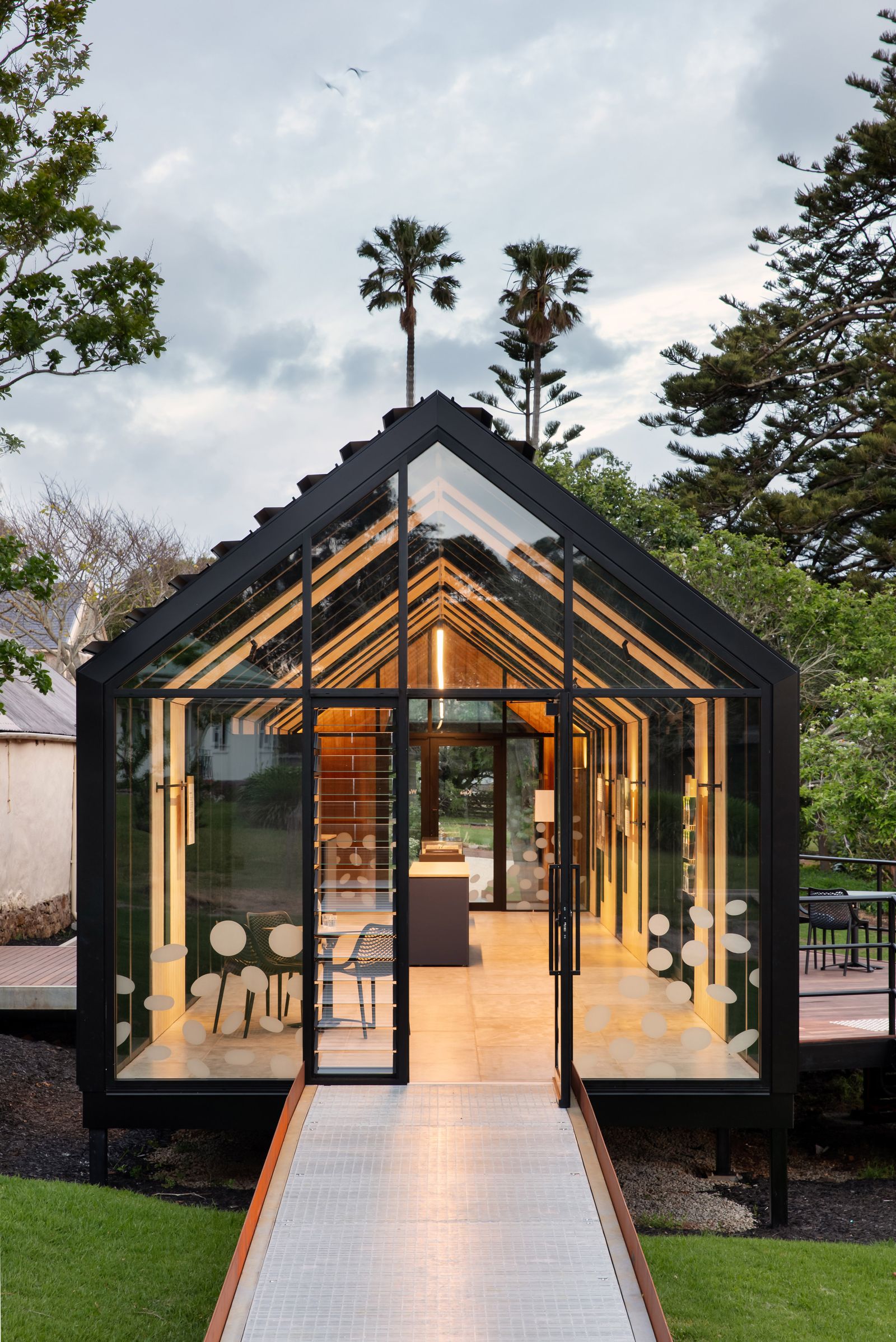 Forma architektoniczna została zaprojektowana w sposób niezwykle świadomy i subtelny. Niewielki pawilon o powierzchni około 66 m² nawiązuje skalą i geometrią do istniejących zabudowań, w tym historycznego budynku z XIX wieku. Jednocześnie zastosowane materiały i detale wprowadzają współczesną interpretację – drewniane listwy elewacyjne odwołują się do tradycyjnych schronień typu mia, a przeszklone elementy przypominają historyczne konstrukcje służące do transportu roślin.