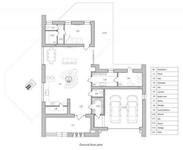 Strefa zewnętrzna została zaplanowana jako integralna część projektu domu. Przestrzeń przed wejściem pełni funkcję podjazdu i boiska do koszykówki, a od strony ogrodu powstało patio o powierzchni 38 m², połączone z trawnikiem, strefą grillową, placem zabaw i sadem. Wnętrze parteru tworzy otwarta przestrzeń dzienna typu studio o powierzchni ponad 69 m², doświetlona oknami dachowymi od strony południowo-wschodniej. Zastosowane szklane panele pozwalają regulować barwę światła dziennego, a centralnie usytuowany kominek Piazzetta, zintegrowany z kolumną i klatką schodową, organizuje całą przestrzeń. Na tym poziomie zaprojektowano także sypialnię gościnną, garderobę, pralnię, pomieszczenia techniczne, spiżarnię oraz garaż na dwa samochody.