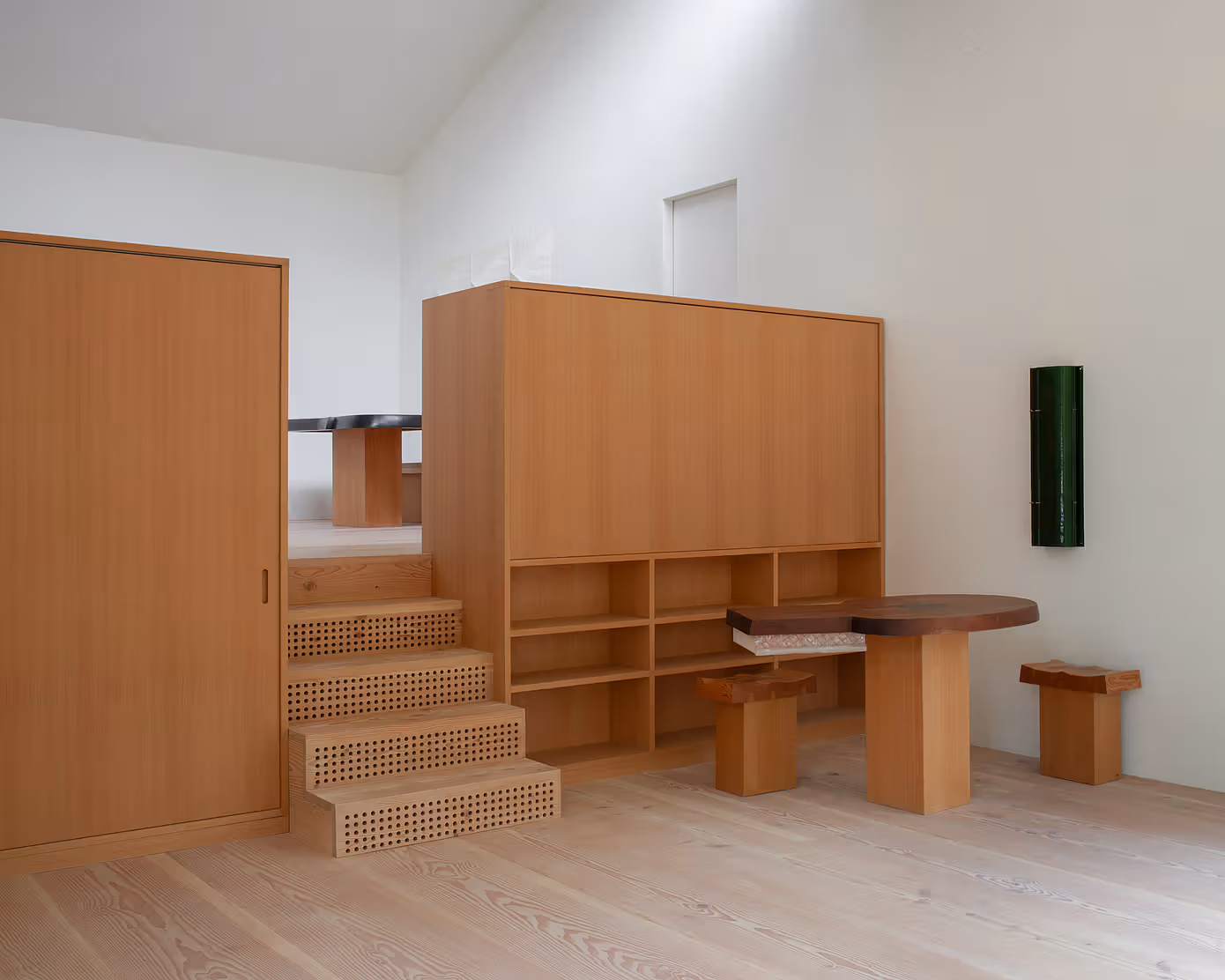 Niskie, wbudowane szafki porządkują układ funkcjonalny, integrując garderobę, półki i spiżarnię w jedną linię zabudowy. Proste formy mebli autorstwa Minjae Kim – masywny stół, stołki i ławy – podkreślają materialność drewna i wprowadzają rzemieślniczy charakter.