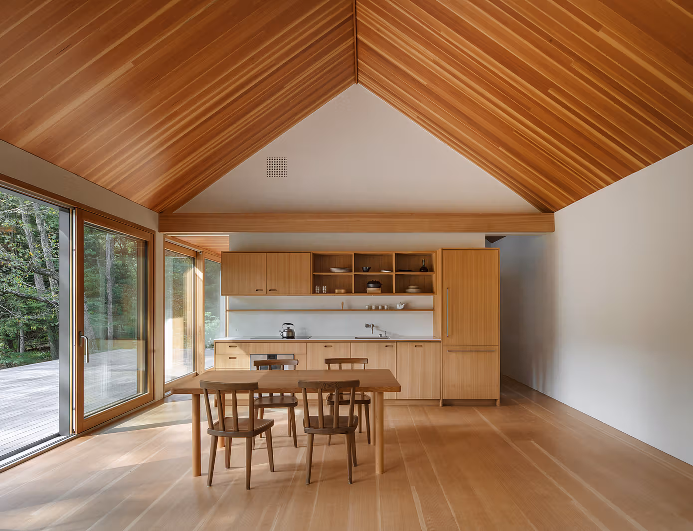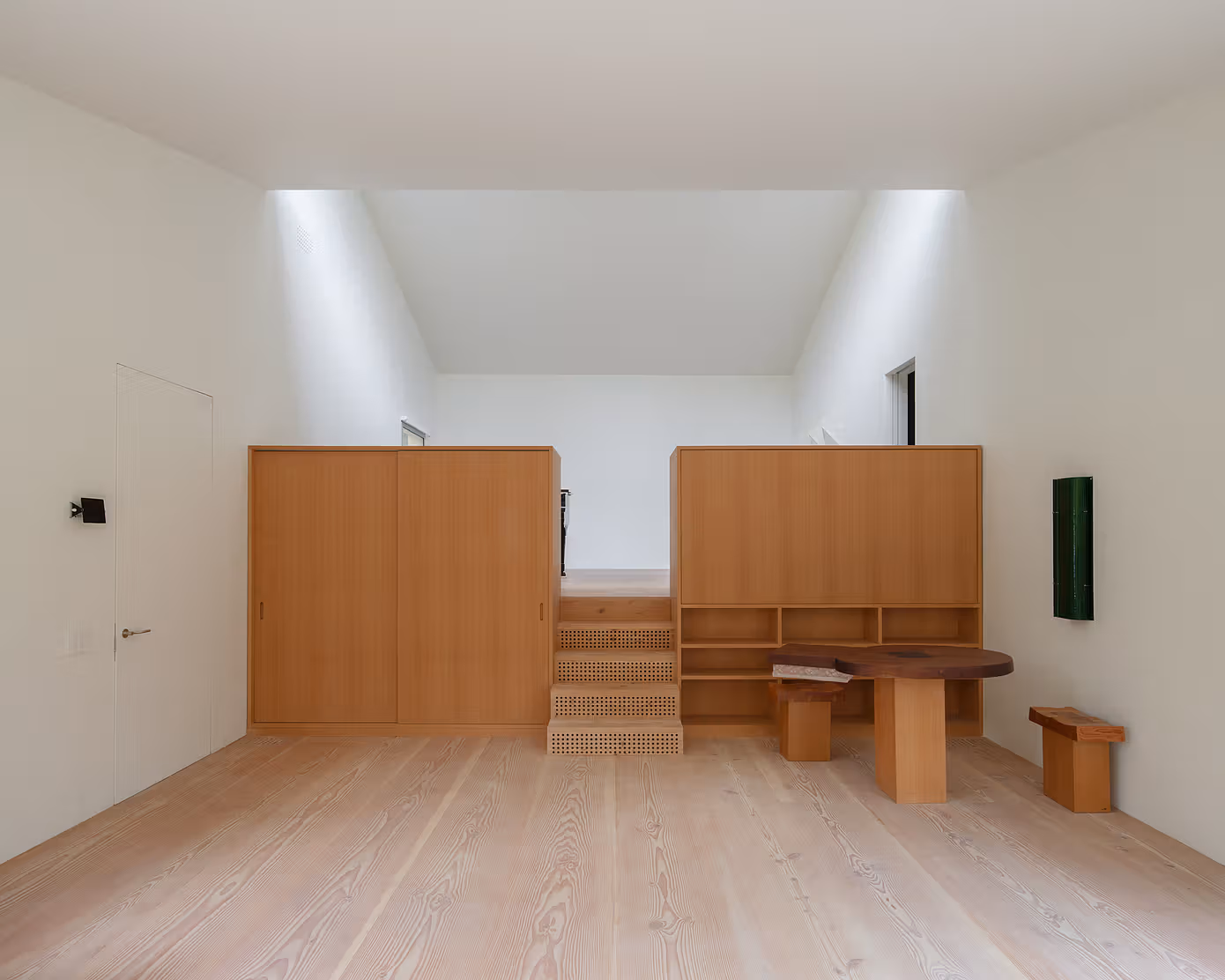 Dawny dom położony bliżej drogi przekształcono w otwarte studio. Usunięto ściany działowe oraz drugą kondygnację, tworząc wysoką, jednoprzestrzenną kubaturę. Nowe okna clerestory biegnące pod linią dachu wpuszczają miękkie, rozproszone światło, które rozlewa się po jasnych deskach i podkreśla wysokość wnętrza.