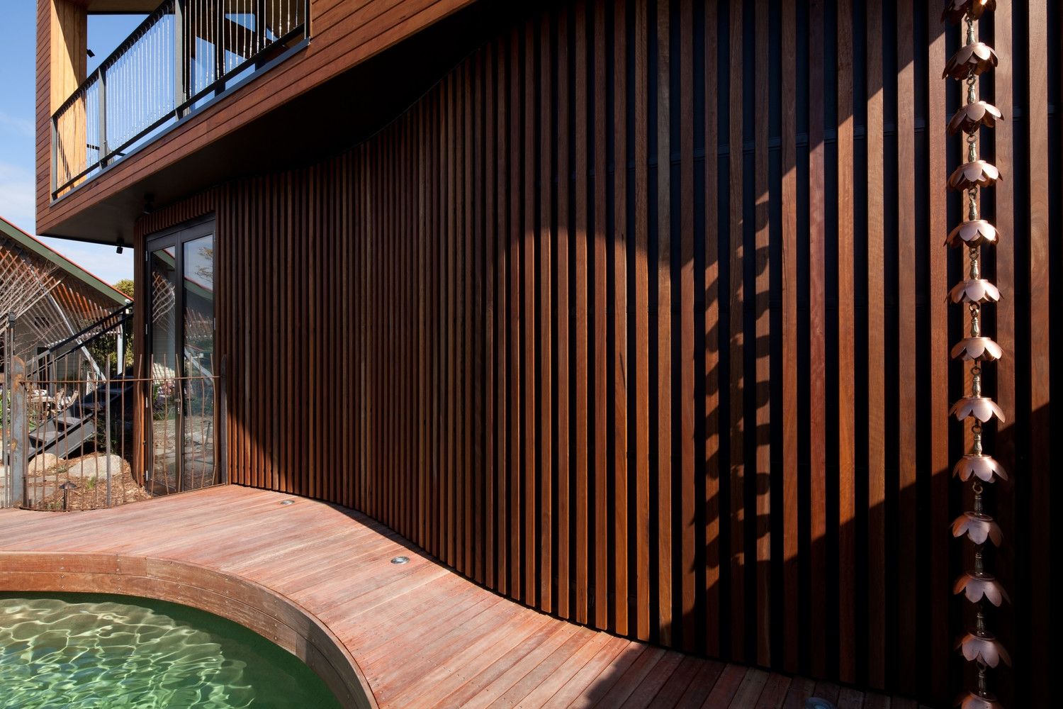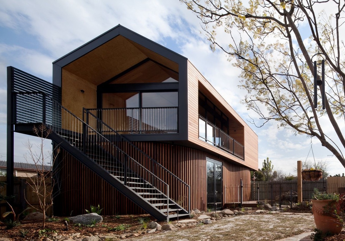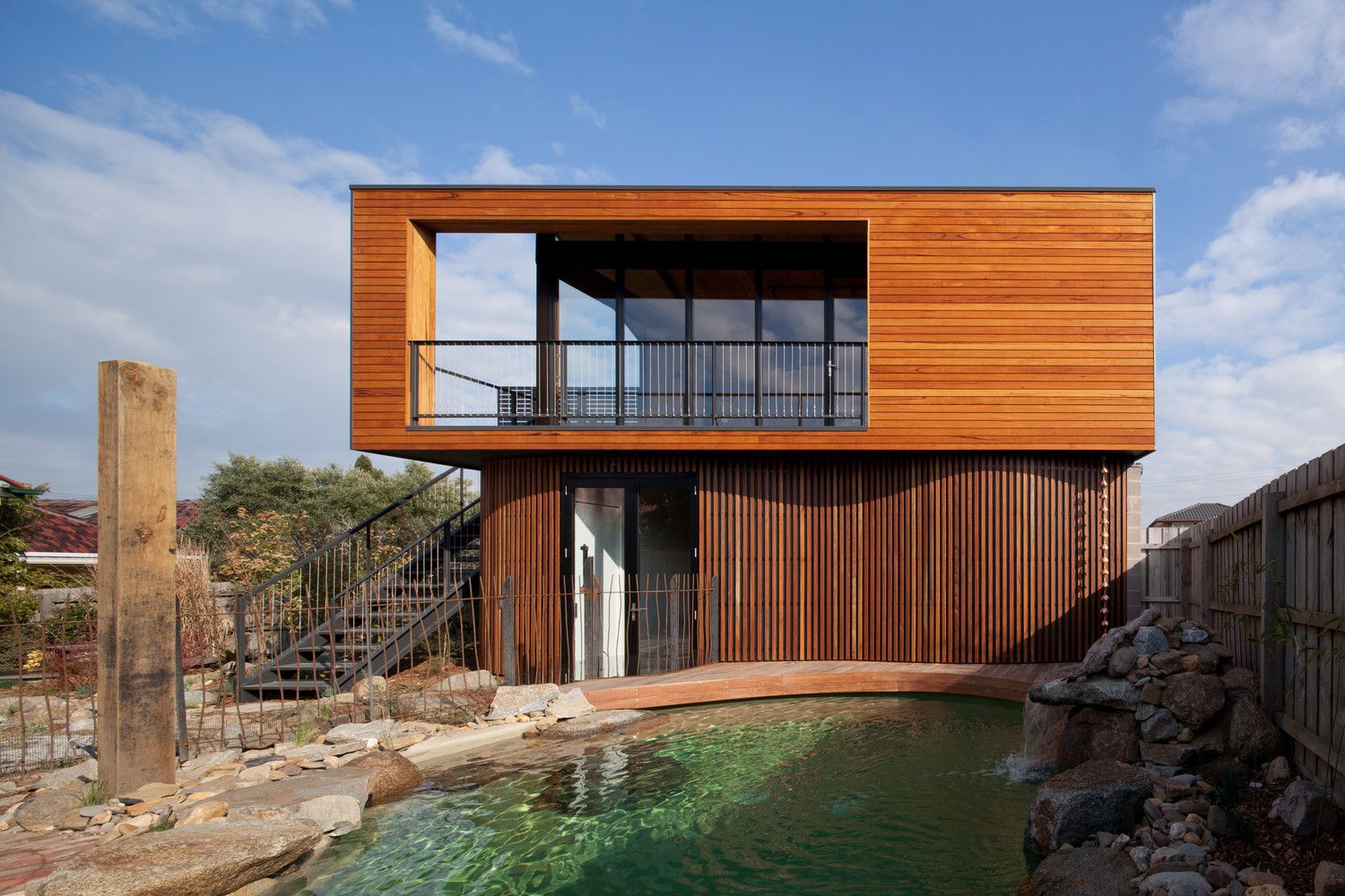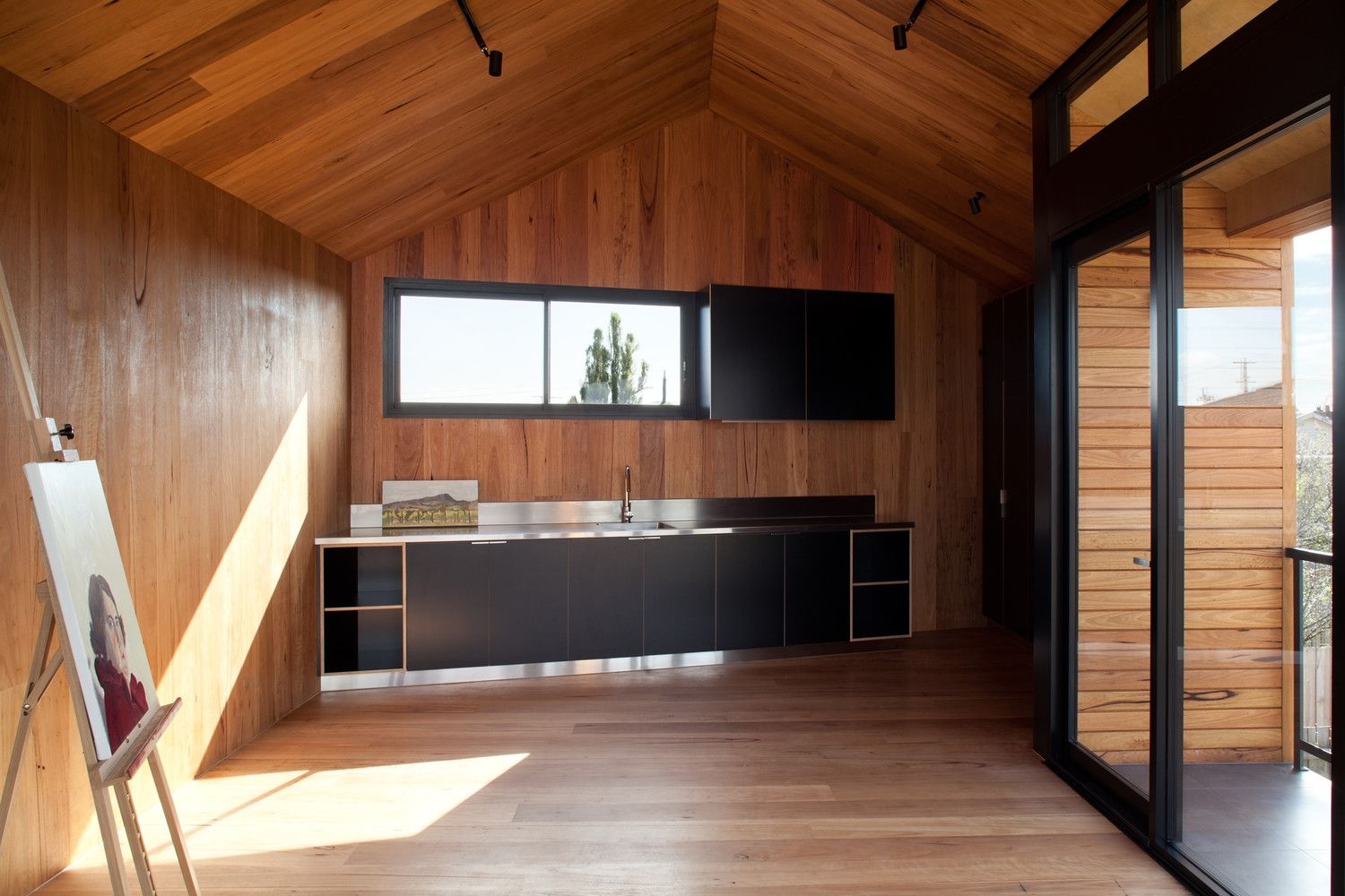 Projekt studia w Melbourne to przykład nowoczesnej stodoły, która harmonijnie łączy funkcję artystyczną z otaczającym krajobrazem. Budynek osadzono w szczegółowo zaplanowanym ogrodzie współtworzonym z firmą Phillip Johnson Landscaping, obejmującym naturalny basen i strumień z wodospadem. Domownicy mogli dzięki temu cieszyć się przestrzenią sprzyjającą malowaniu i rzeźbieniu, a jednocześnie kontakt z naturą był obecny w każdej części działki. Zewnętrzne wykończenie studia wykonano z naturalnego drewna, które z czasem nabierze szarych odcieni, idealnie wkomponowując się w otoczenie drzew, wody i skał.
