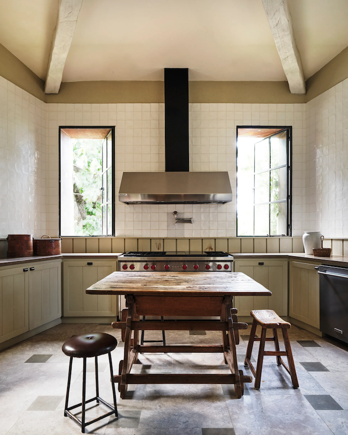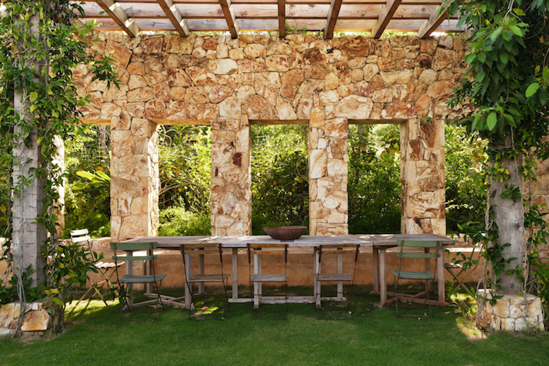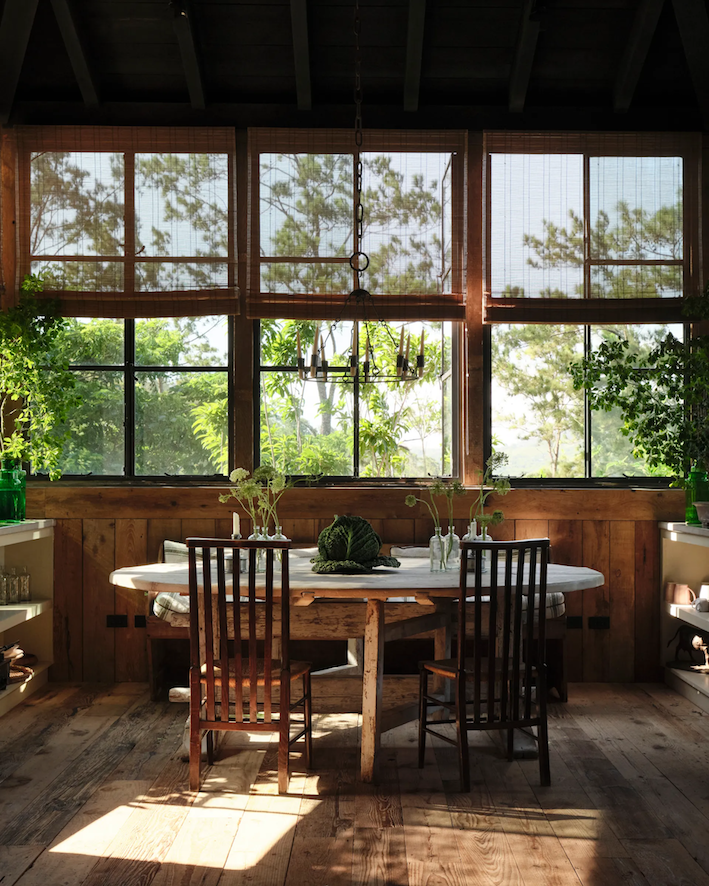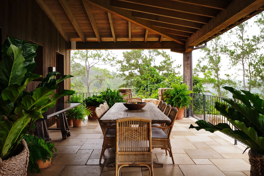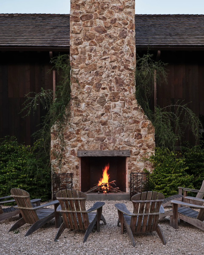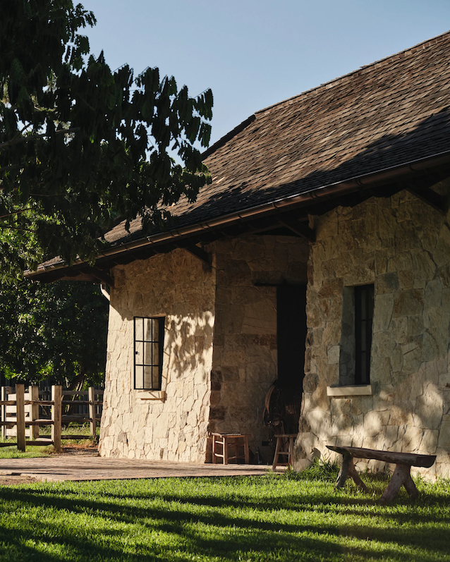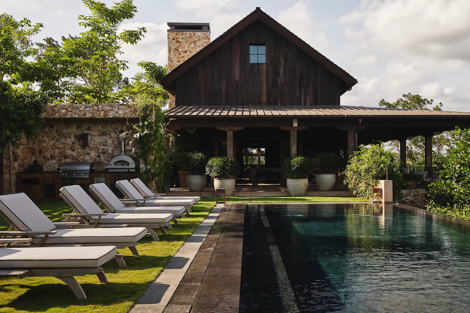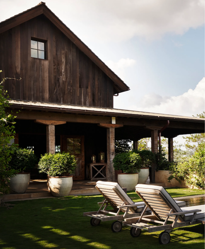 Aby zwiększyć funkcjonalność i estetykę budynku, Dungan zaprojektował zadaszone werandy wokół całej stodoły oraz powiększył jeden z końców budynku o przestronne wykusze. Z myślą o lokalnym charakterze budowy, do dekoracyjnych elementów, takich jak kominki zewnętrzne i loggie, użyto kamienia naturalnego. Niestety, podczas trwania budowy, pandemia wymusiła długą przerwę, co skłoniło właściciela do głębszego zastanowienia się nad wnętrzami swojego nowego domu. Wtedy to właśnie postanowił poprosić o pomoc projektantkę Isabel López-Quesadę, znaną z tworzenia eleganckich przestrzeni, które łączą filozofię wabi-sabi z nutą luksusu.