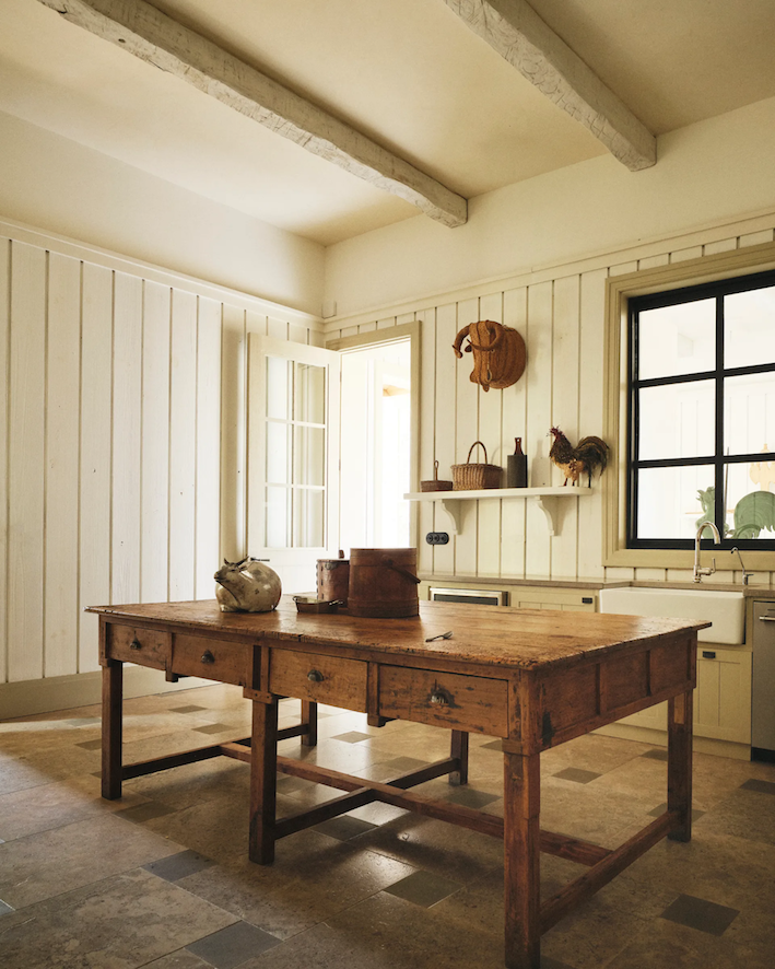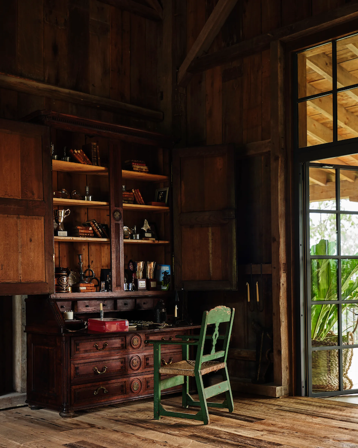 López-Quesada, w pełni zaangażowana w projekt, rozpoczęła poszukiwania unikalnych, rustykalnych elementów wyposażenia, odwiedzając pchle targi oraz sklepy z antykami w całej Europie. Jej celem było odnalezienie oryginalnych elementów, które wprowadziłyby zmysłowy i wizualny komfort do przestrzeni. Wśród wyjątkowych znalezisk znalazły się m.in. wysoka francuska szafka Ludwika XIII z XVII wieku oraz biurko z drewna orzechowego z XVIII-wiecznej Belgii. Te antyczne skarby zostały umieszczone w głównym pomieszczeniu stodoły, które pełni funkcję salonu, domowego biura oraz części wypoczynkowej.
