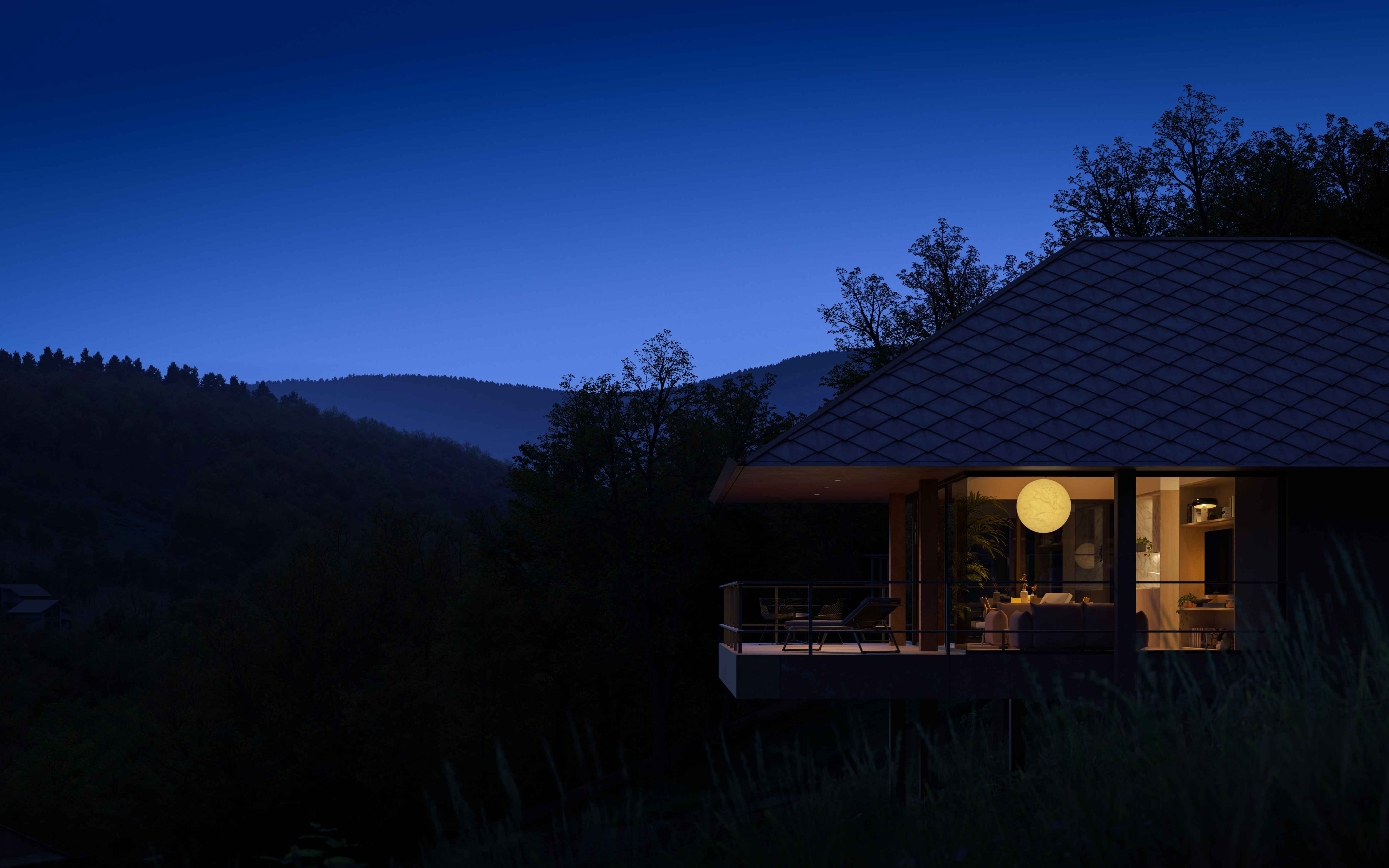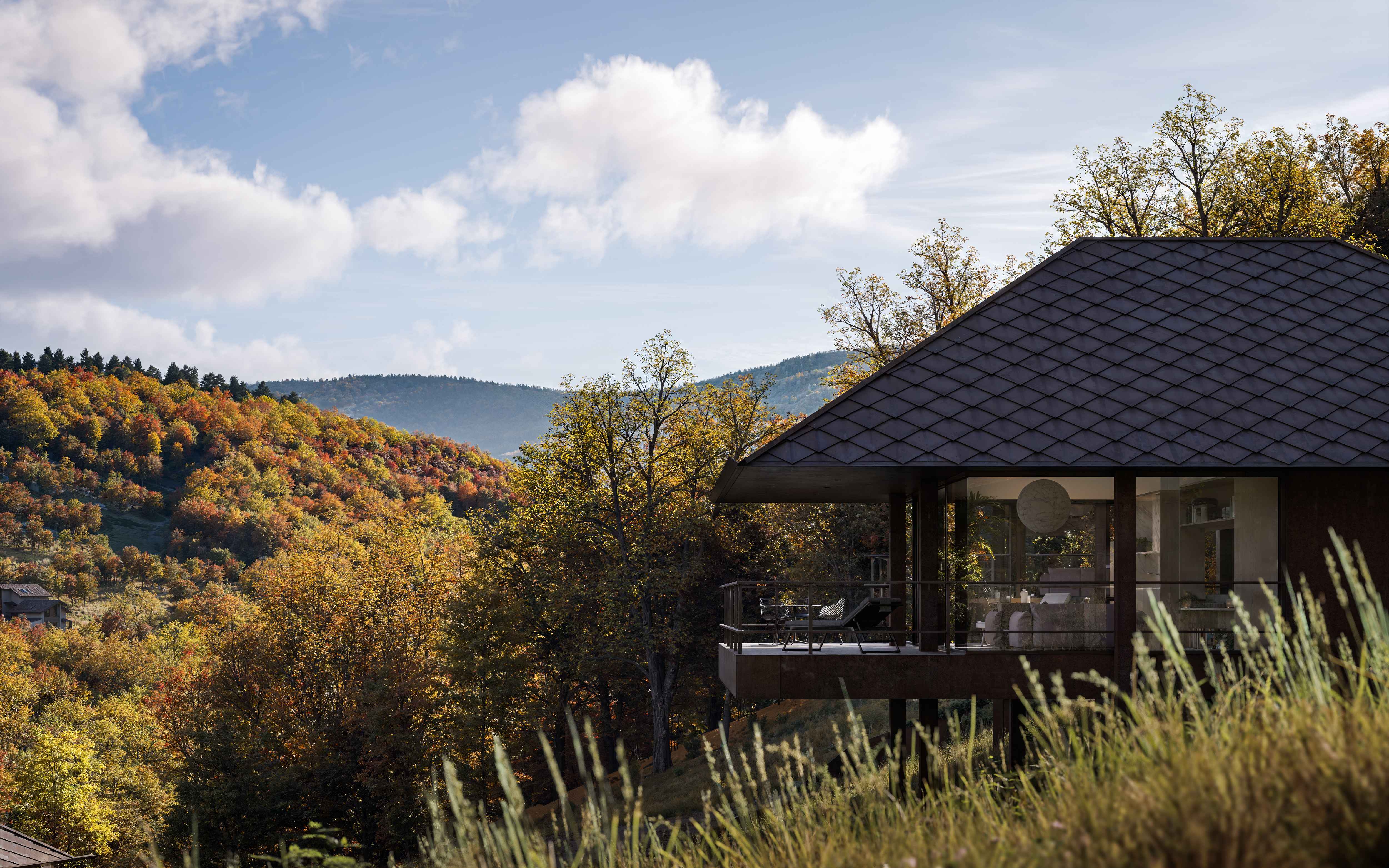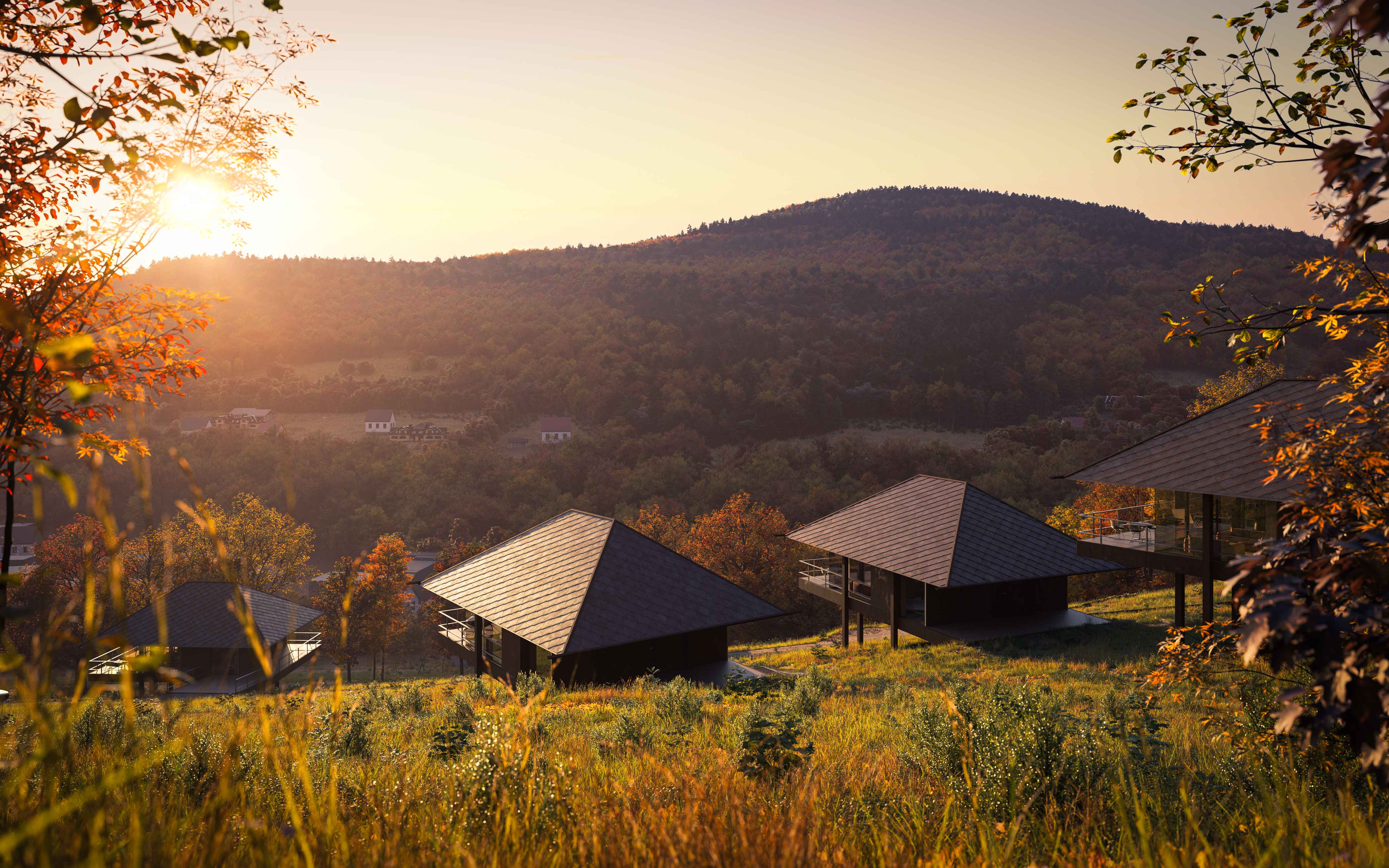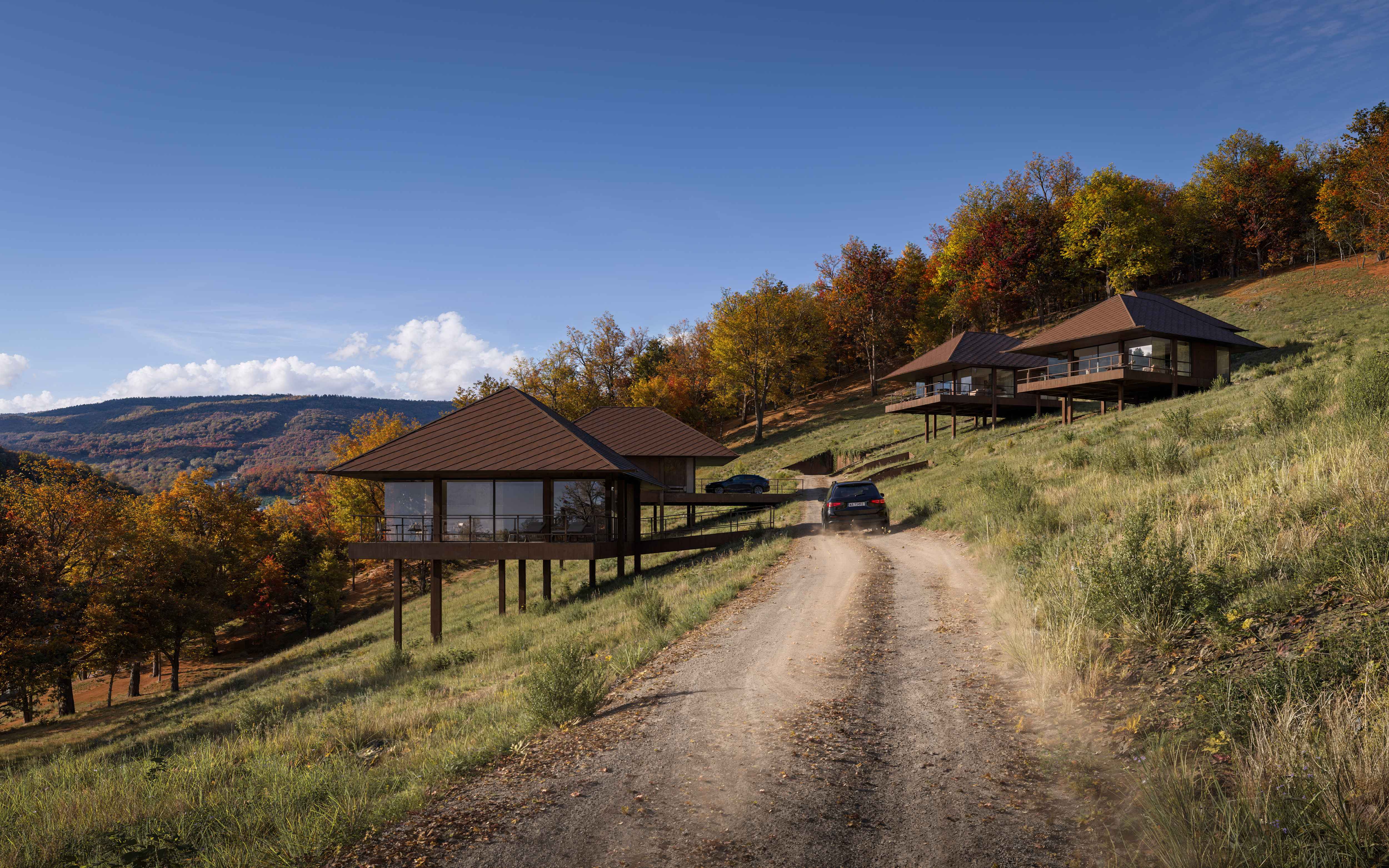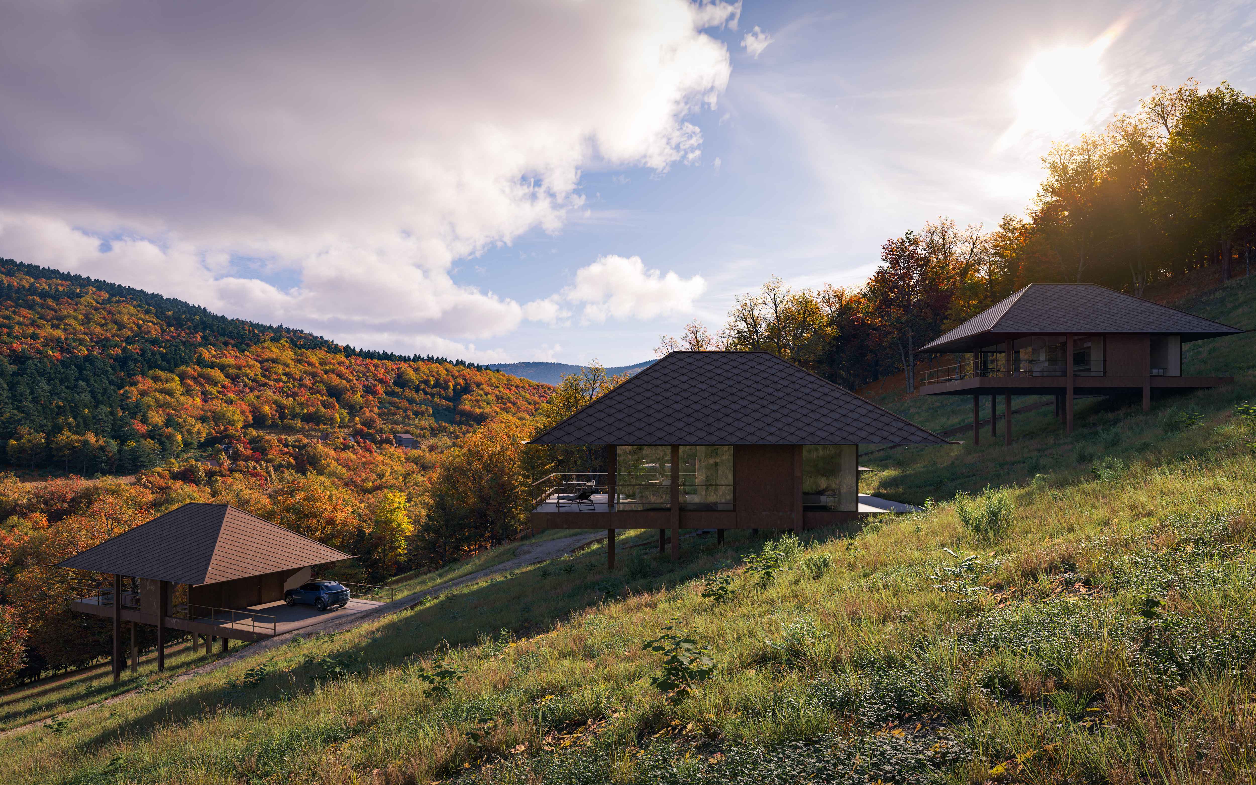 Osadzone na stromym stoku, kompaktowe funkcjonalnie domy, na planie kwadratu, z tarasami wejściowymi i widokowymi, karmiące się otaczającymi widokami.