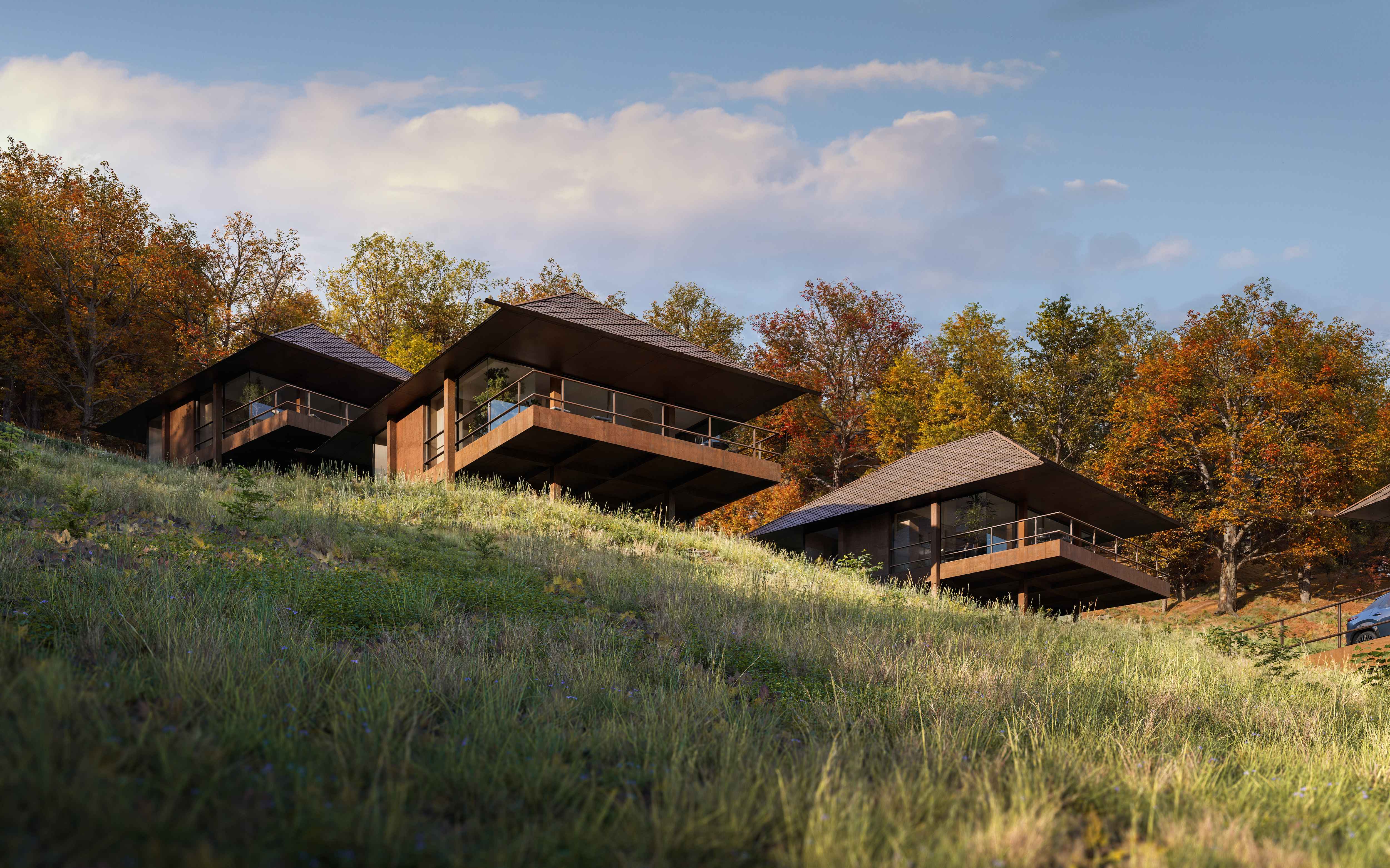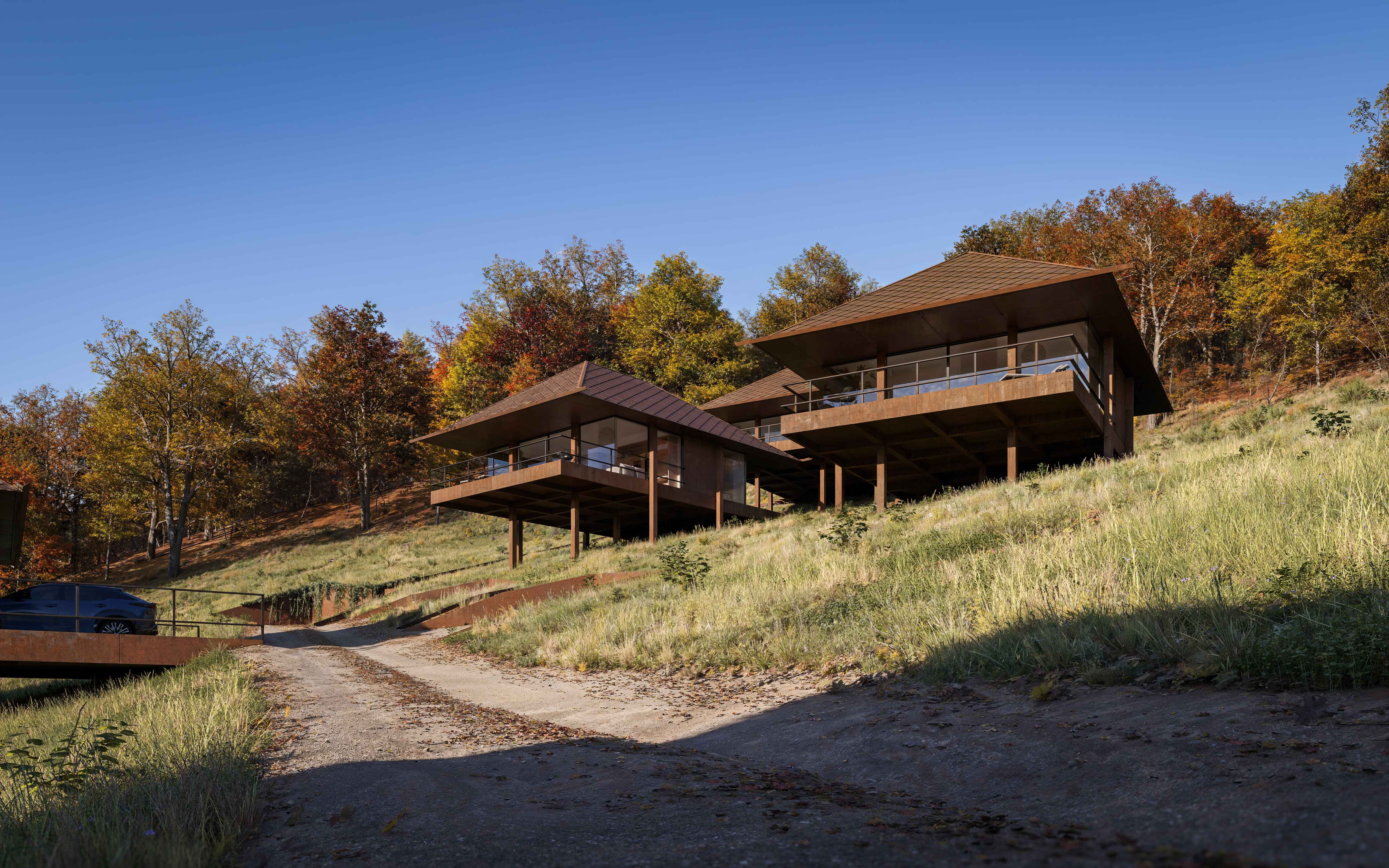 Rdza - materiał przewodni projektu: z zardzewiałej blachy dojścia, elewacje, pokrycie dachowe zespołu pięciu domów wypoczynkowych.